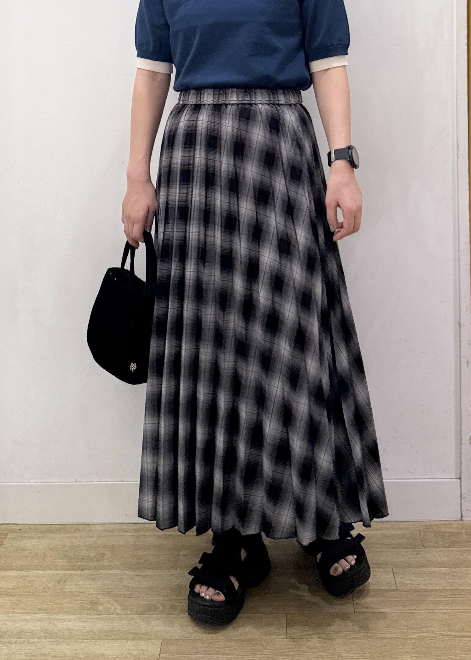 着丈は足首が少し見えるぐらいの長さで、ふんわりとしたフレアシルエットのスカートです。 -