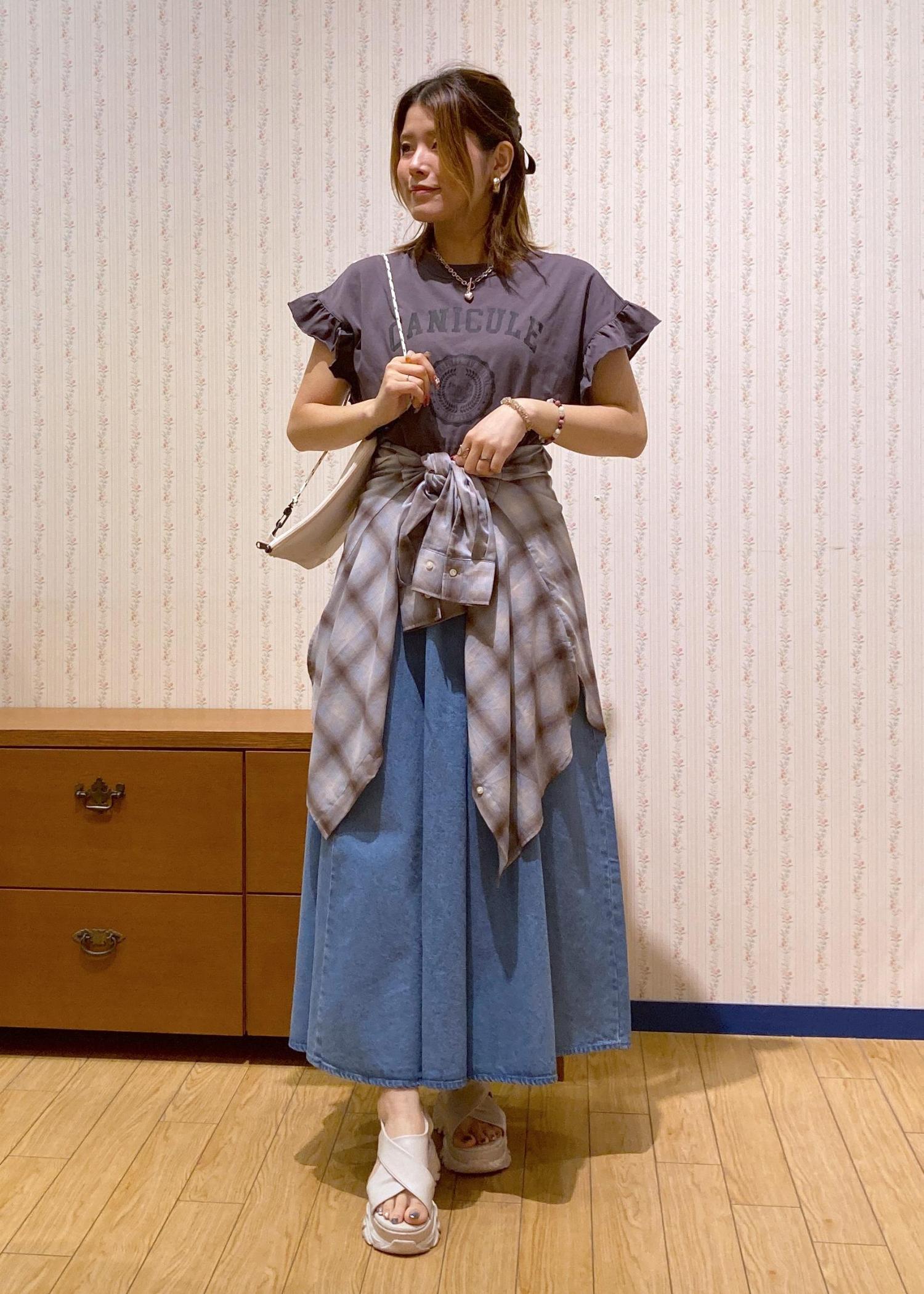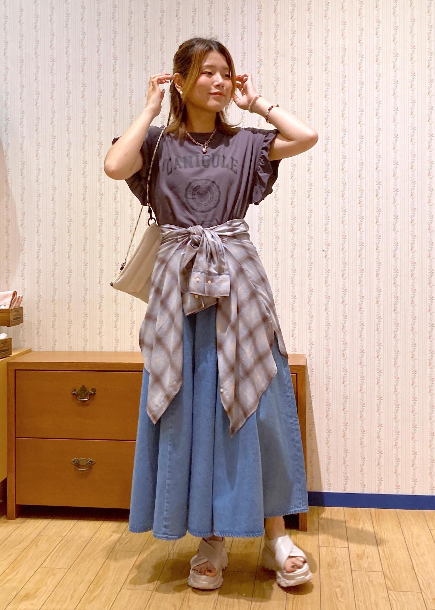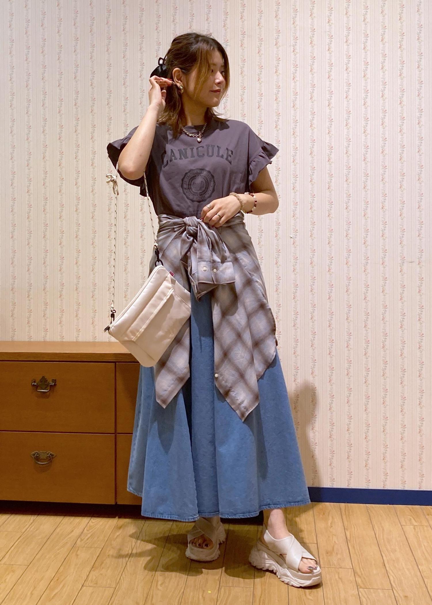 フリル袖のロゴTシャツにフレアスカートを合わせたカジュアルコーディネートです。