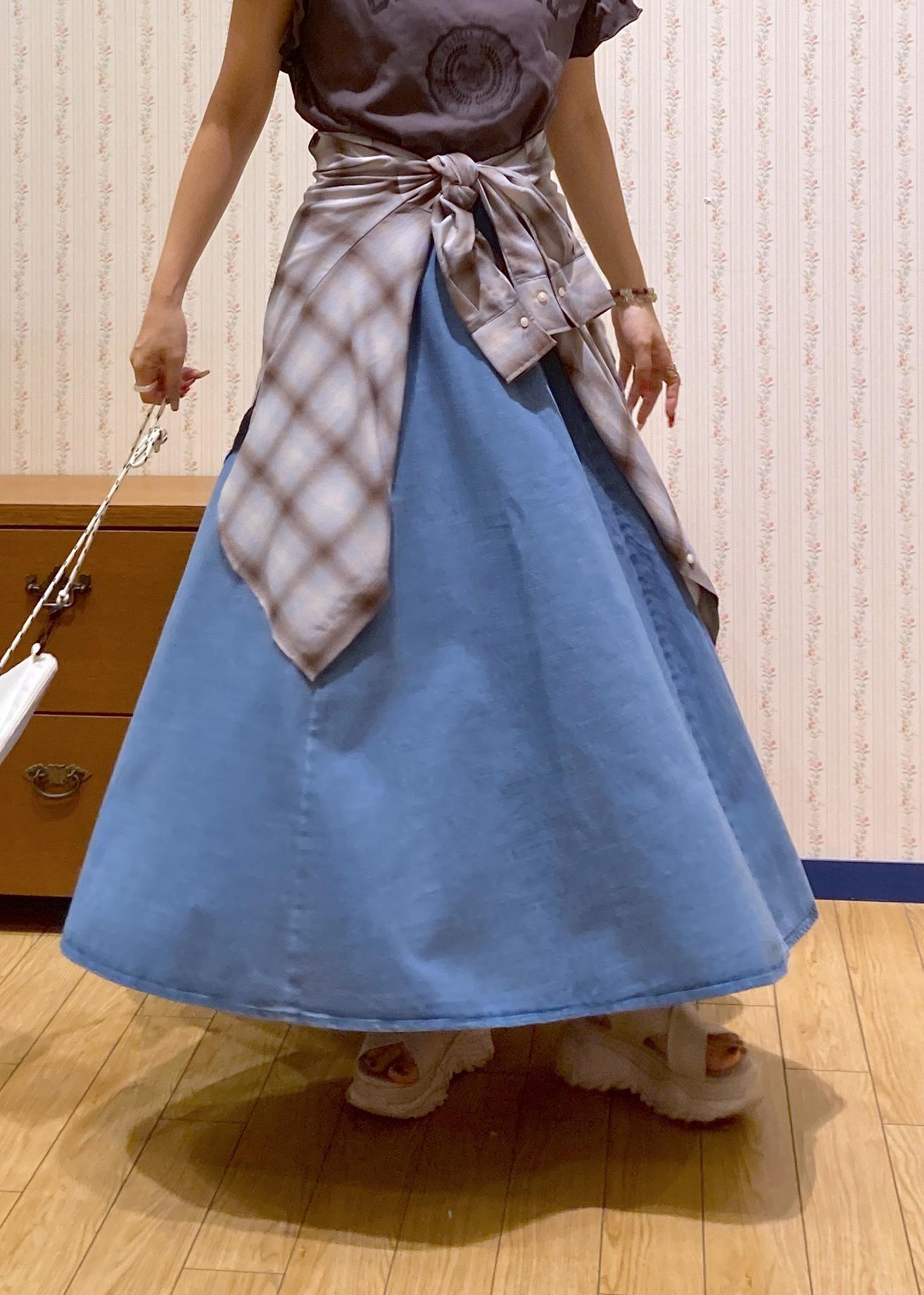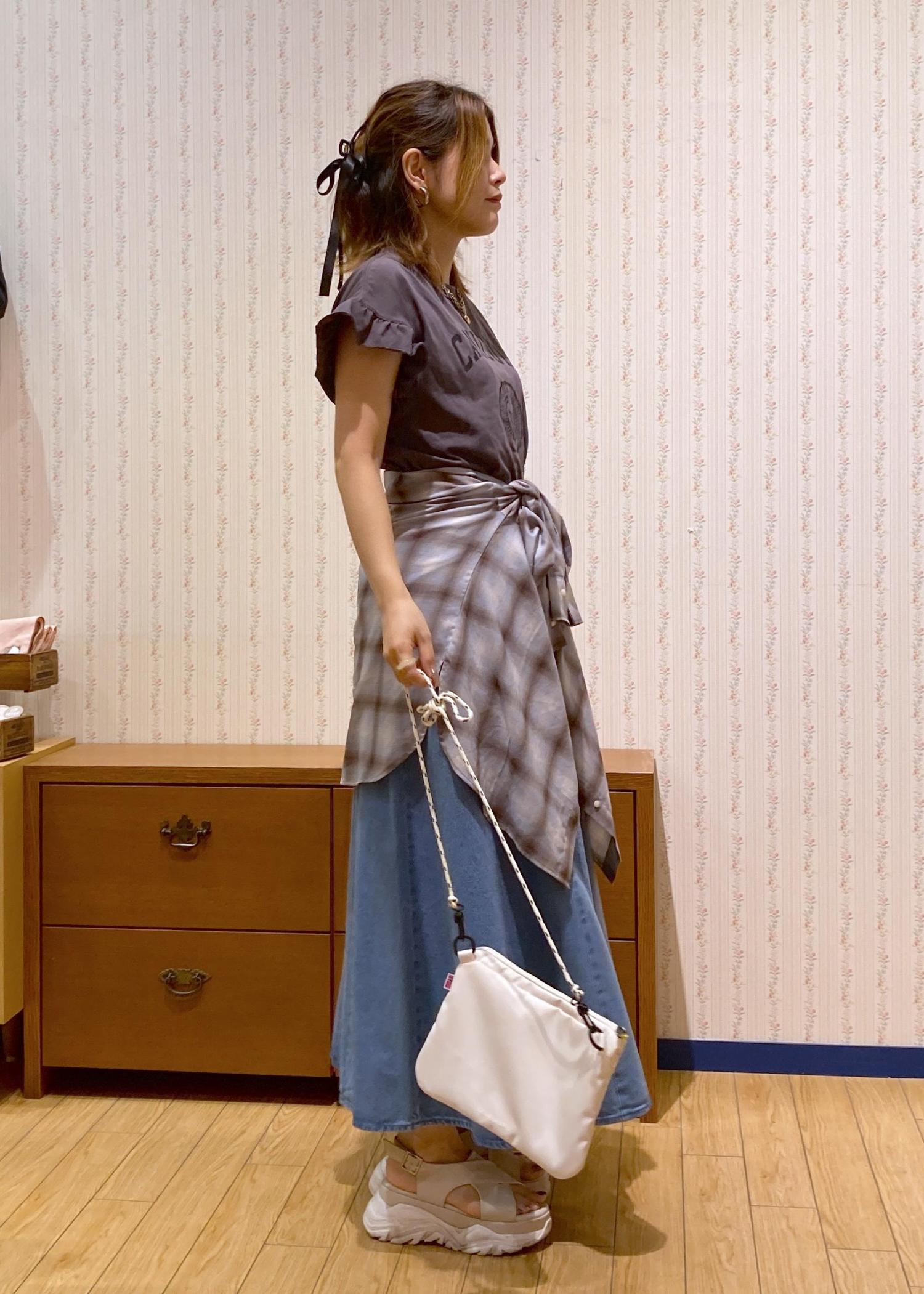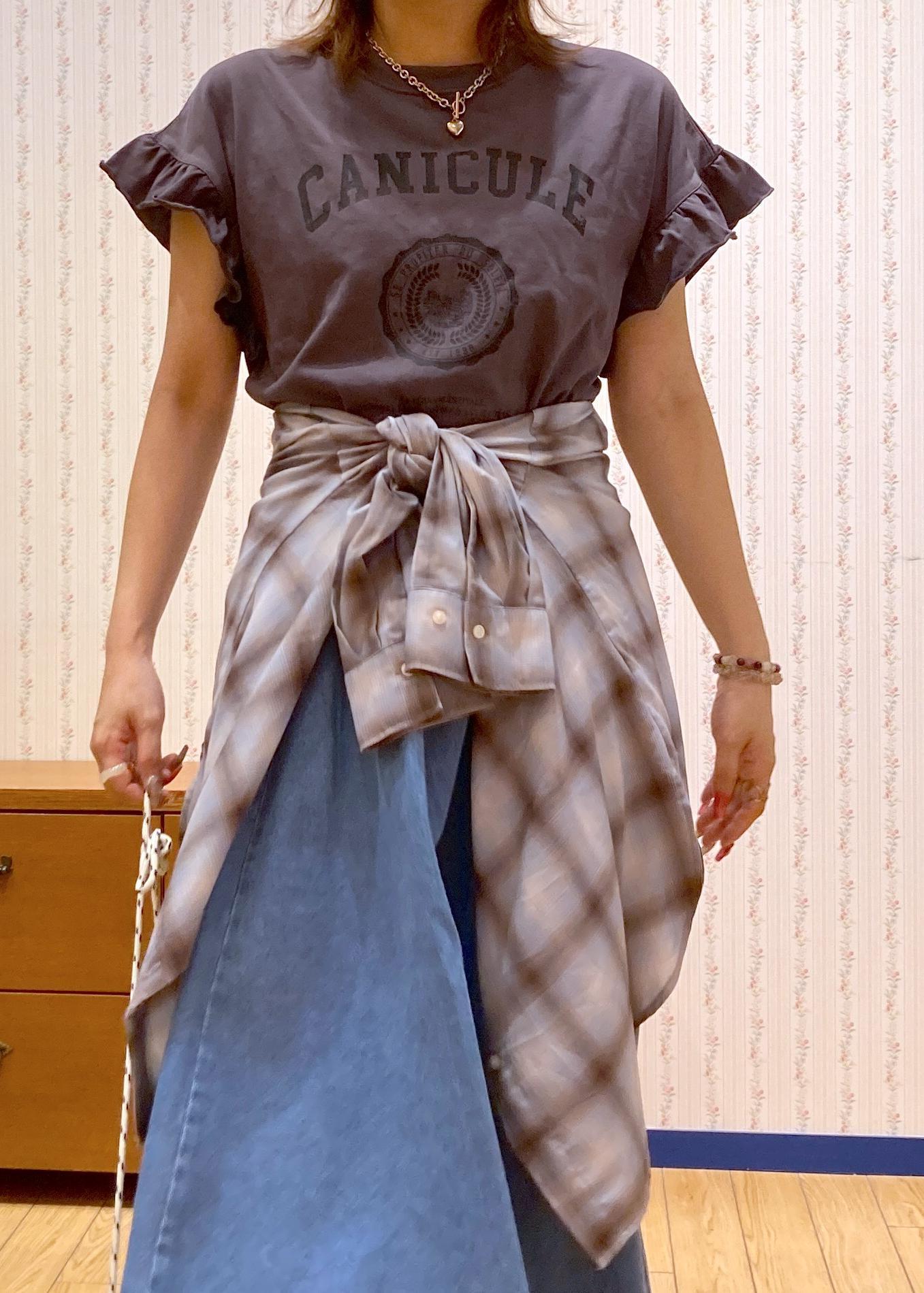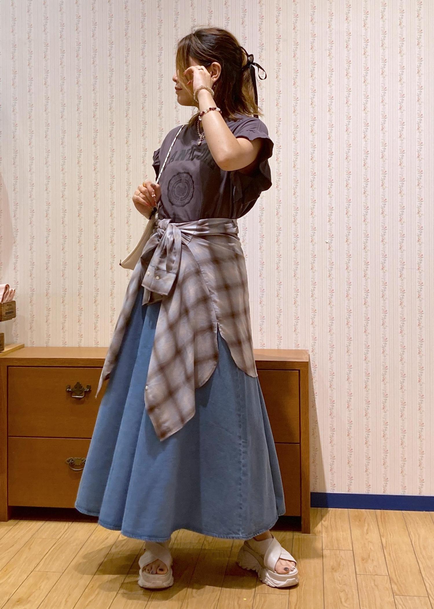 フリル袖のロゴTシャツにフレアスカートを合わせたカジュアルコーディネートです。