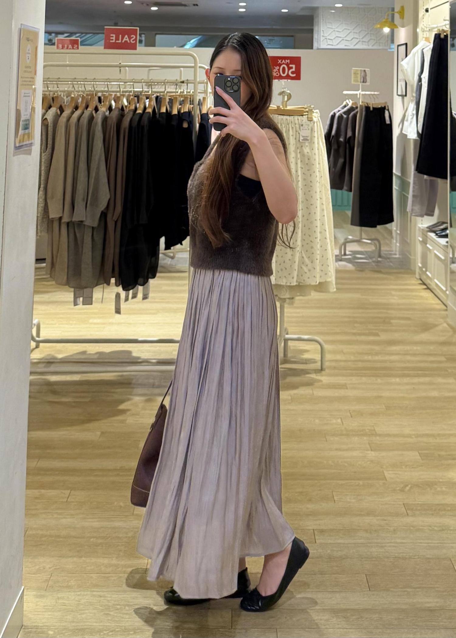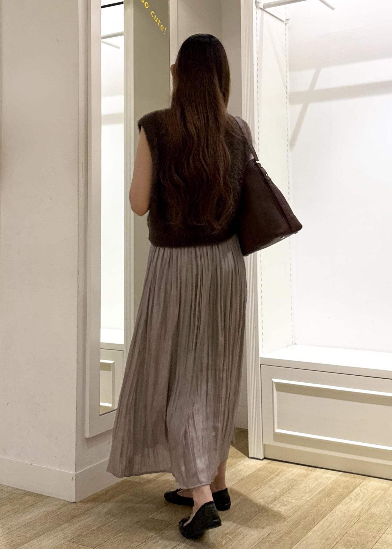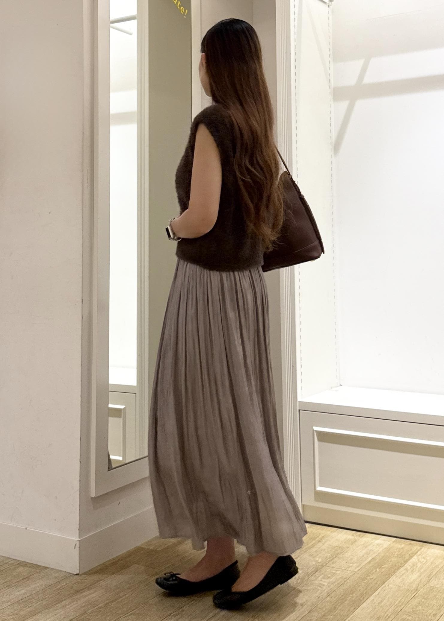 今回はブラウンのニットベストにギャザースカートを合わせてフェミニンコーデにしてみました!