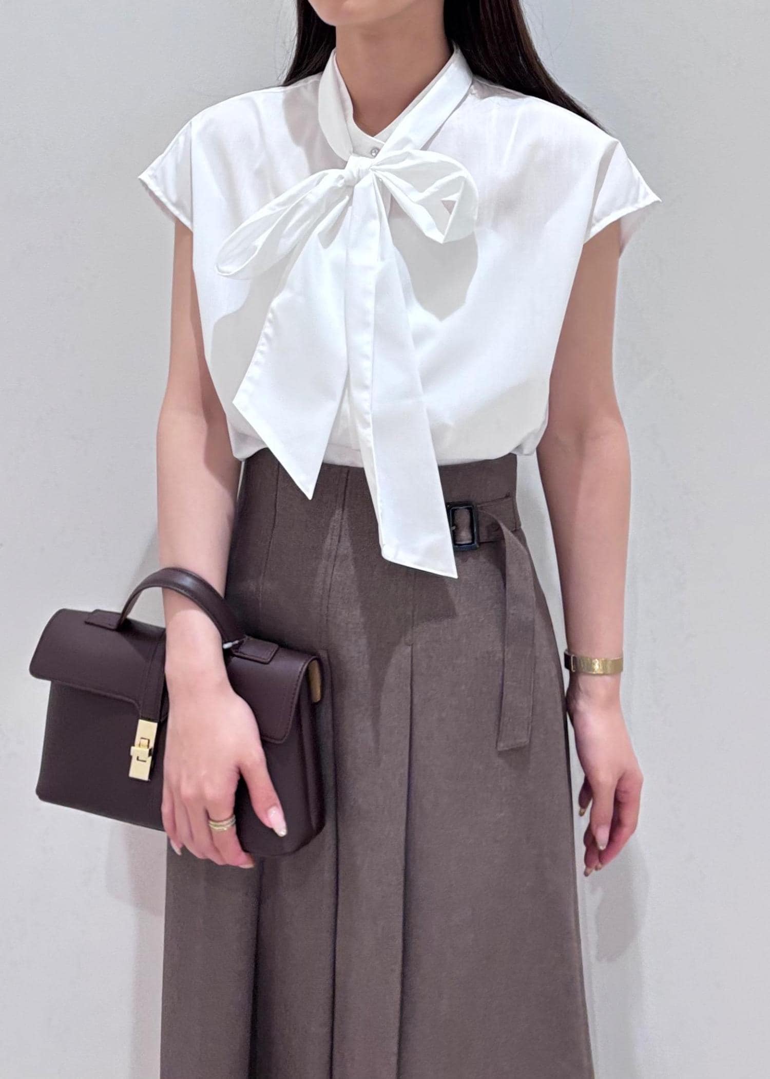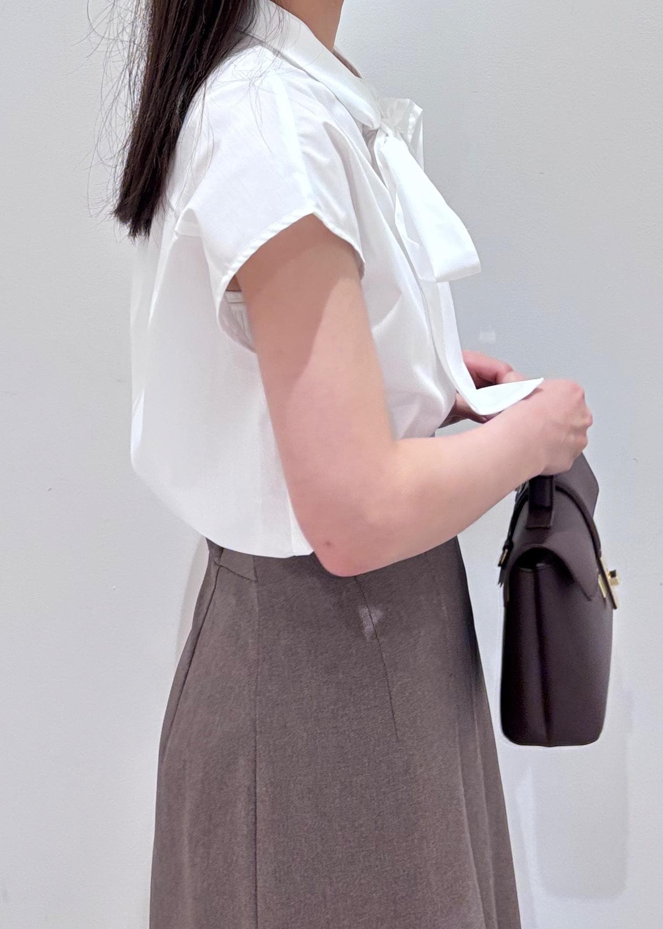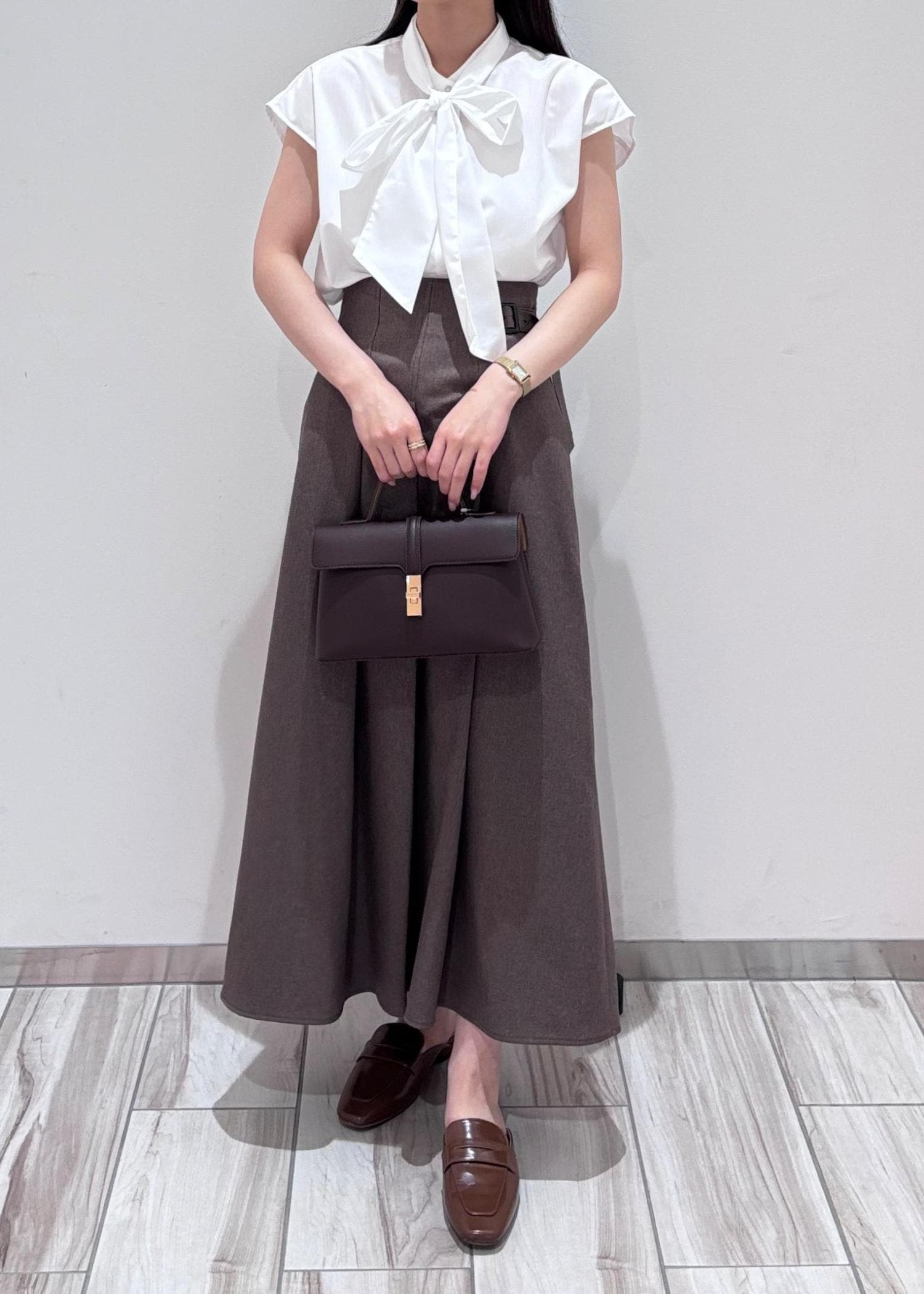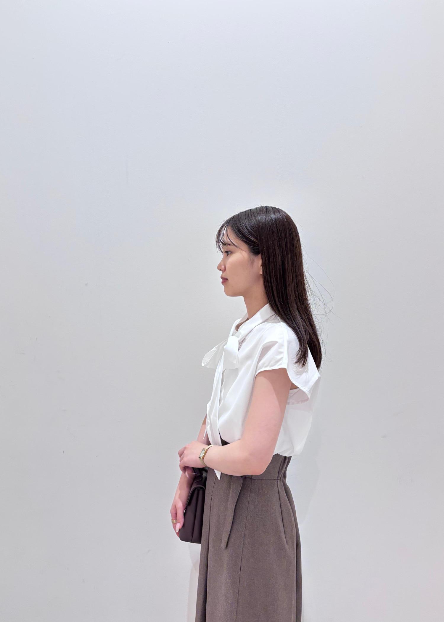 リボンシャツと、ベージュのAラインスカートで品のある綺麗めなコーデにしてみました。足元はかかとのないローファー風な靴できちんと感と抜け感を意識してみました。