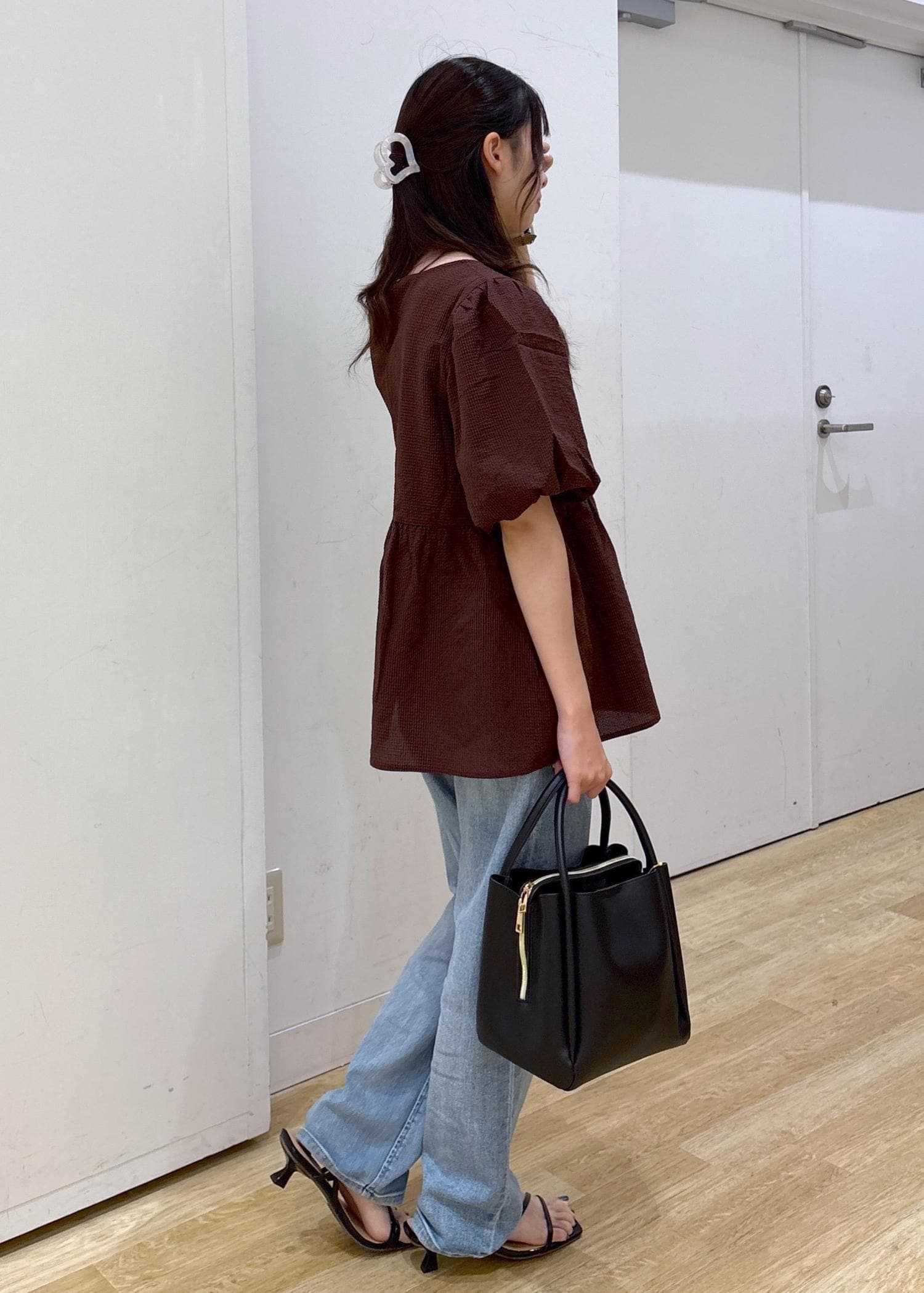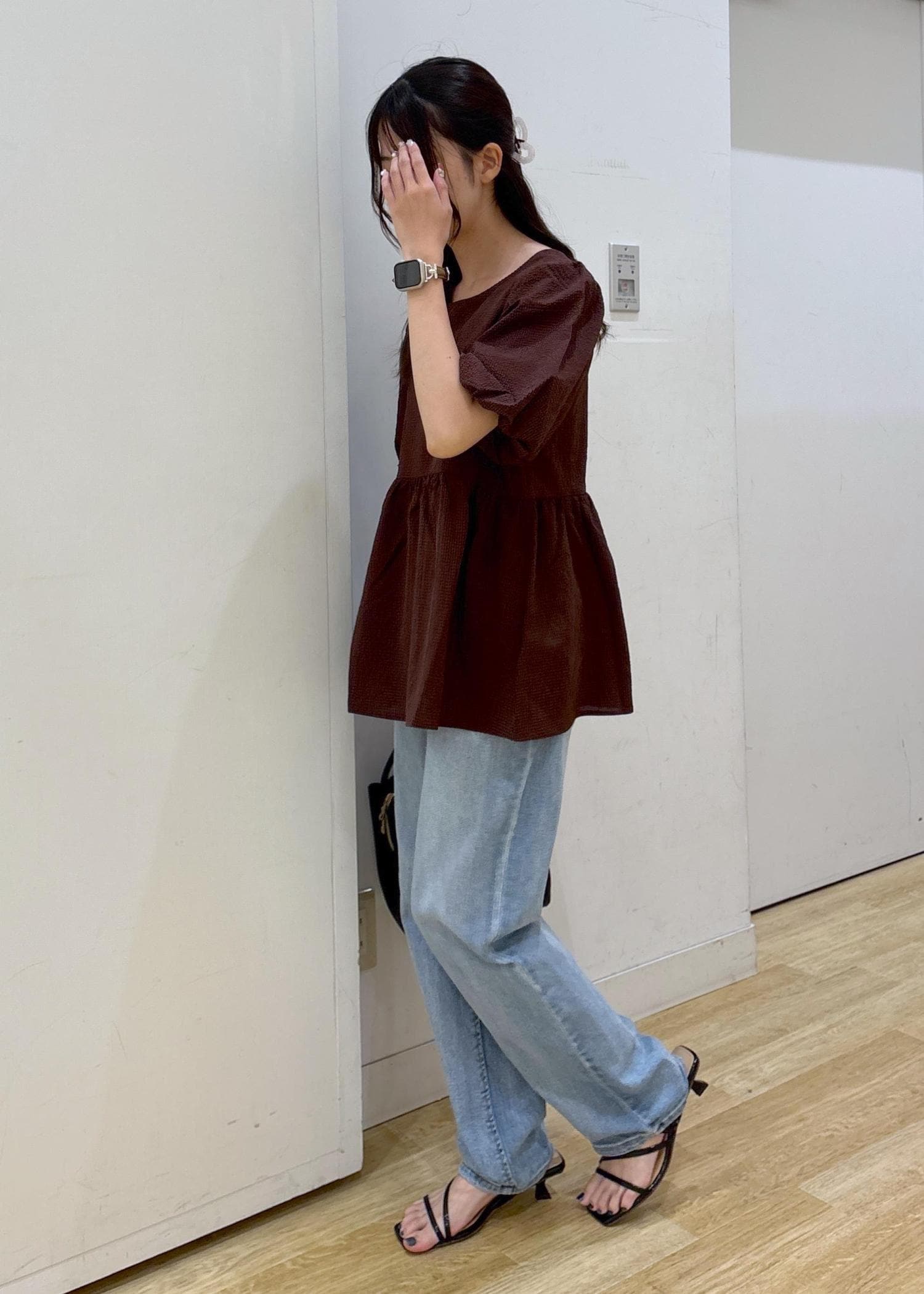 ブラウスがふんわりとしたシルエットなので、ボトムはすっきりとしたテーパードパンツやタイトスカートなど合わせるとバランス良く着用できます◎