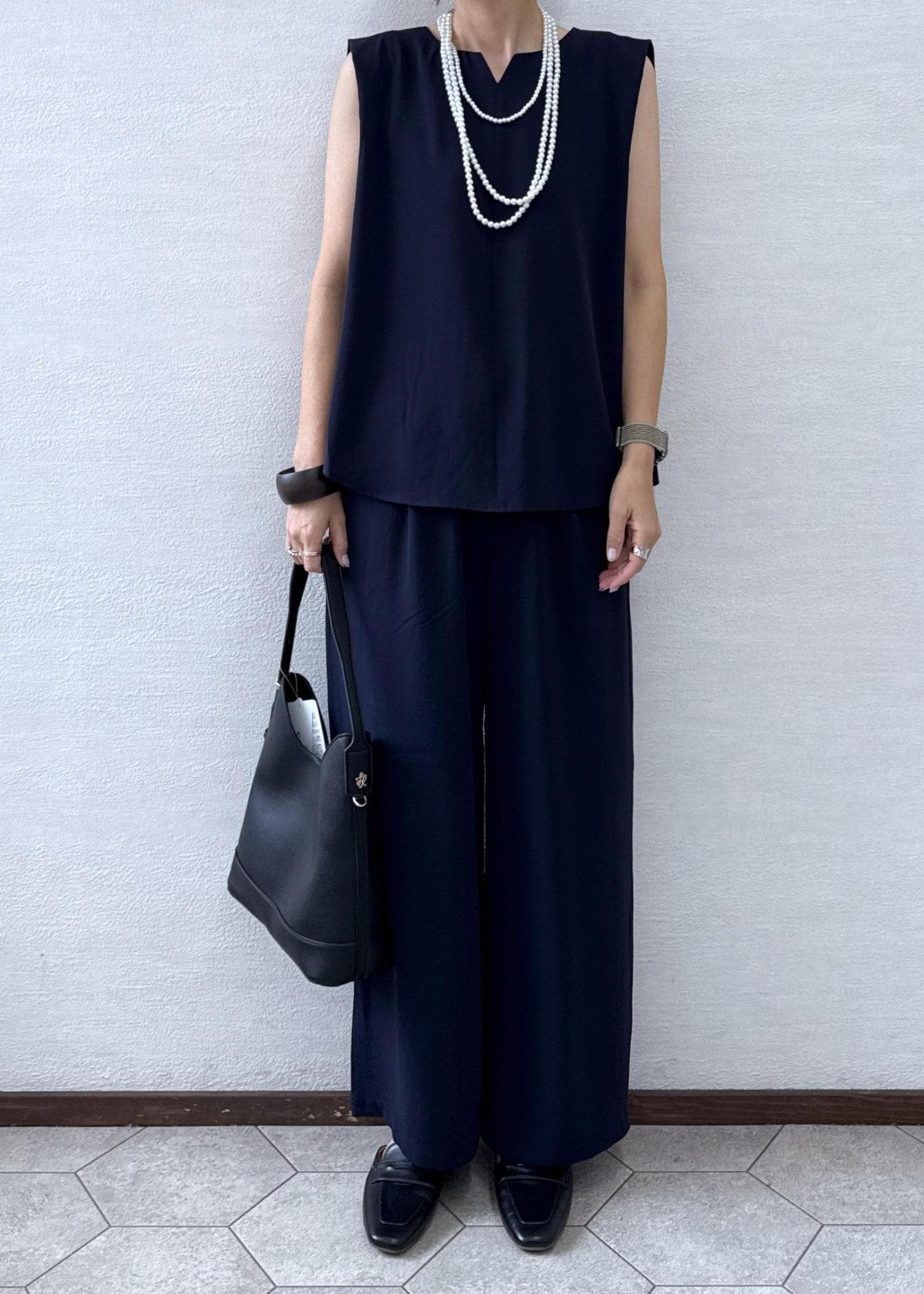落ち感のある柔らかい素材で、ゆったりしていますが着膨れもせずラインはスッキリとても綺麗です。 -