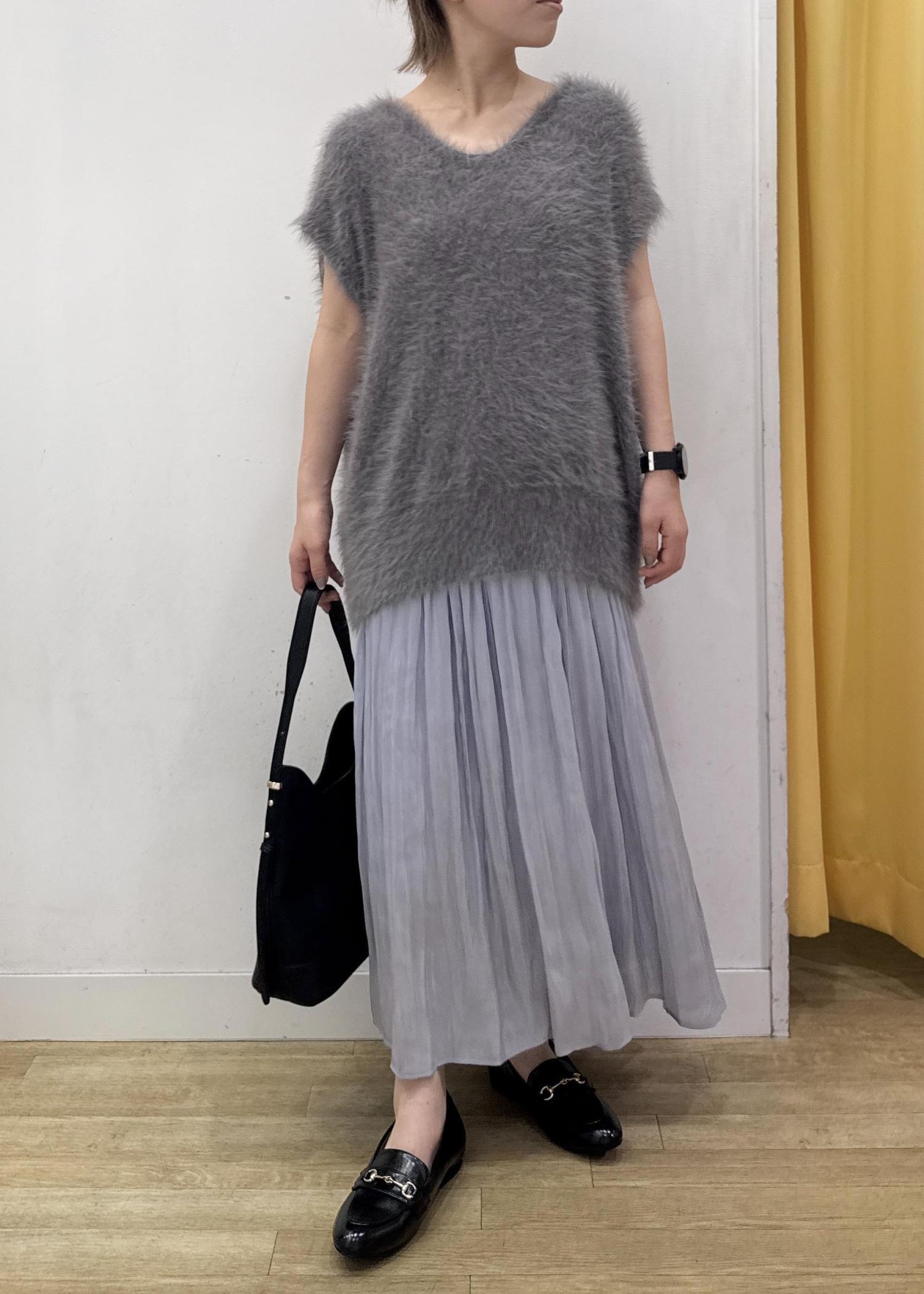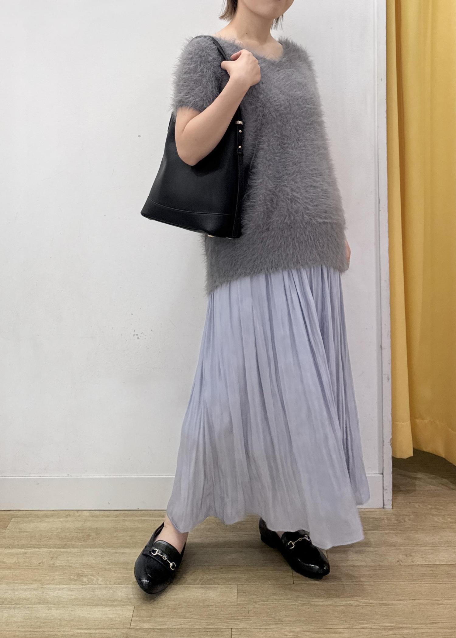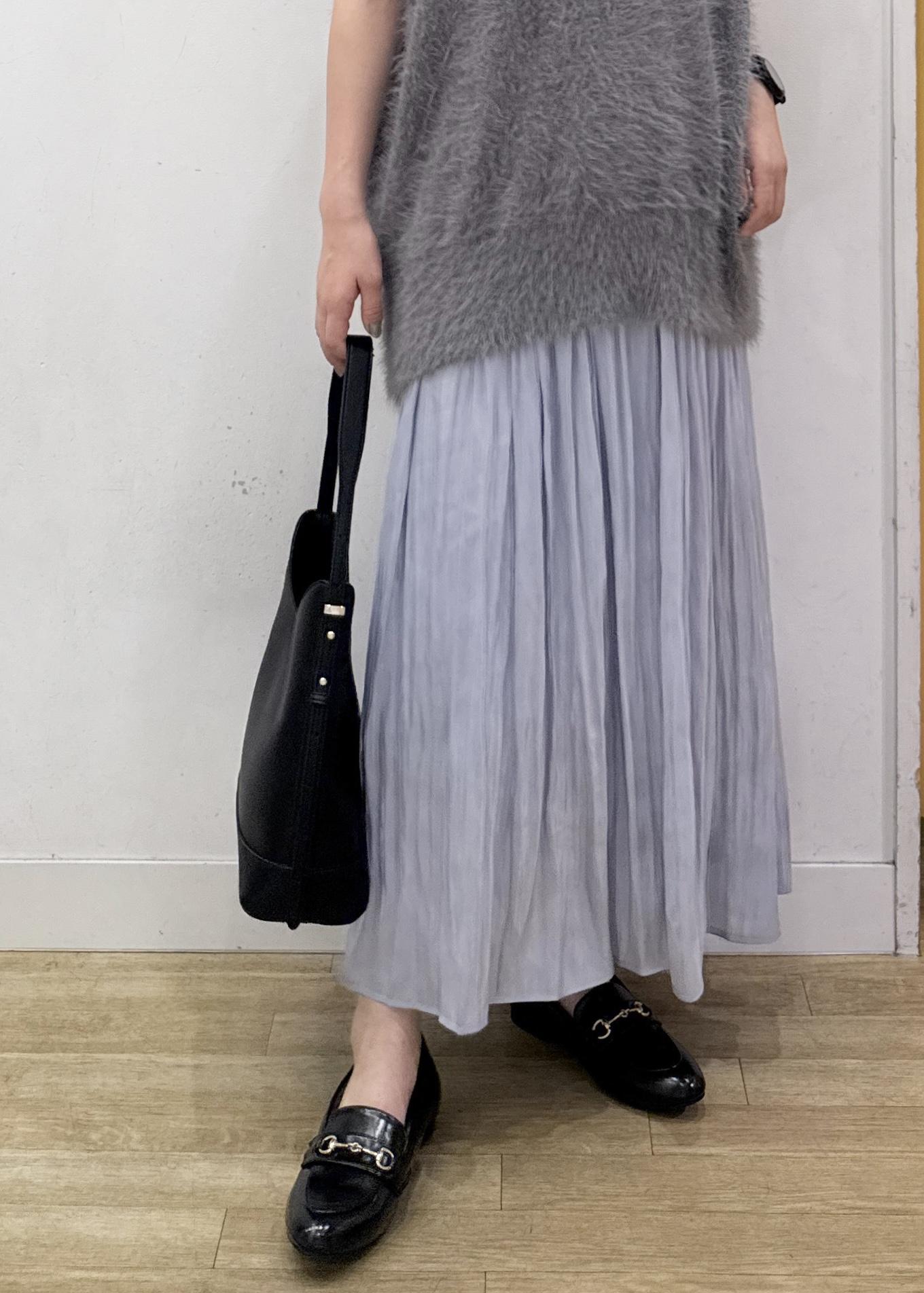 少し光沢のあるプリーツスカートを合わせて、軽さを出せば今から秋まで着られるコーディネートに☺︎