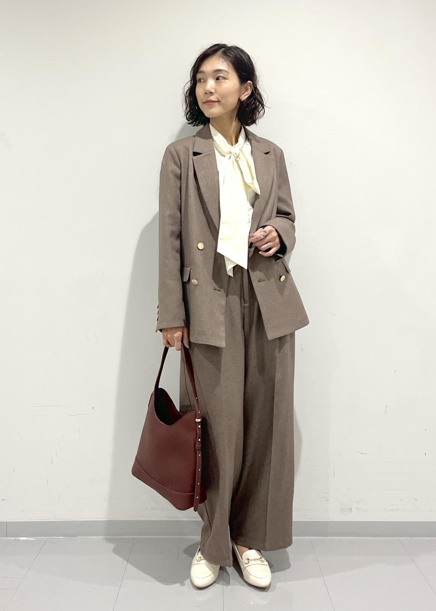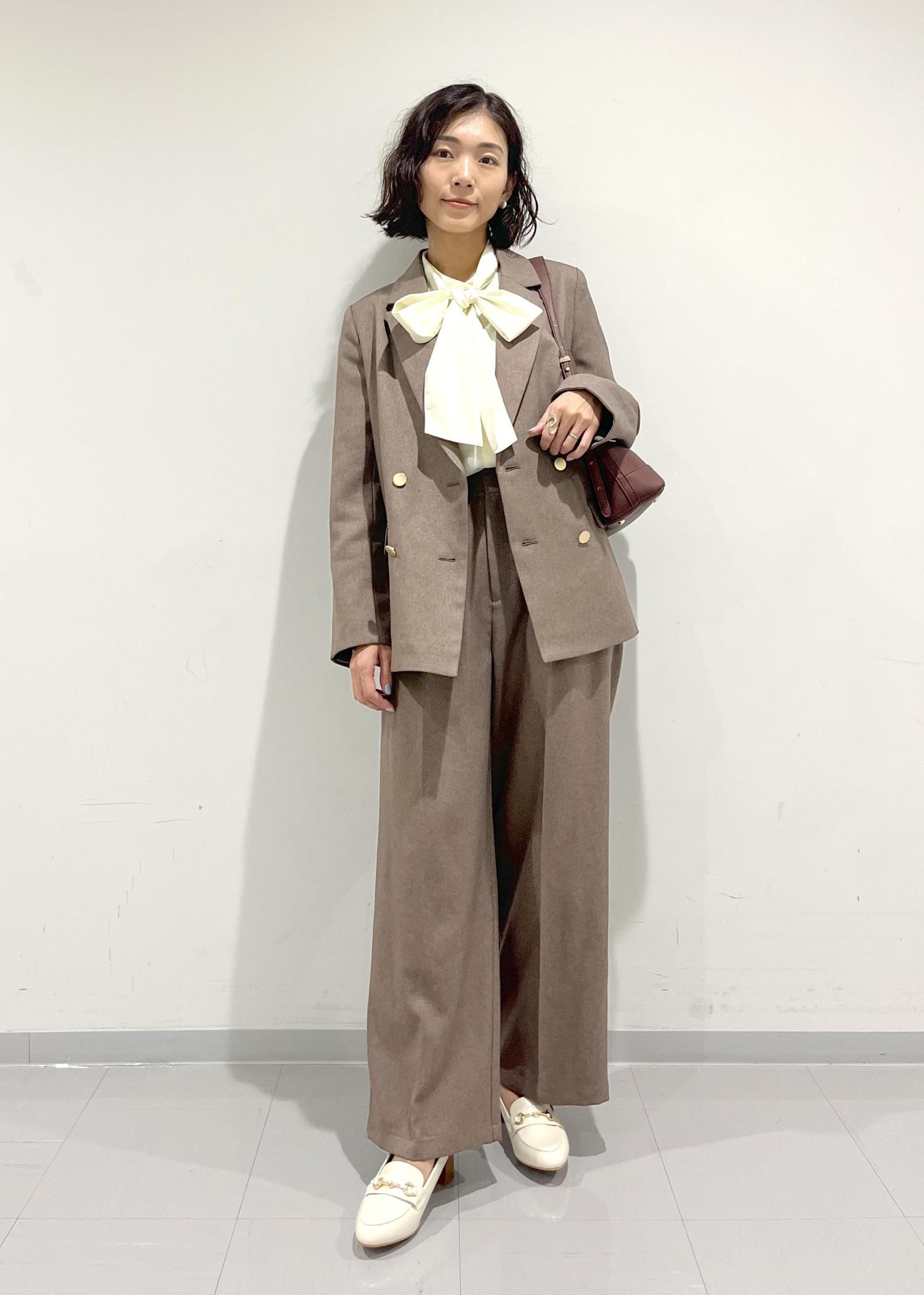 インナーを目を引くリボンブラウスにしたり、セットアップの色味をライトブラウンにすることで、ハンサムな中にもレディな印象をプラスすることができます。