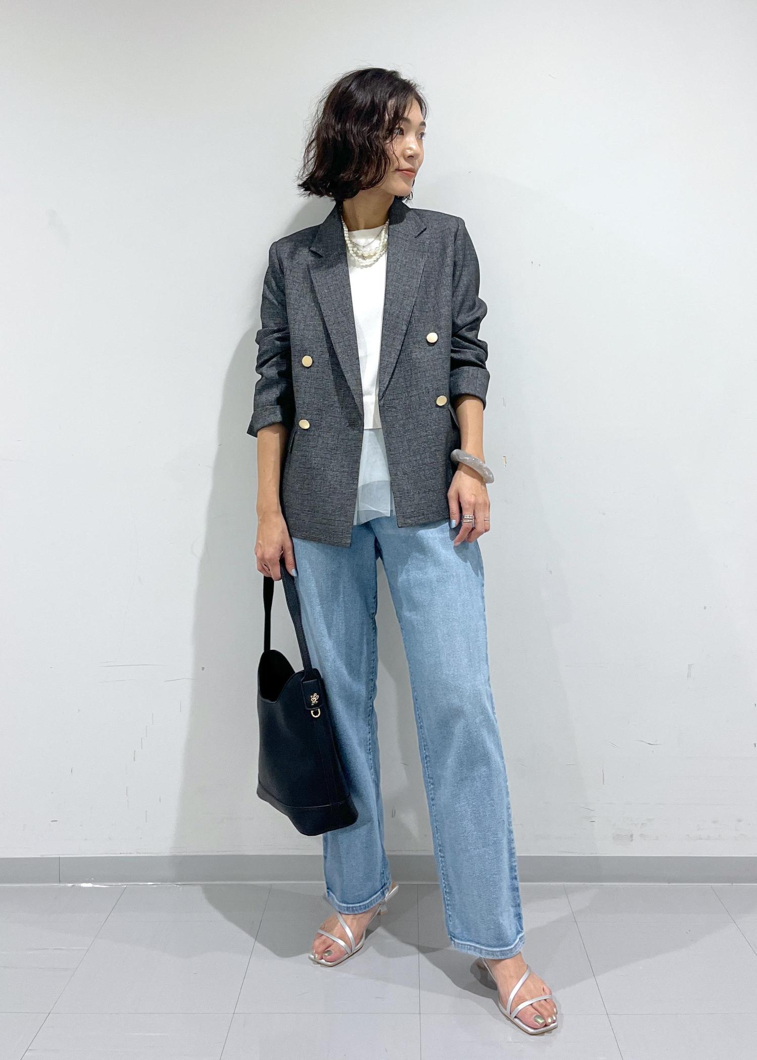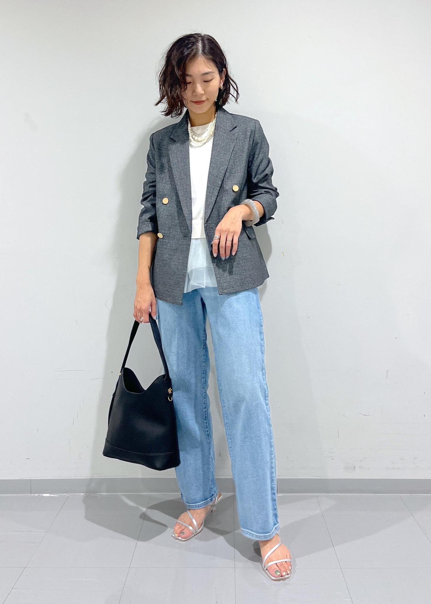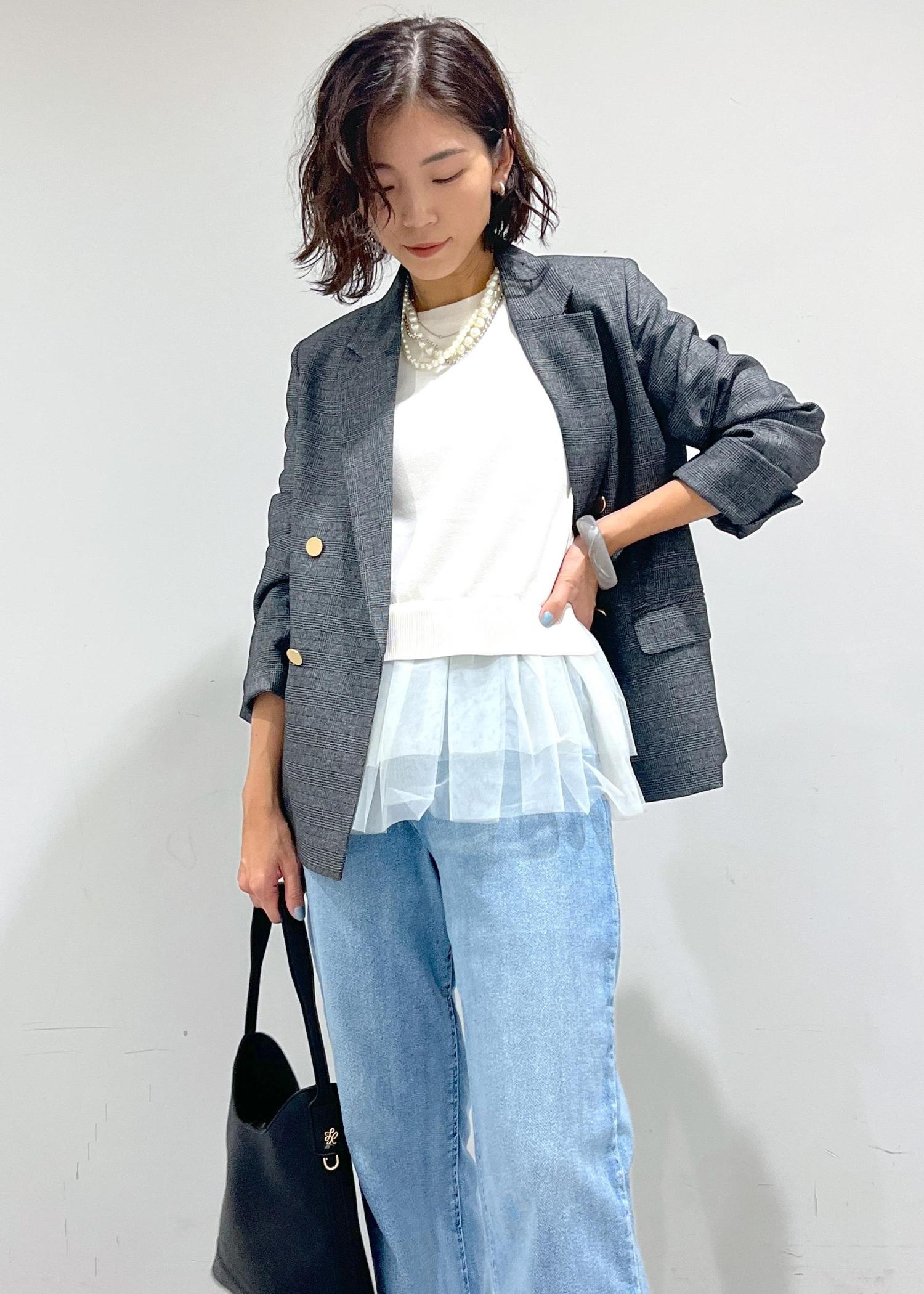 ジャケットの裾から覗くチュールとストラップサンダルが軽さを出してくれるので、まだ暑さの残る初秋におすすめのコーディネートです。