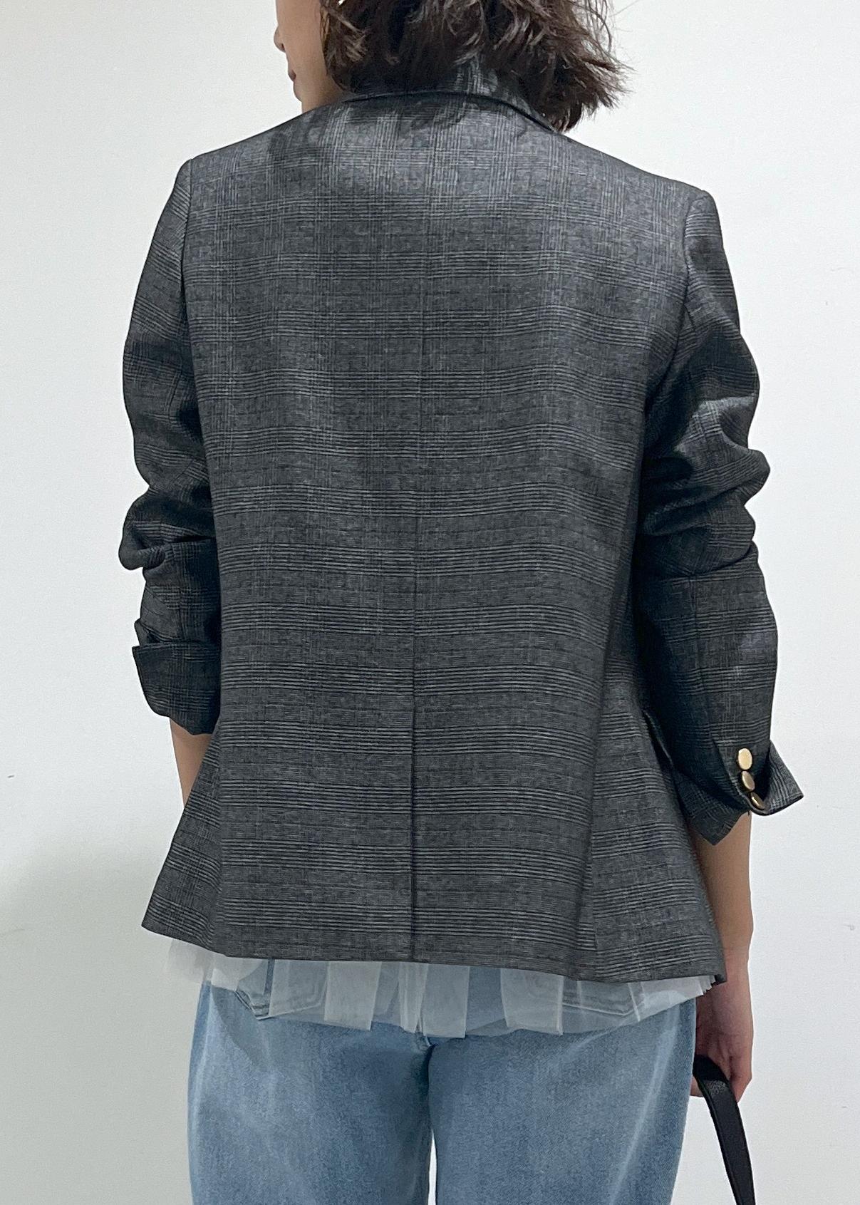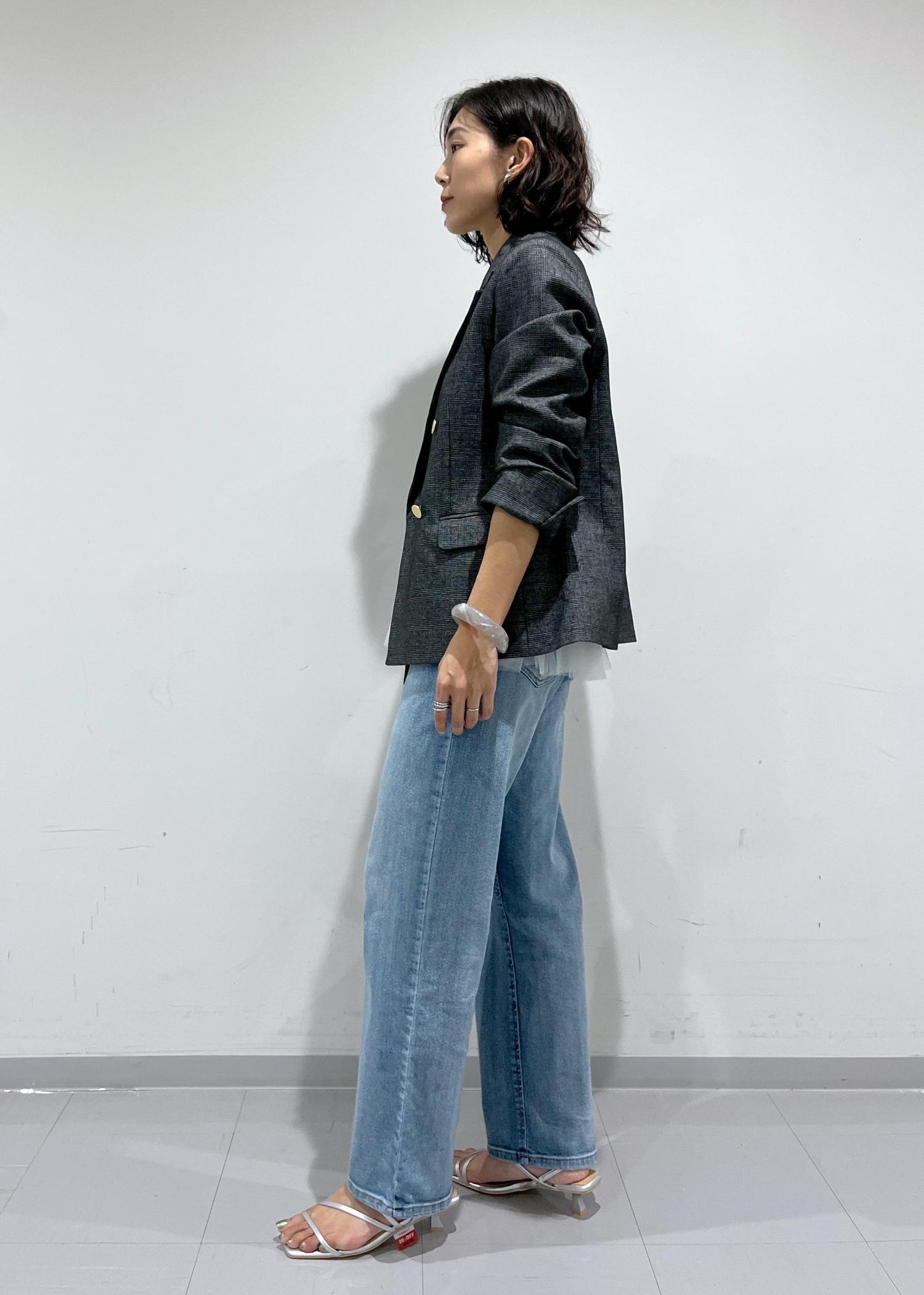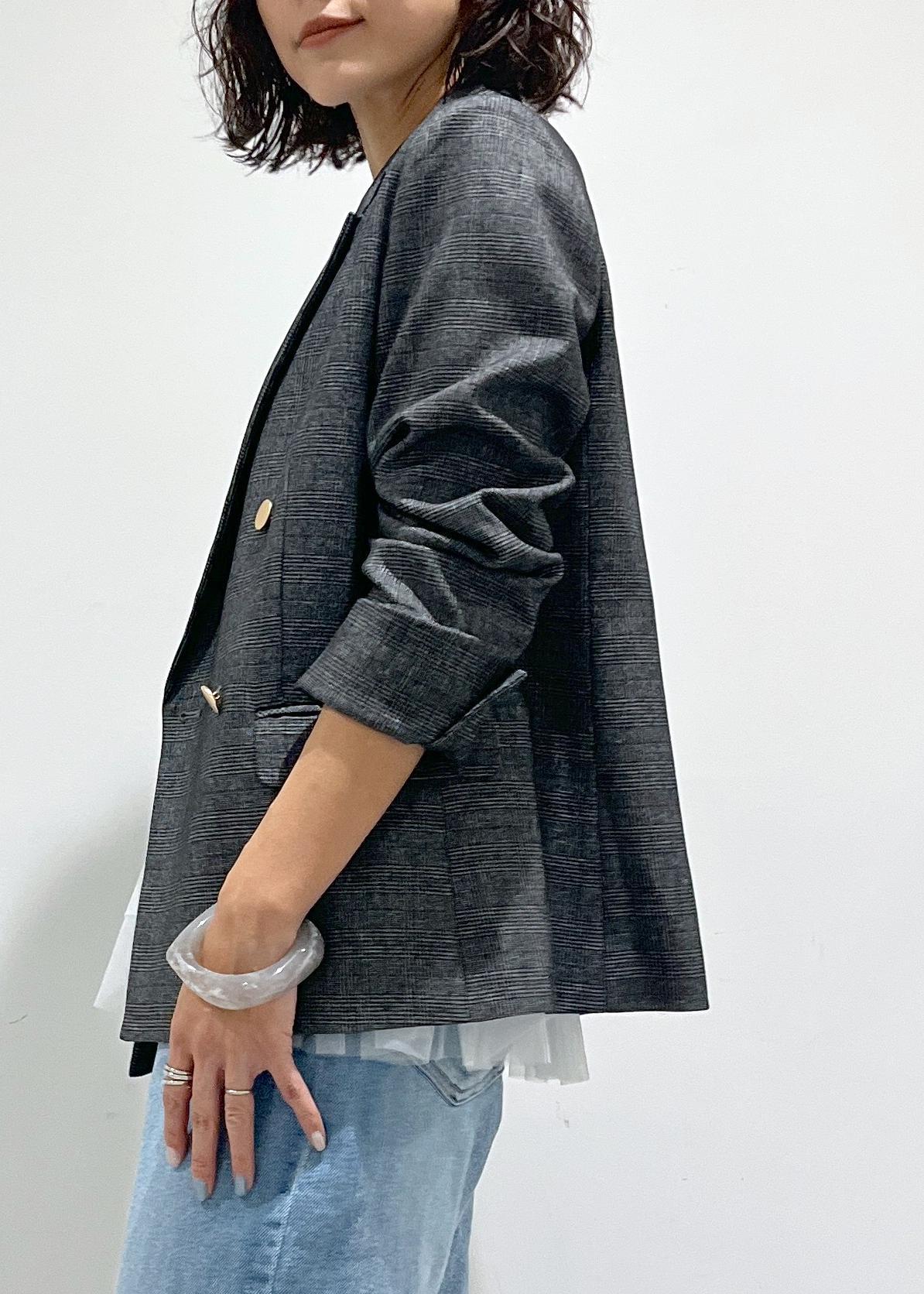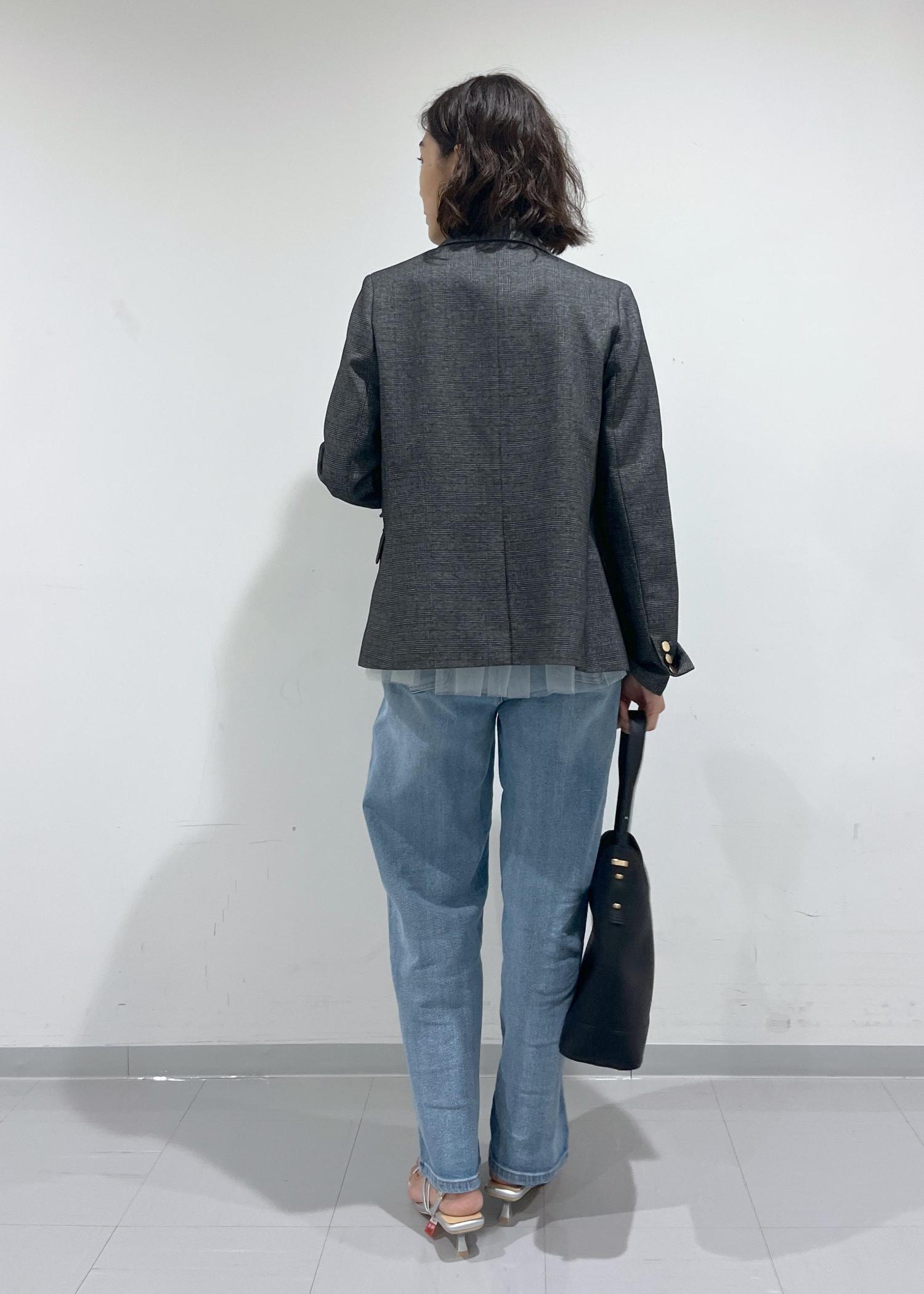 ジャケットの裾から覗くチュールとストラップサンダルが軽さを出してくれるので、まだ暑さの残る初秋におすすめのコーディネートです。