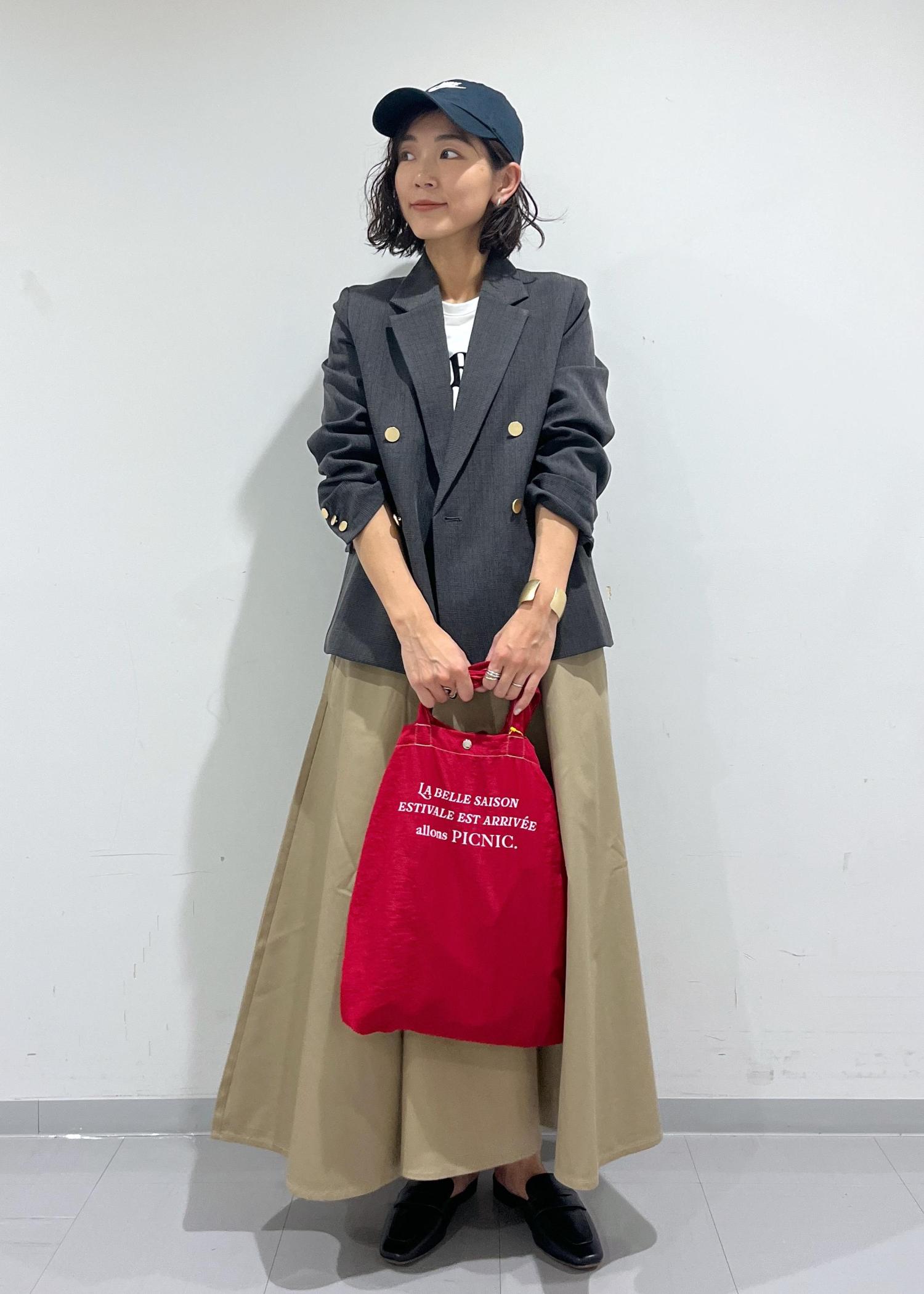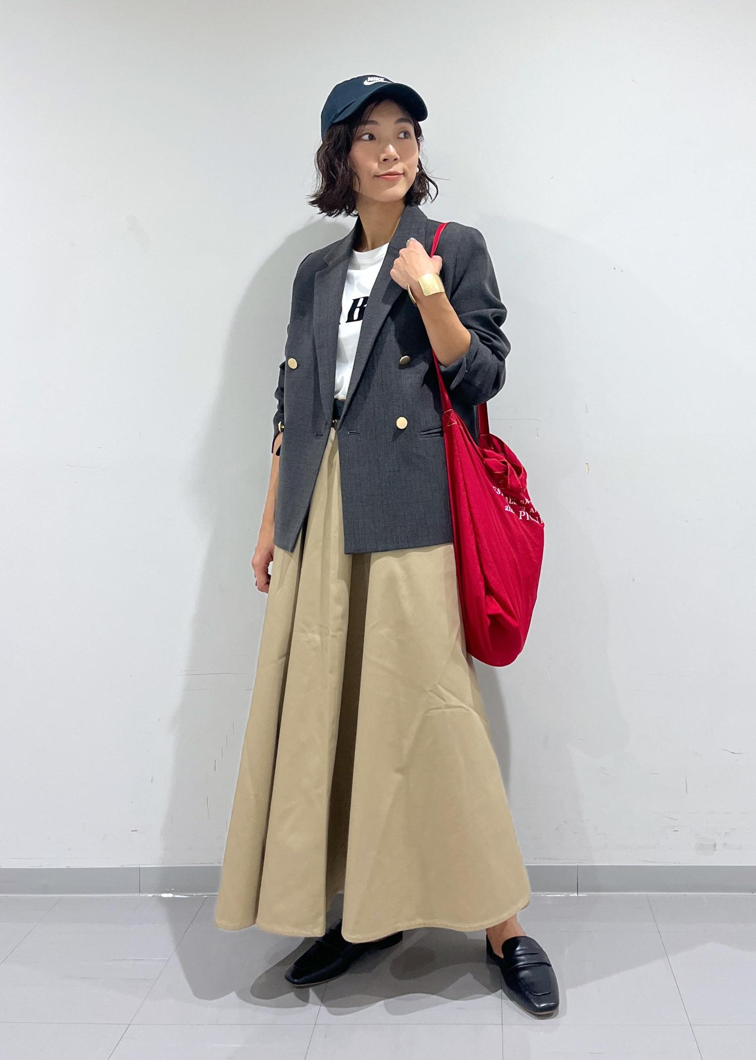 大きめのロゴが覗くTシャツと赤いバッグもいいアクセントになってくれています。