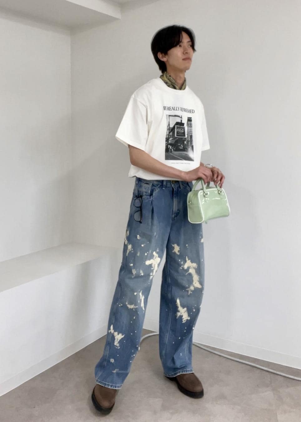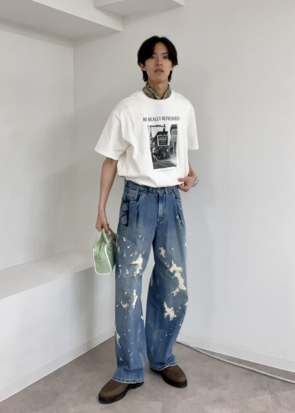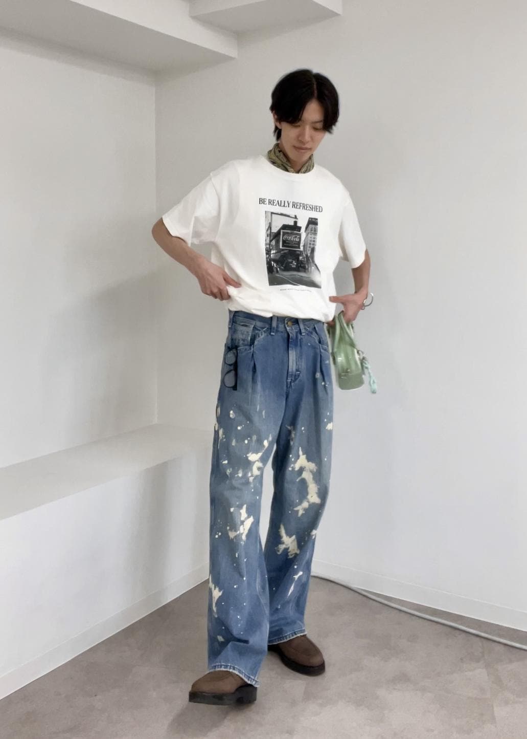 カジュアルながらもこだわりが感じられる今っぽいストリートスタイル。Tシャツはリラックス感があり、加工デニムやスカーフ使いで個性も表現しました!