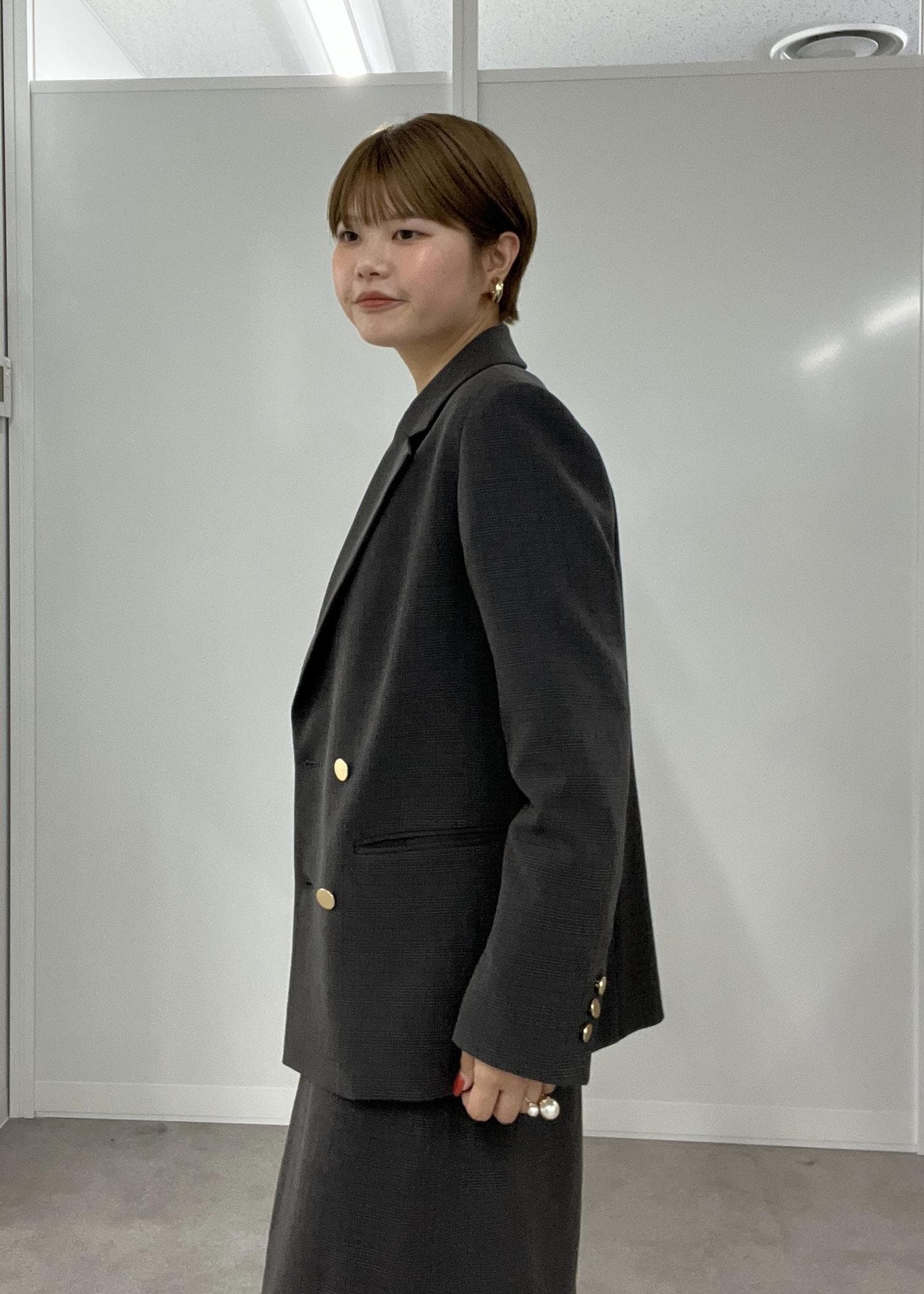 ジャケットは敢えての肩がけで女性らしい雰囲気に。