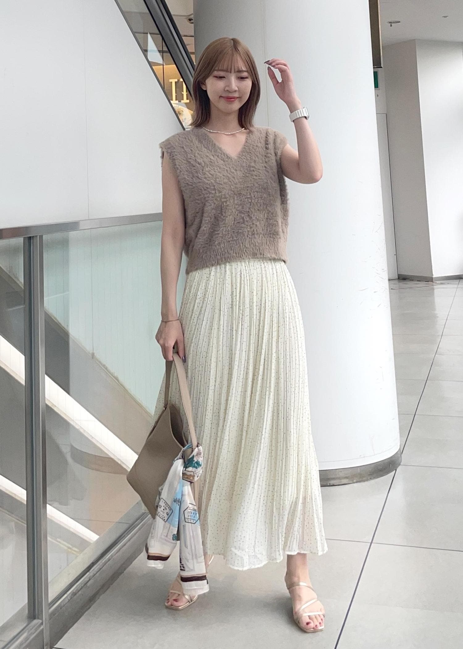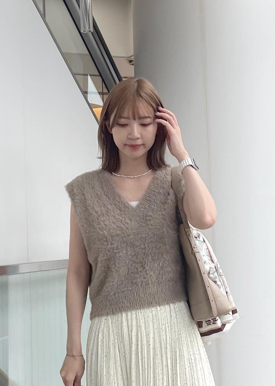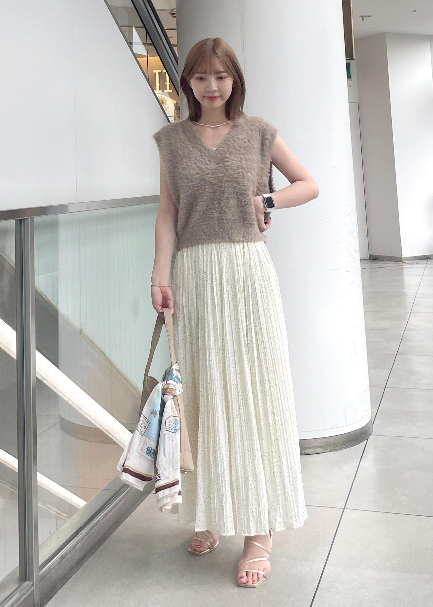 ふわふわなフェザーニットで、フェミニンな秋先取りスタイルにしました。柔らかな色合いなので優しい印象でお召しいただけます。