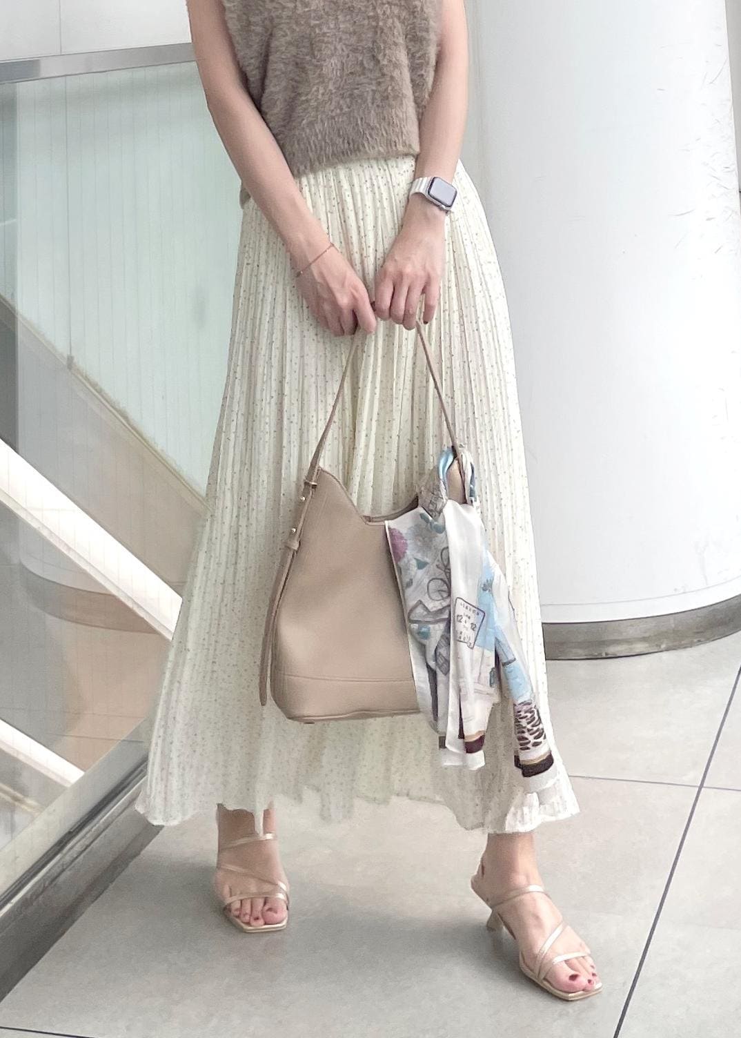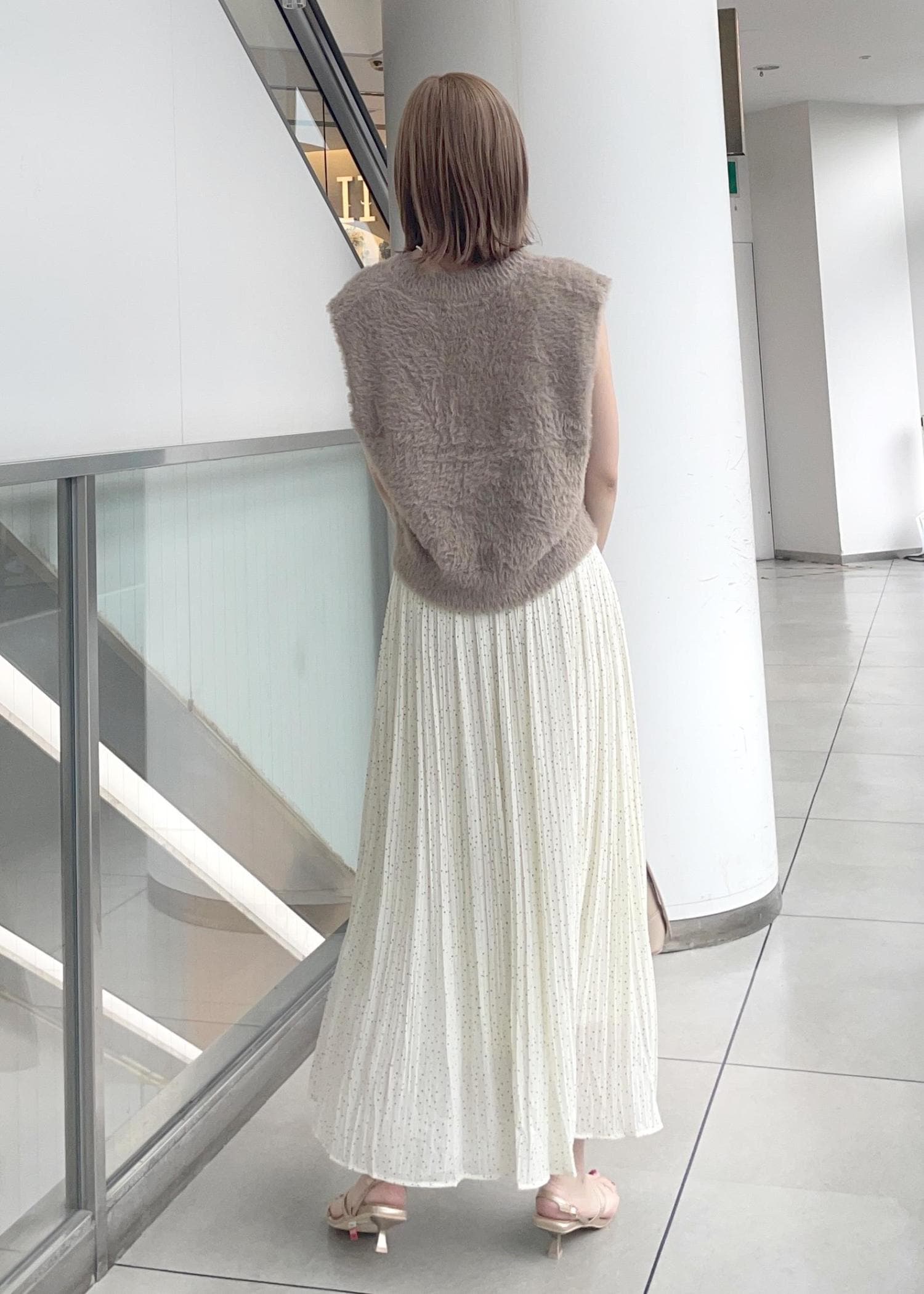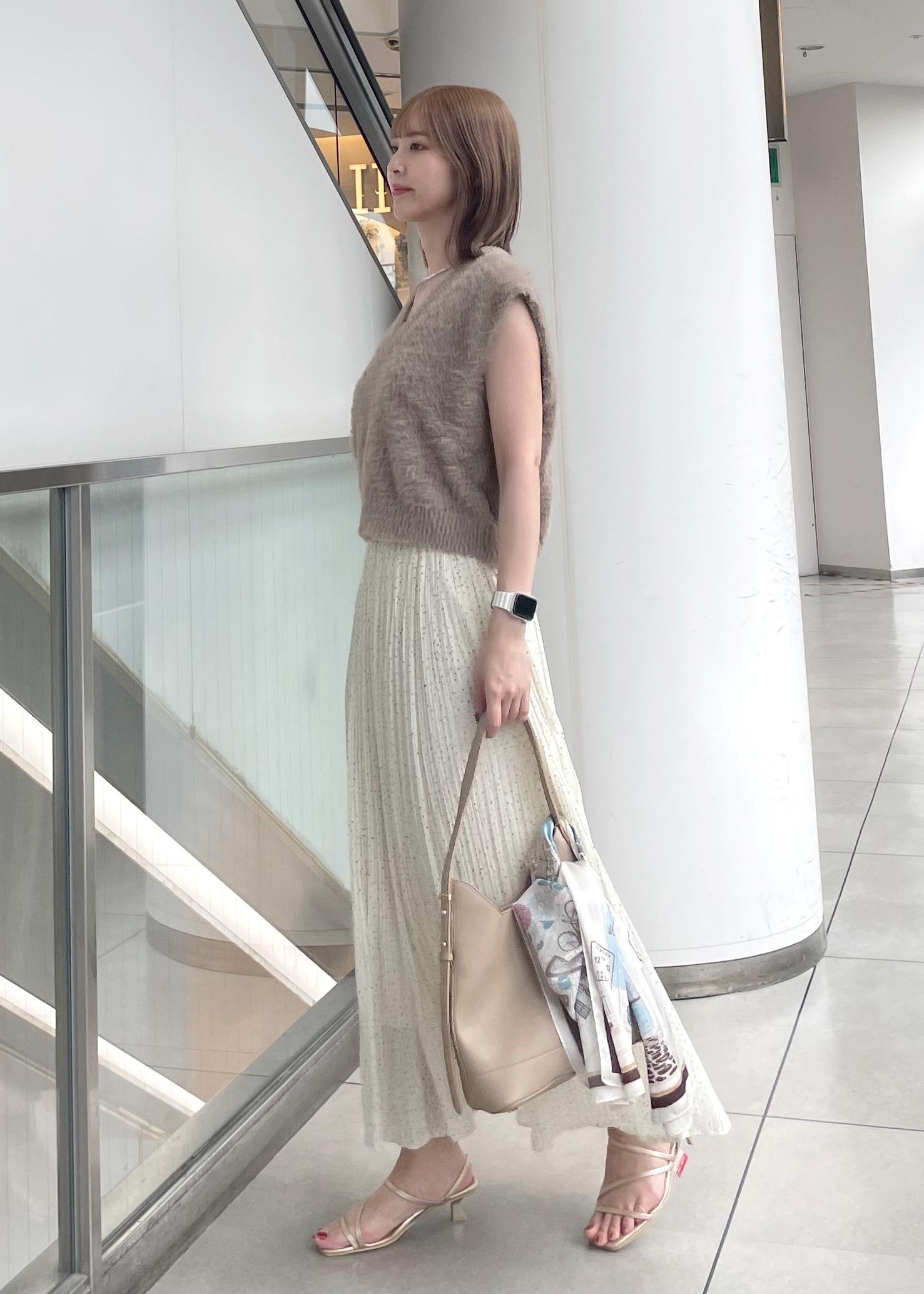 ふわふわなフェザーニットで、フェミニンな秋先取りスタイルにしました。柔らかな色合いなので優しい印象でお召しいただけます。