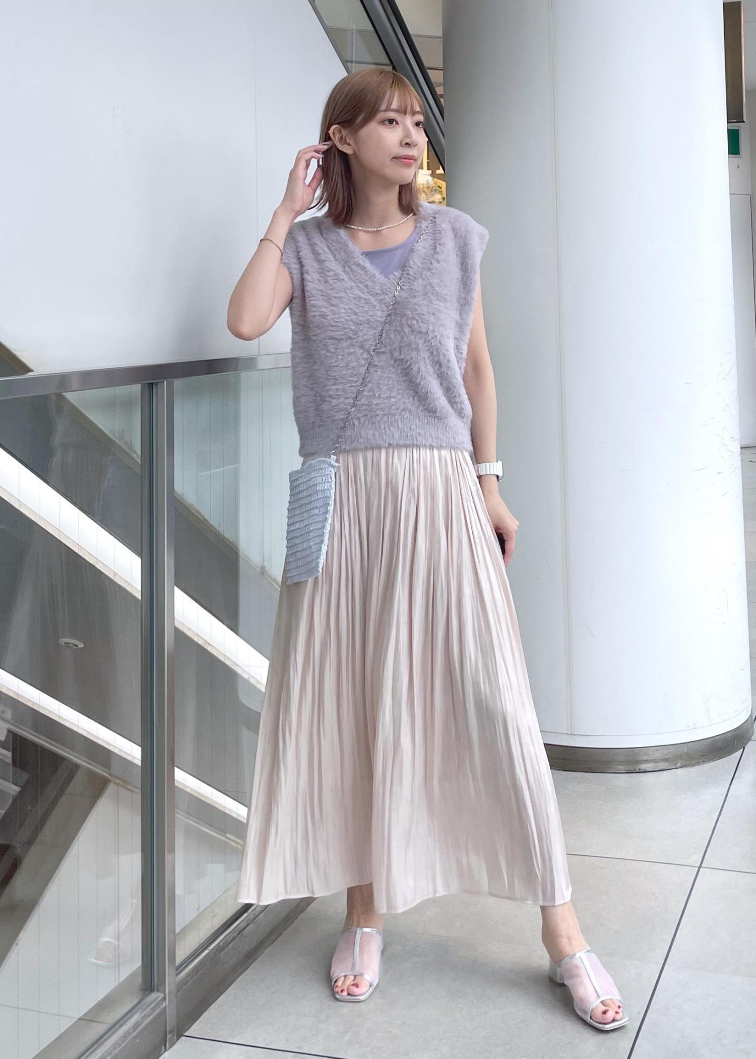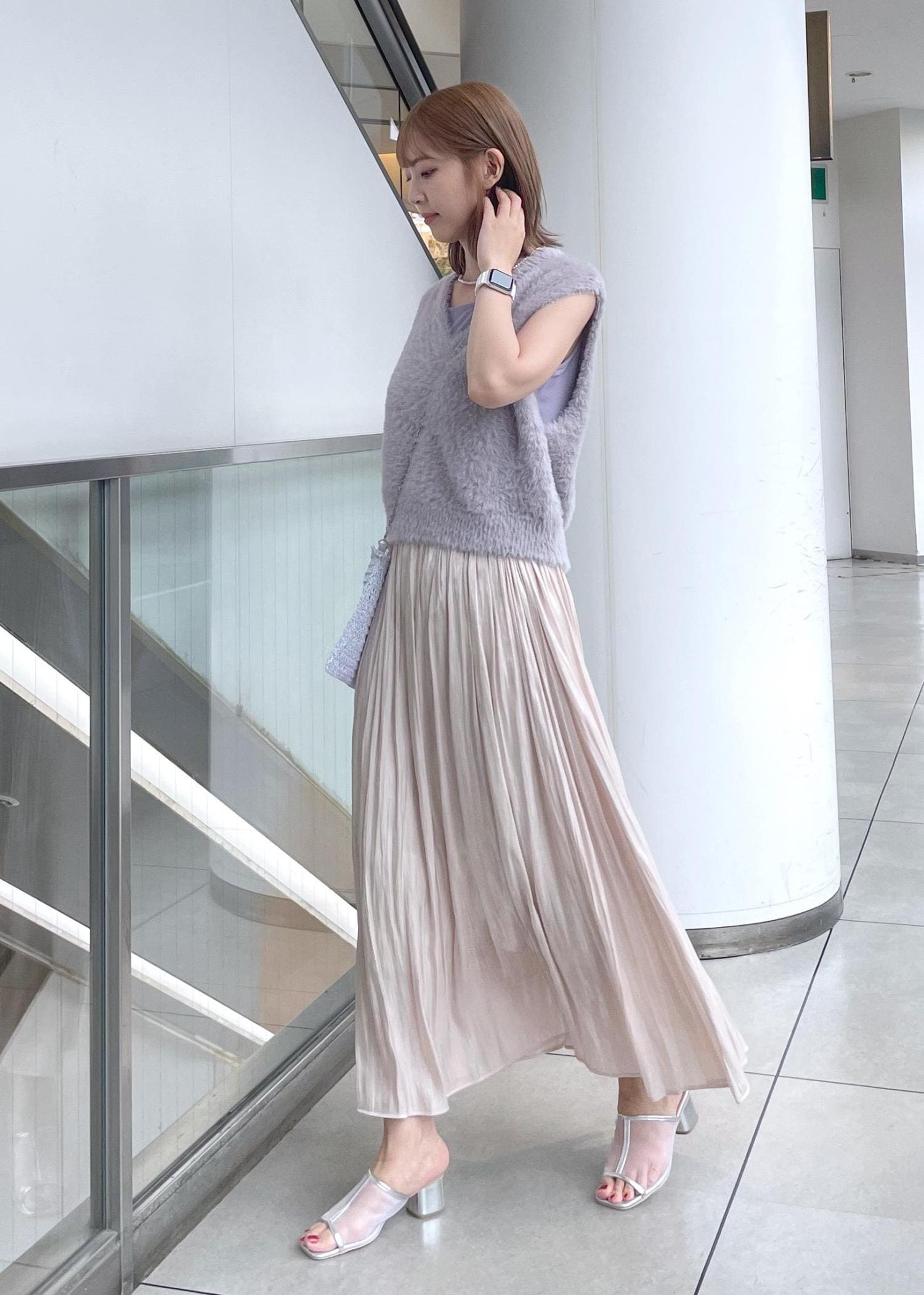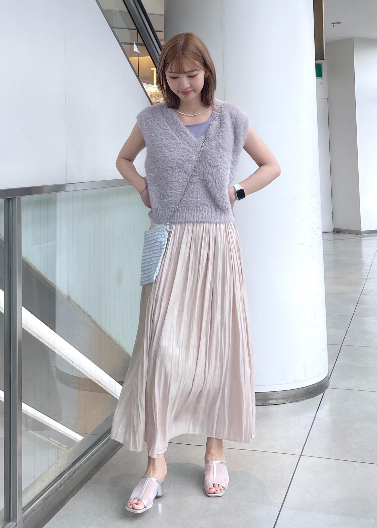 ふわふわなニットベストとキラキラスカートを合わせてデートにもピッタリなスタイルにしました♡足元をブーツに変更すると、秋にもピッタリです◎