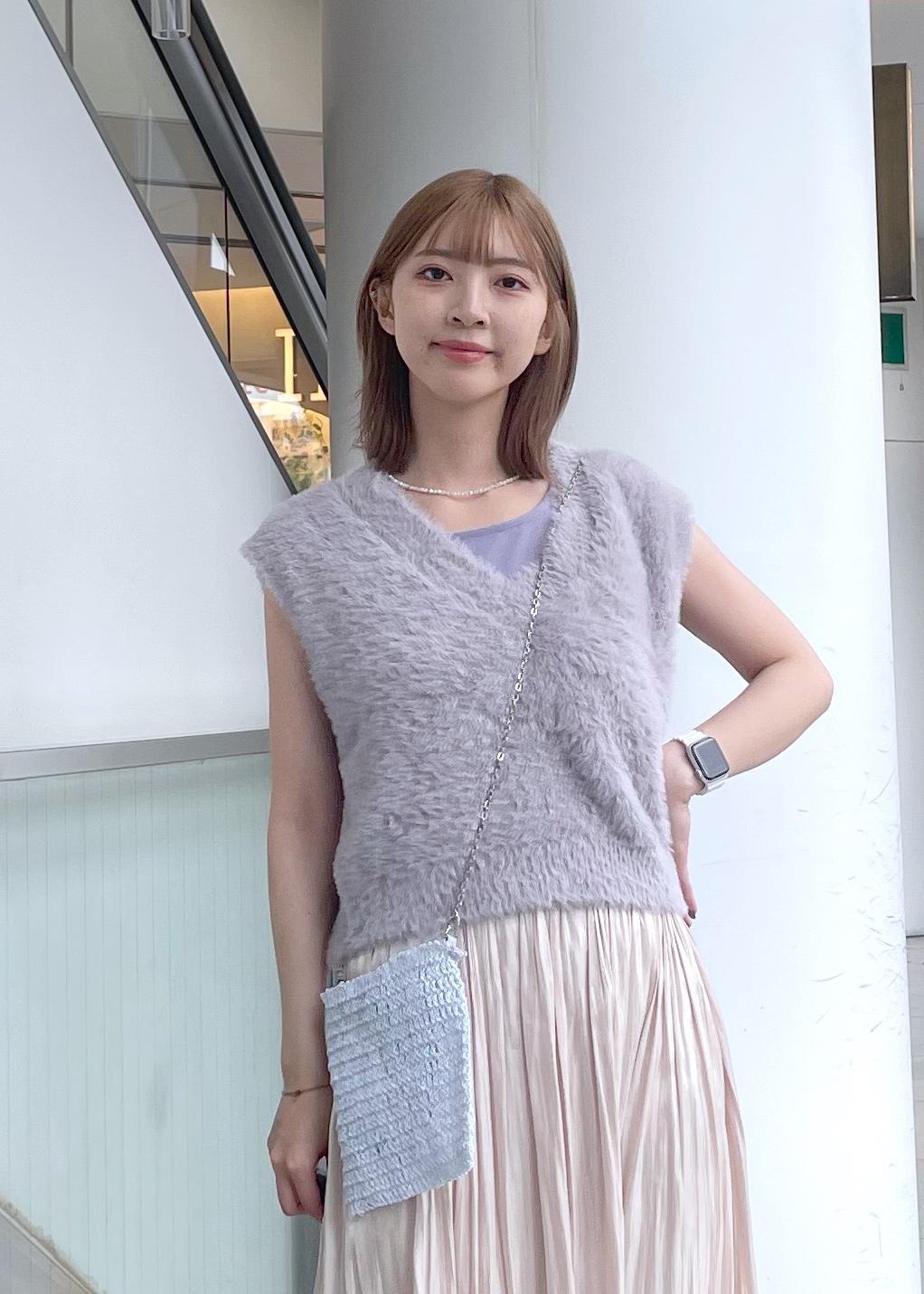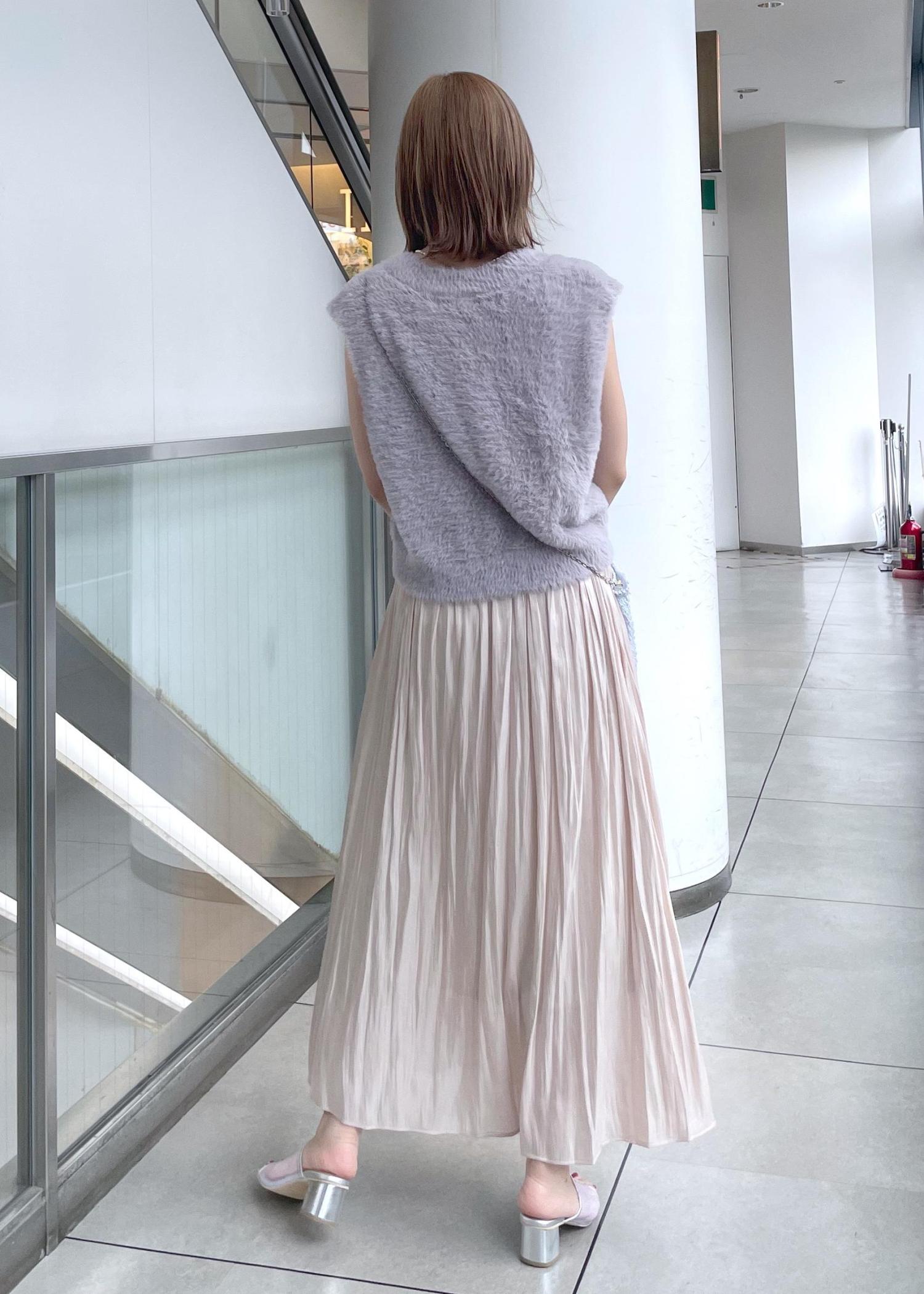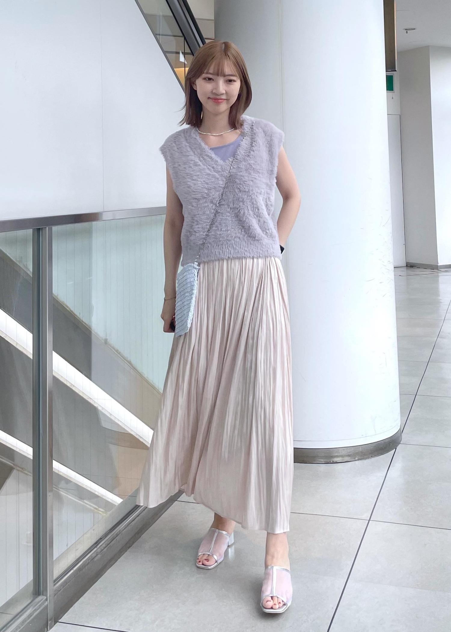 ふわふわなニットベストとキラキラスカートを合わせてデートにもピッタリなスタイルにしました♡足元をブーツに変更すると、秋にもピッタリです◎