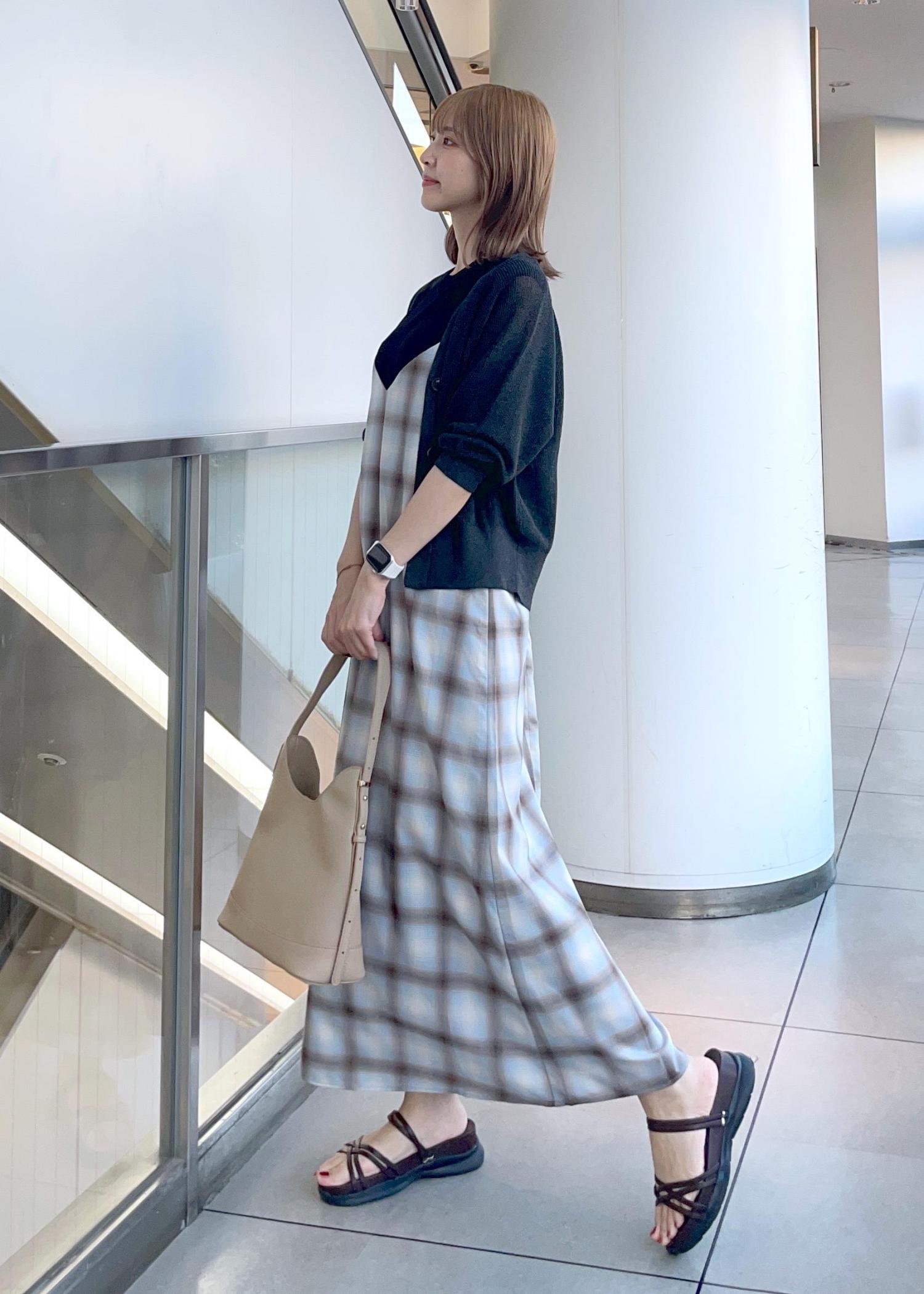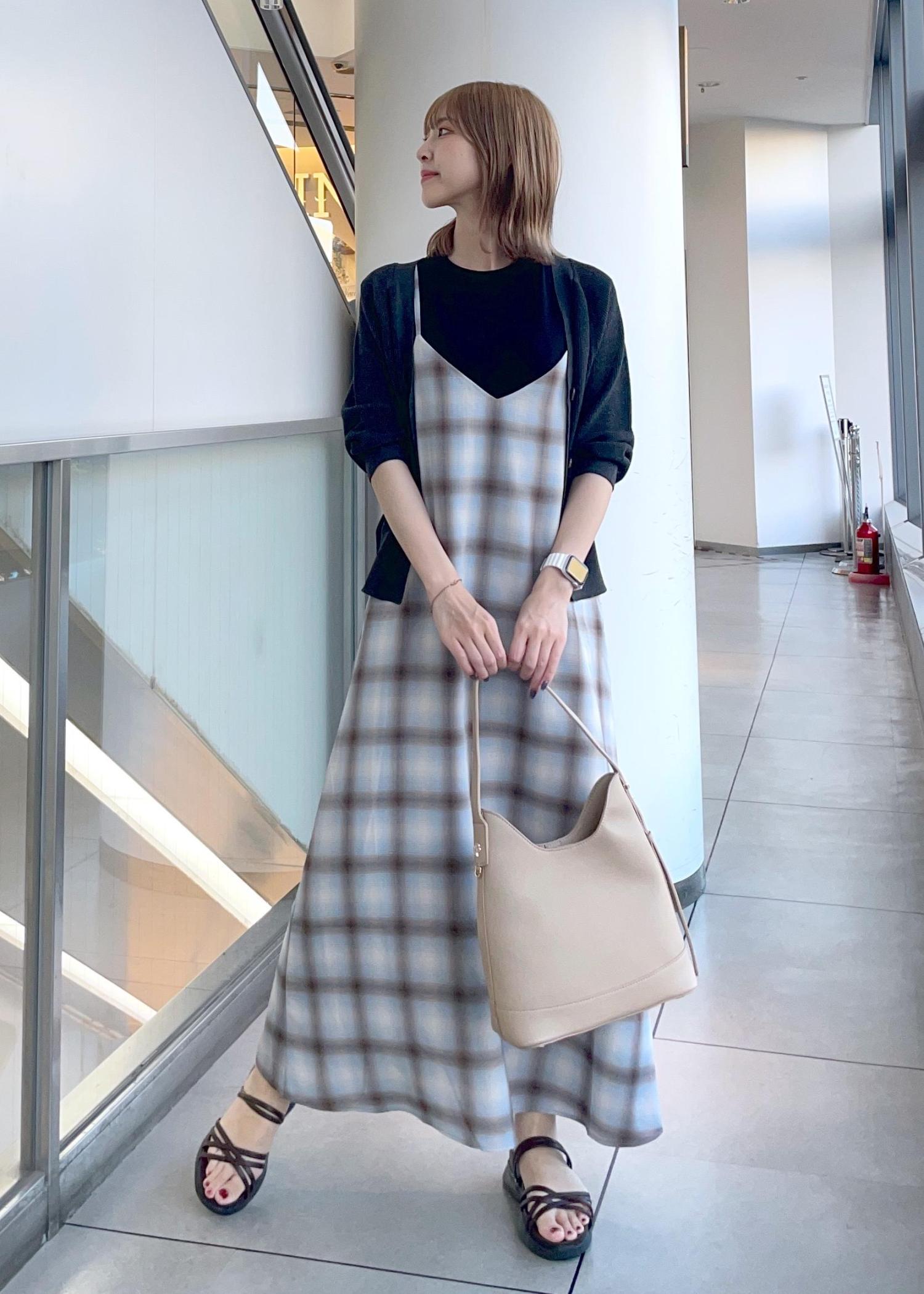 キャミワンピで楽ちんにオシャレみえするスタイルです。軽羽織を組み合わせ、秋にも使えるようにしました。足元ブーツにしても秋っぽくなり可愛いですよ。