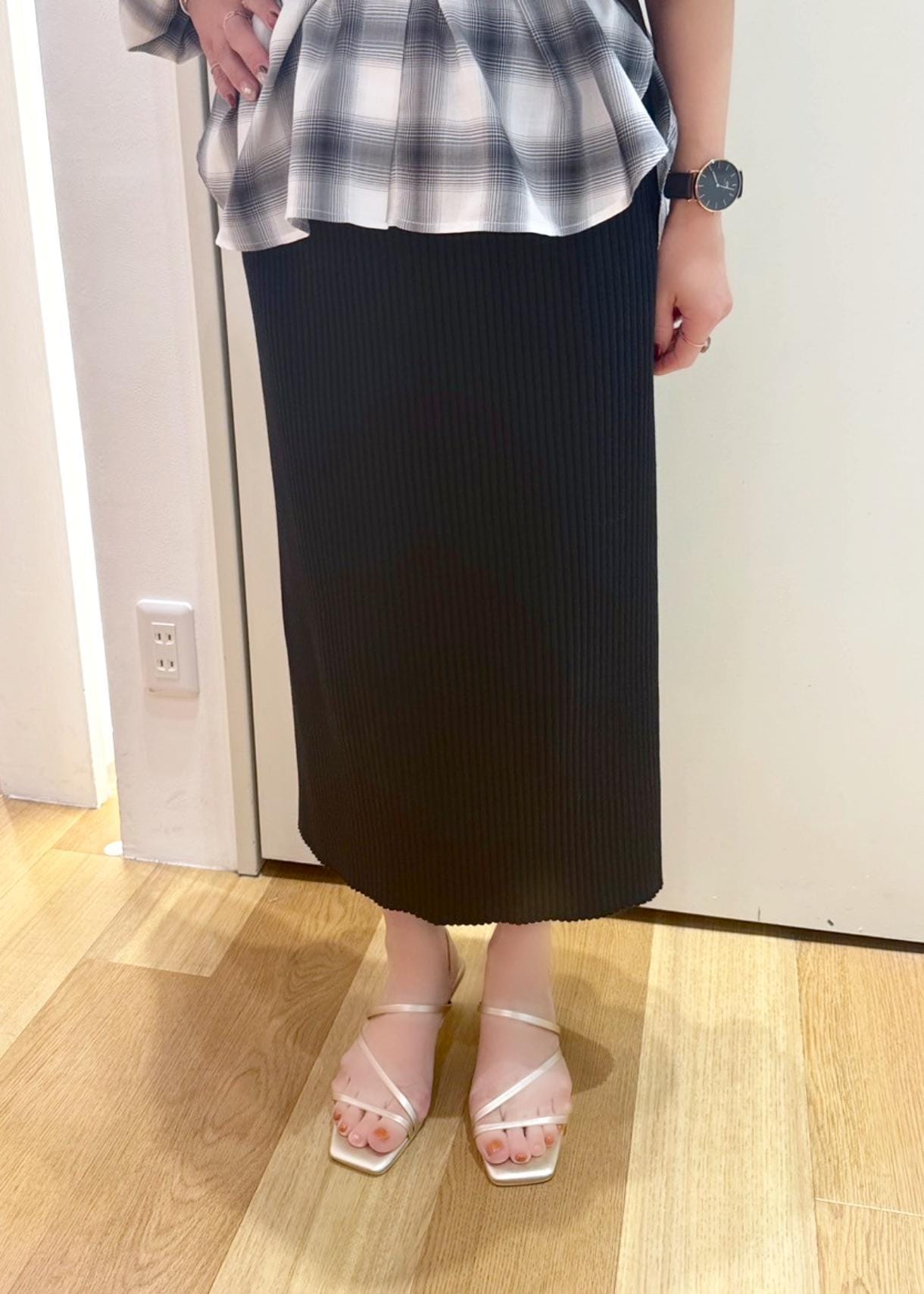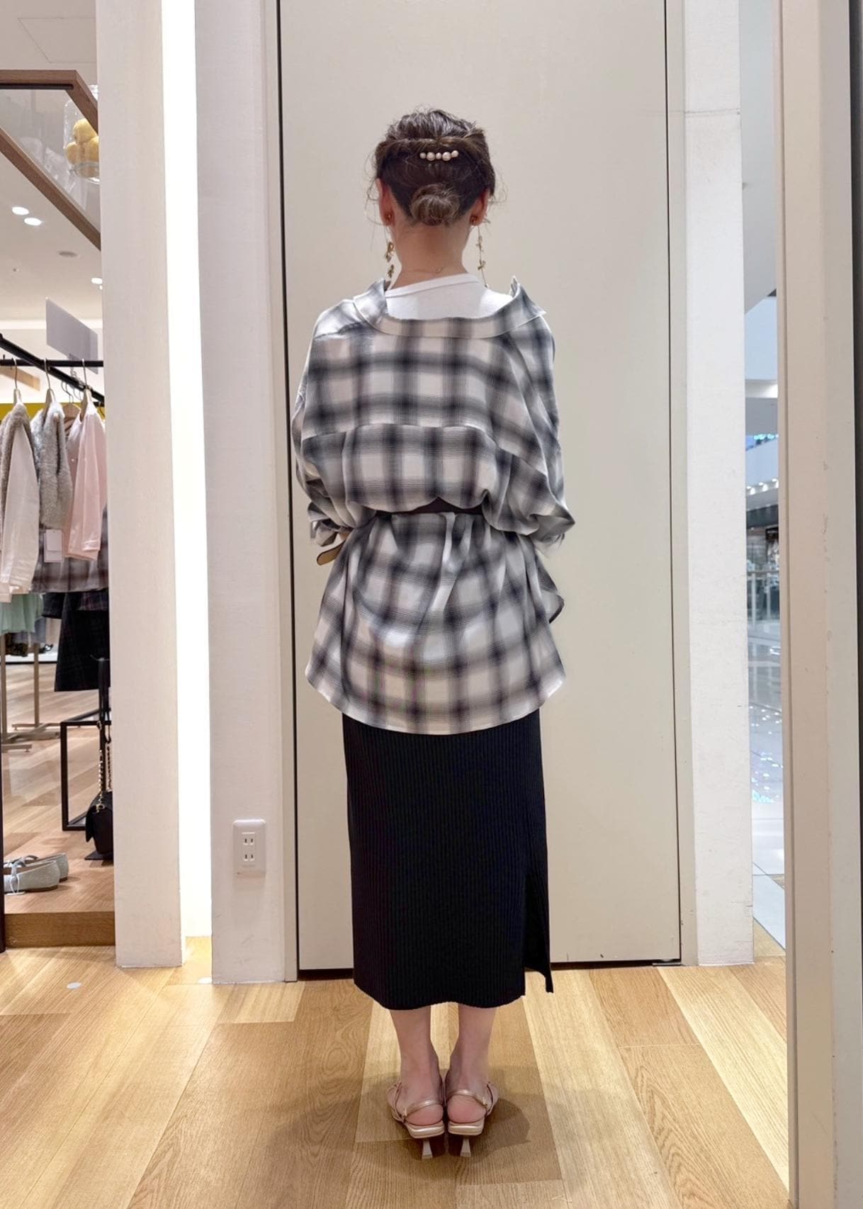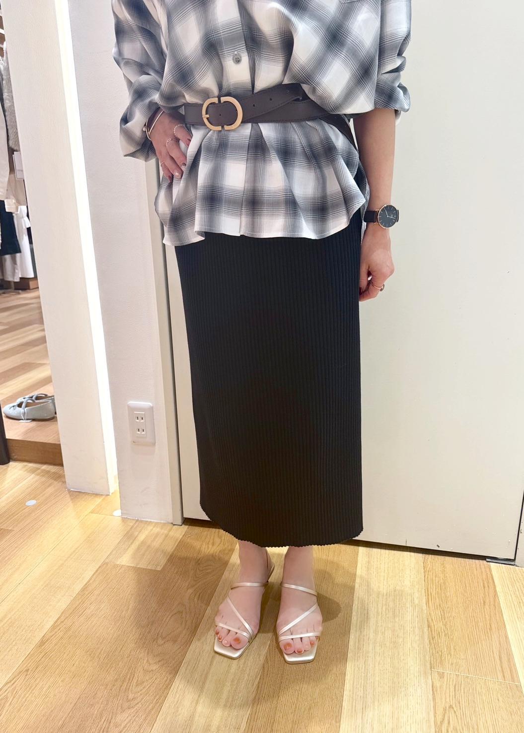 トタンテレコ素材のスカートはすっきりシルエットなので、シャツ合わせると好バランスです。