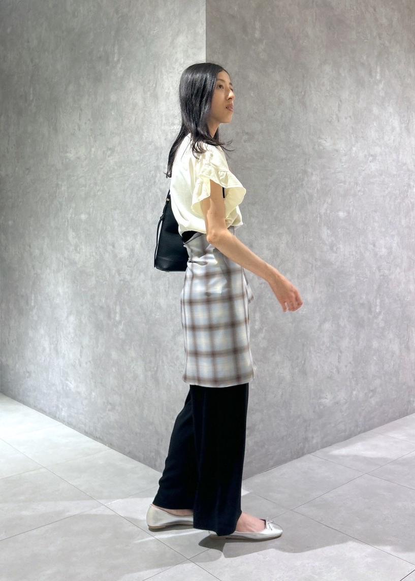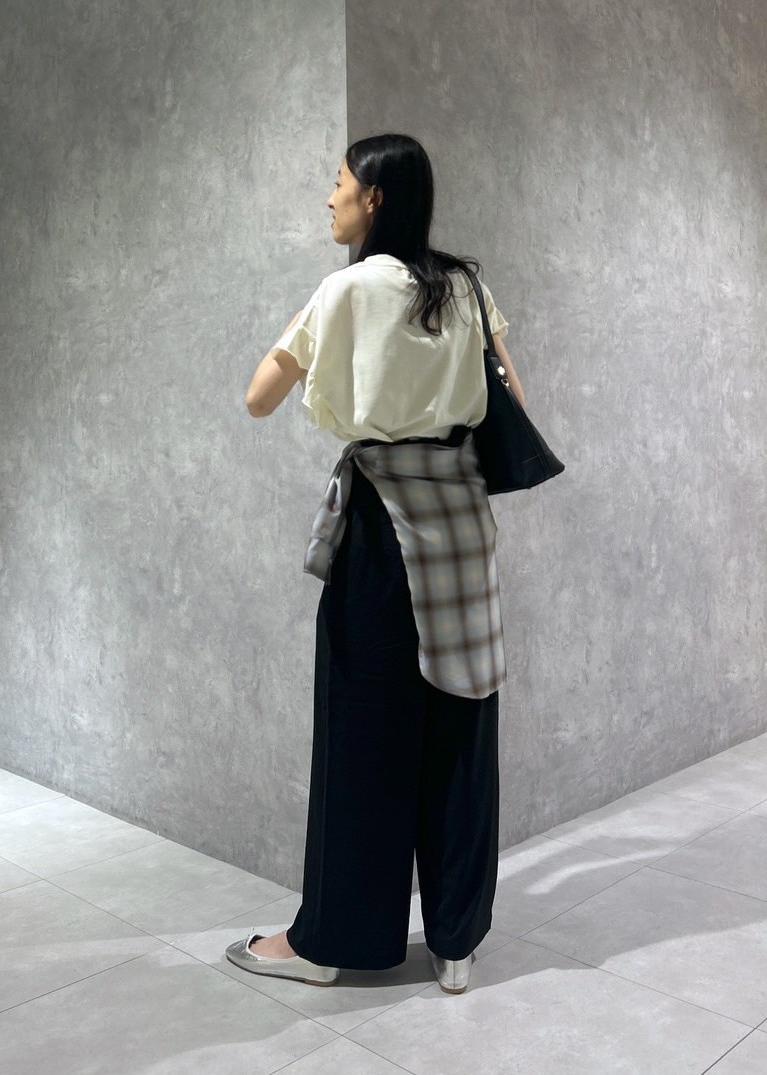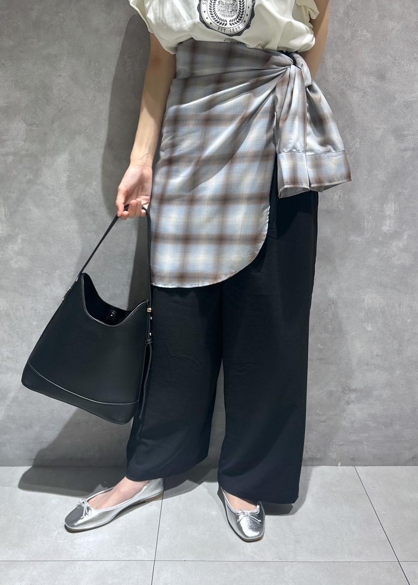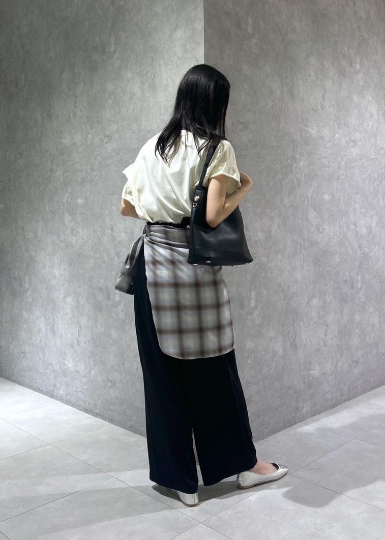 シンプルなトップスとボトムに、チェック柄のシャツを腰巻きで合わせてコーディネートのポイントづくり。