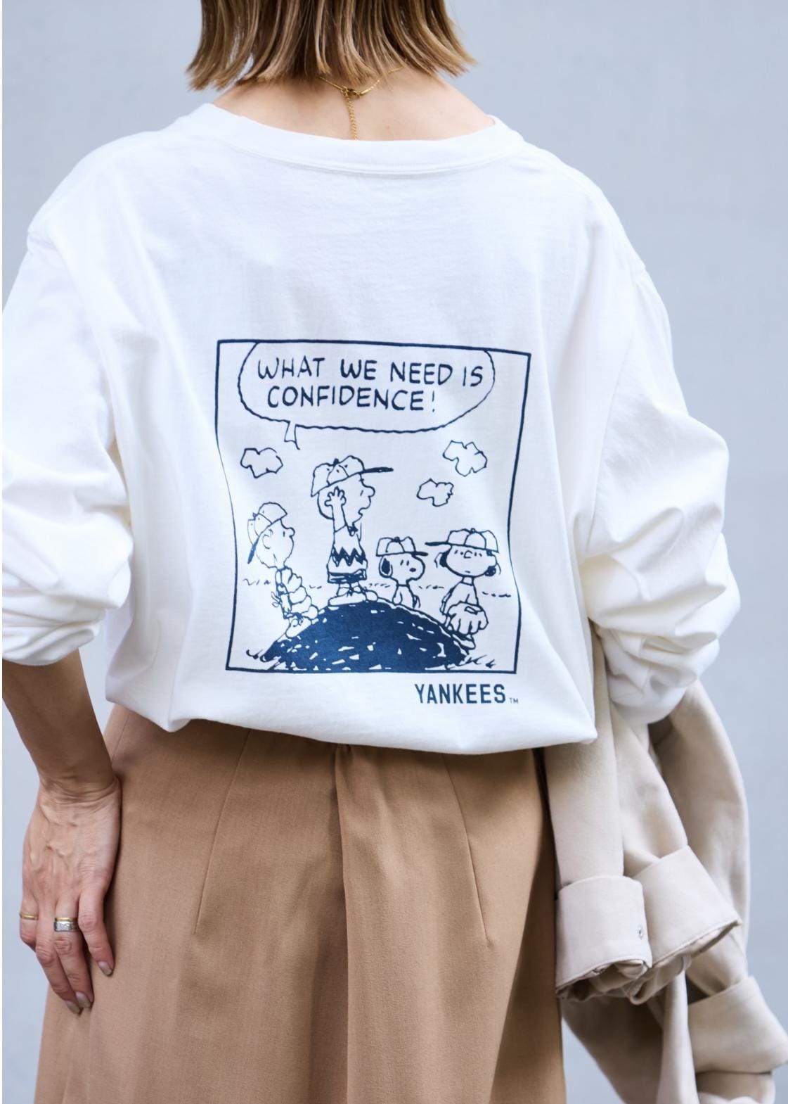 インナーに着ているPEANUTS×MLB COLLECTION BY ROPÉ PICNICのロングスリーブTシャツがポイントです。