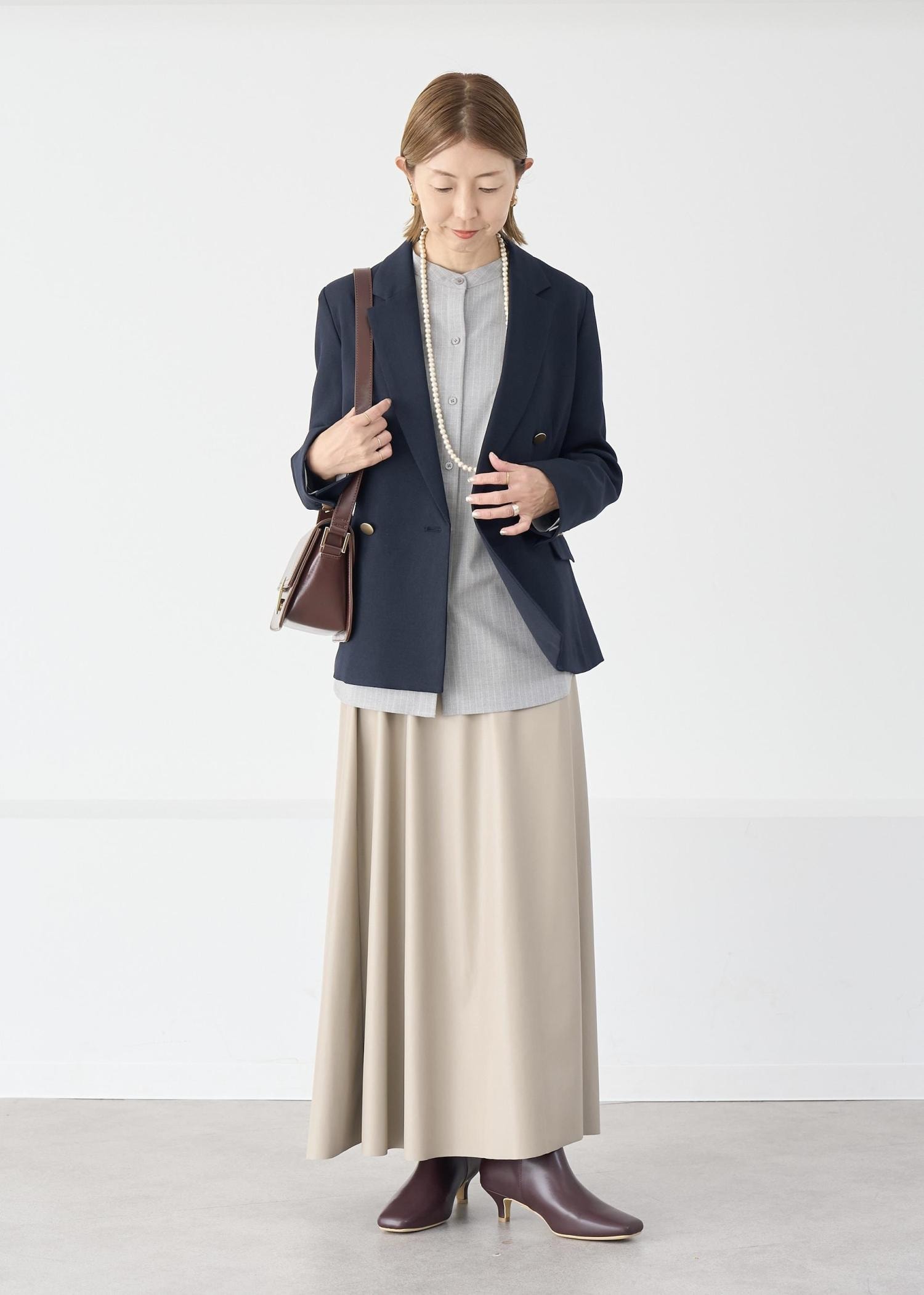 秋らしくシンセティックレザーのフレアスカートを合わせて大人な印象に。