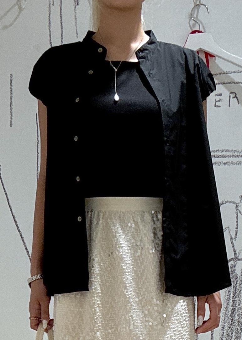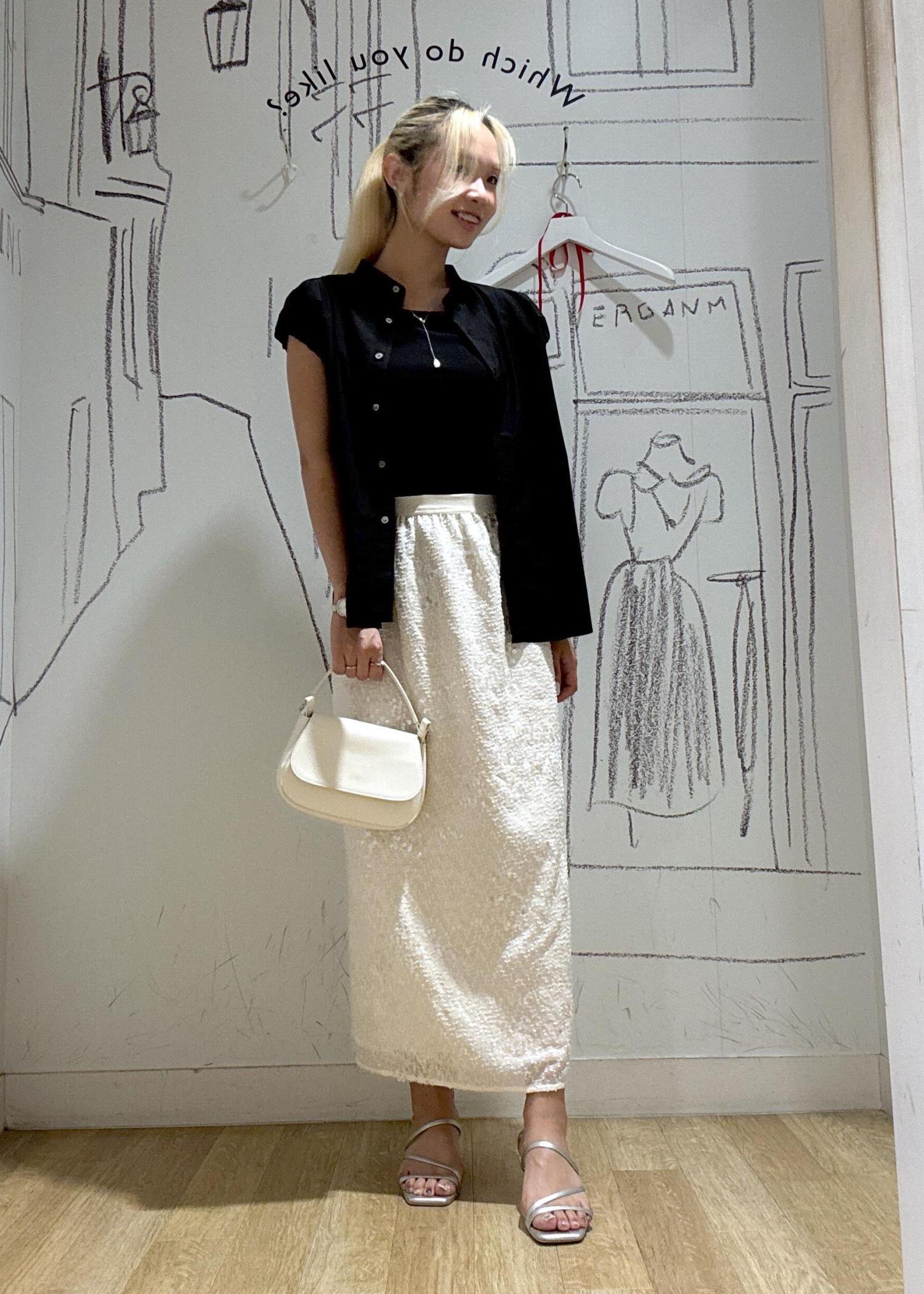 派手すぎないけど、夏らしいキラキラのスパンコールのスカートに綺麗めな黒のブラウスを合わせてみました。夏の海などのお出かけにぴったりです⭐︎