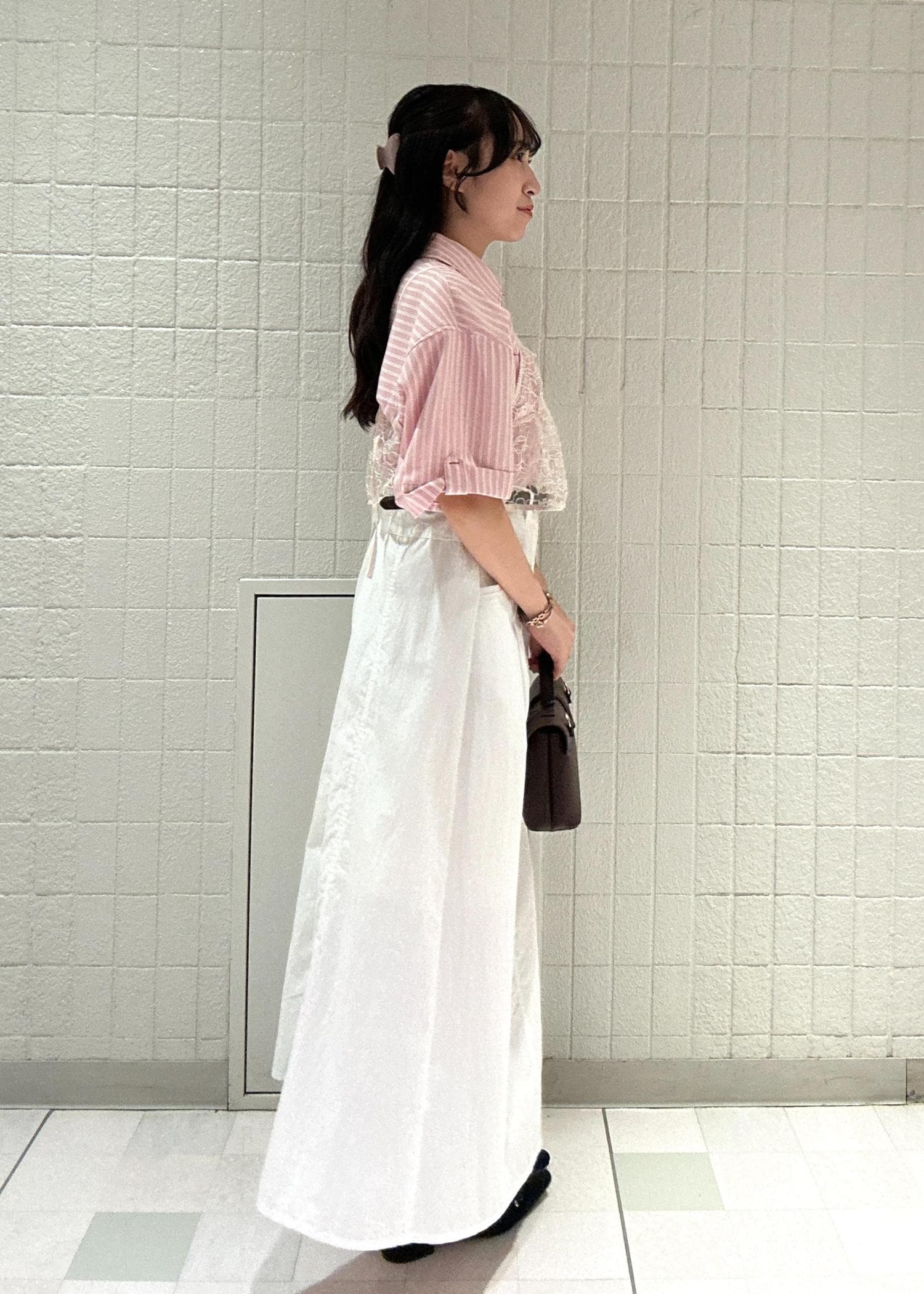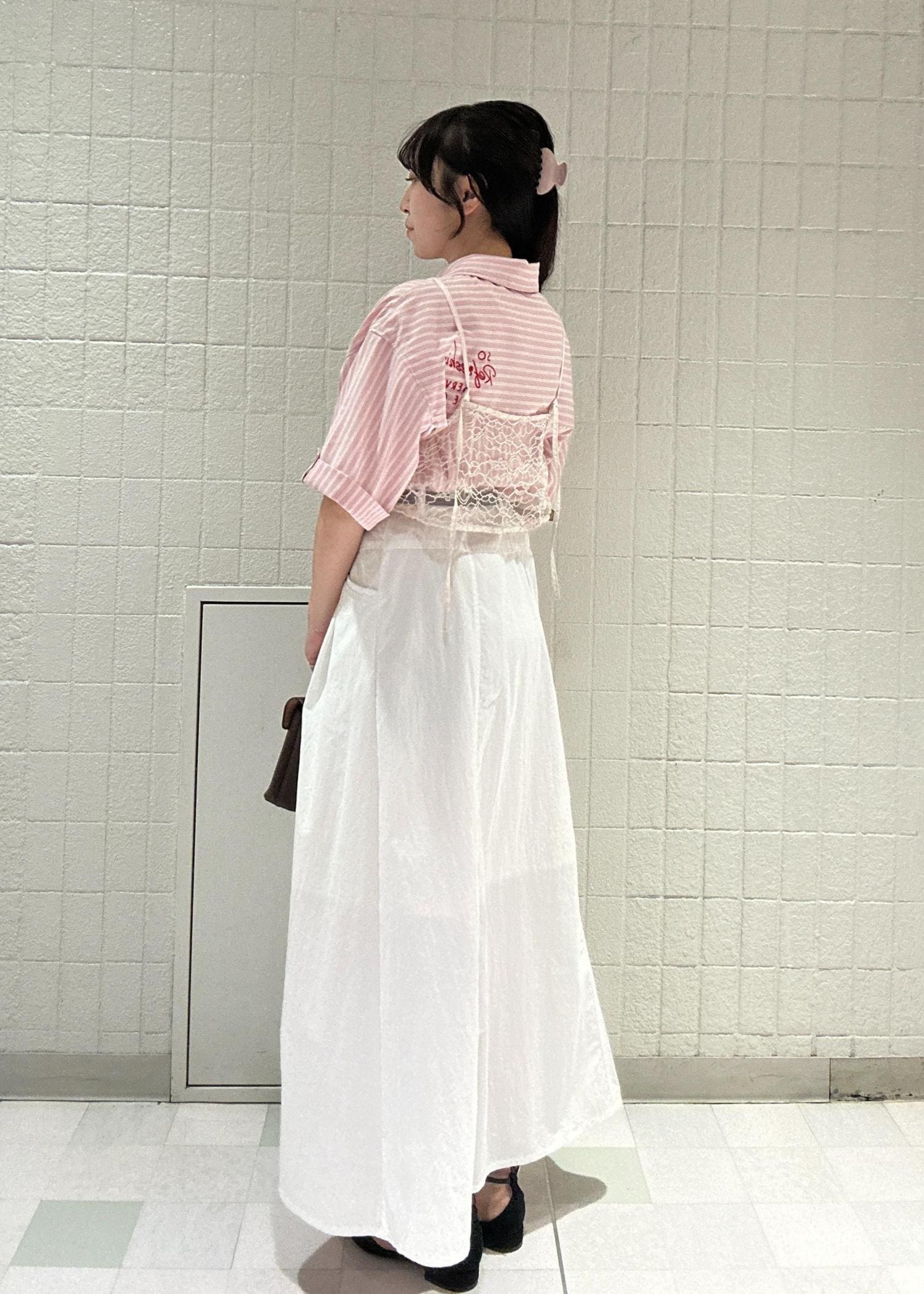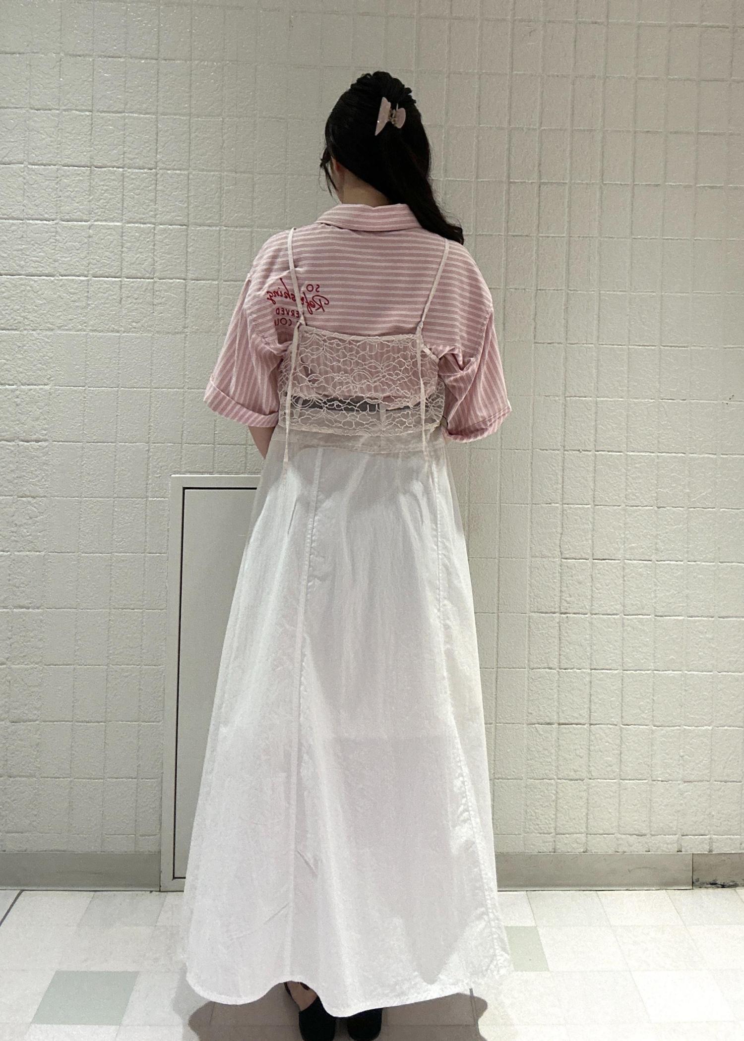 レイヤードで透け感のあるホワイトビスチェを重ねることで、ボトムスとの色味を寄せて馴染ませ、且つオシャレに見えるよう意識しました♪