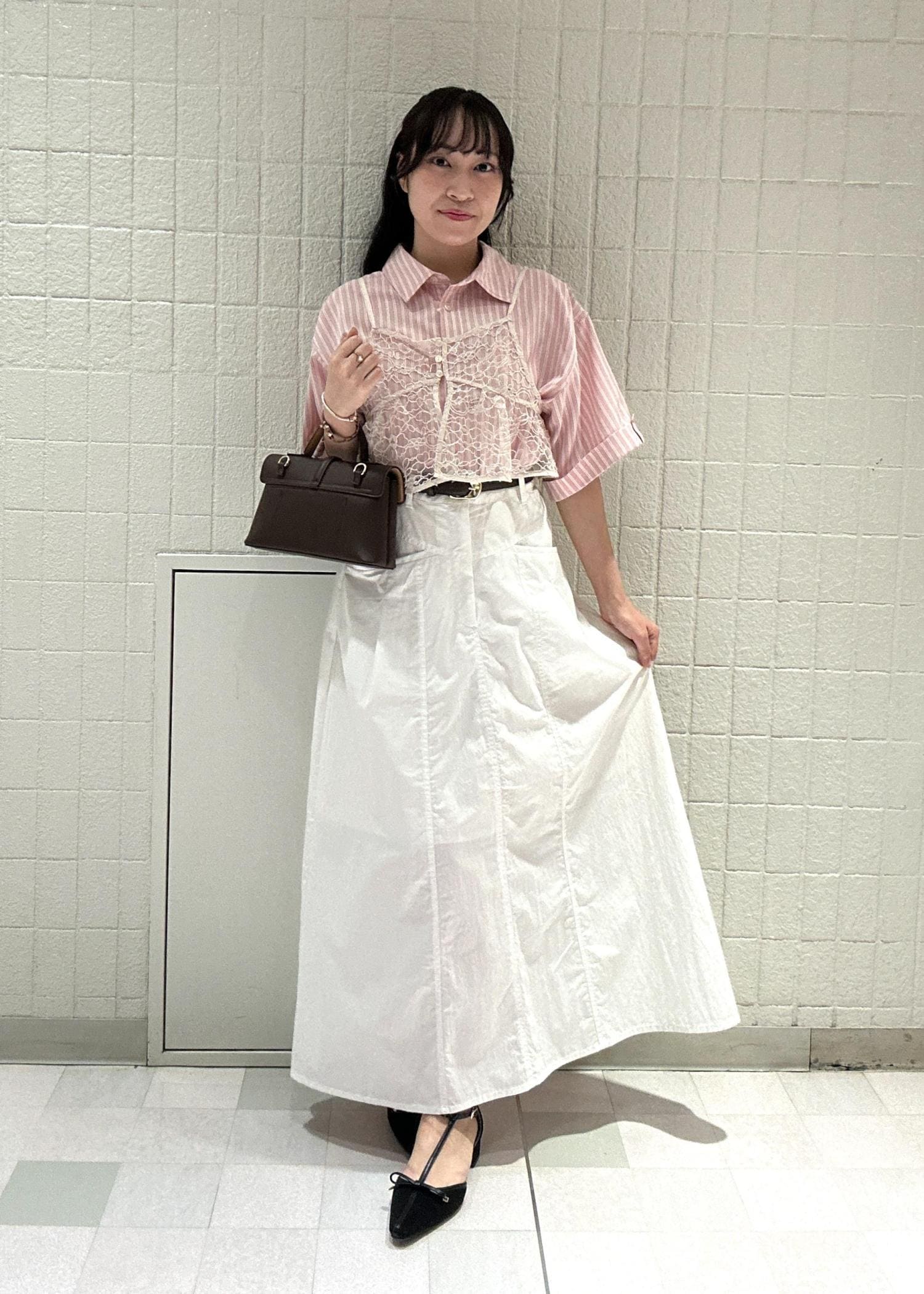 甘く淡い雰囲気を締めるよう、ベルトやバッグ、靴を濃いブラウスやブラックでまとめました!