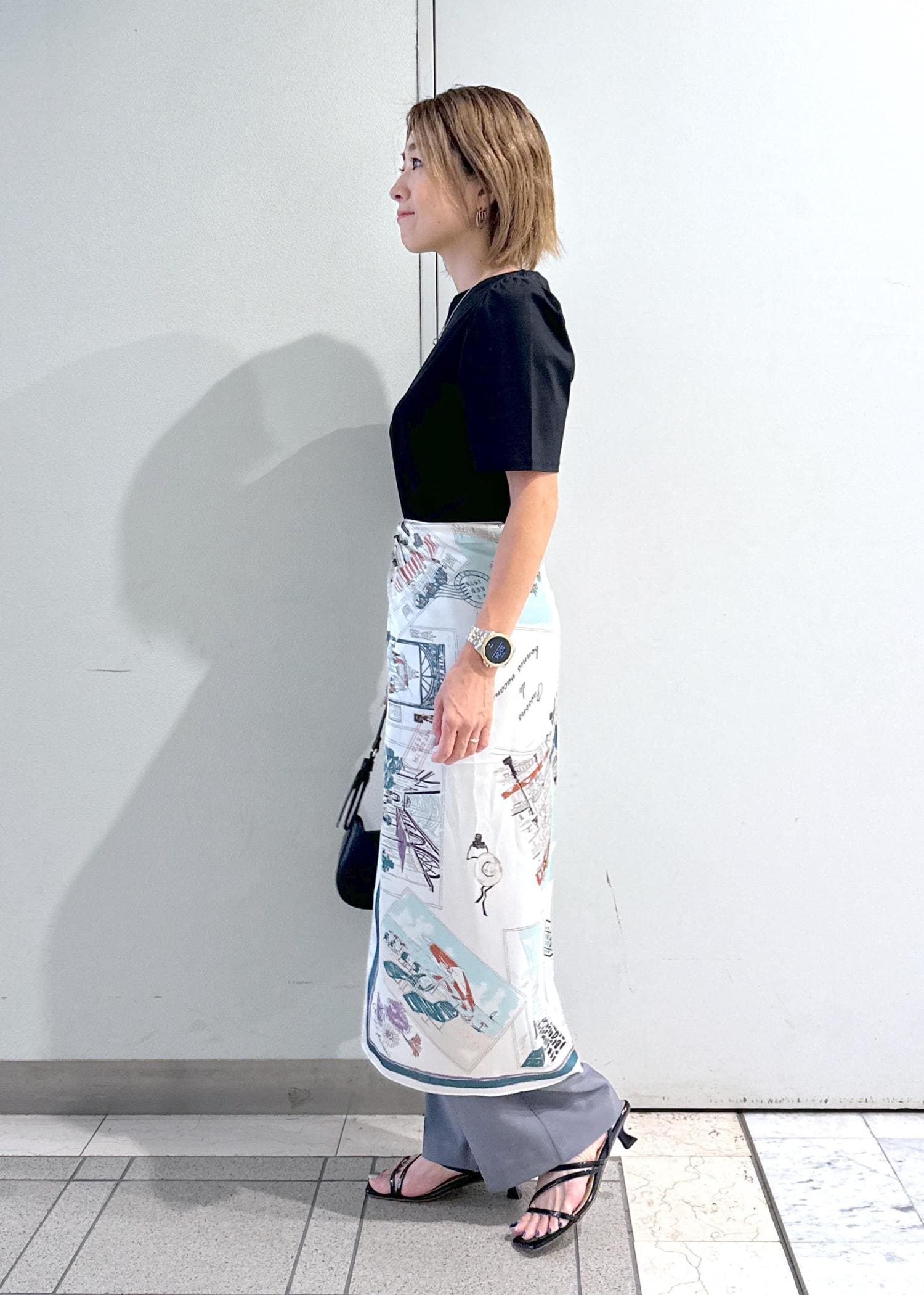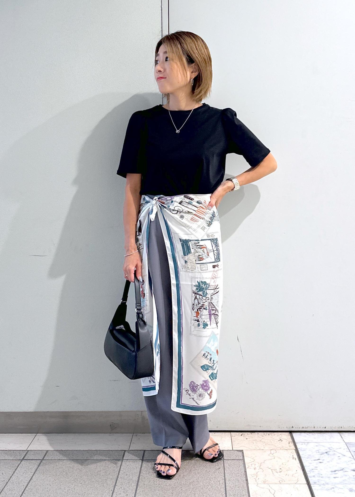 脚のラインを拾わないワイドシルエット。着丈はフラットシューズでも合わせられる長さです。 -
