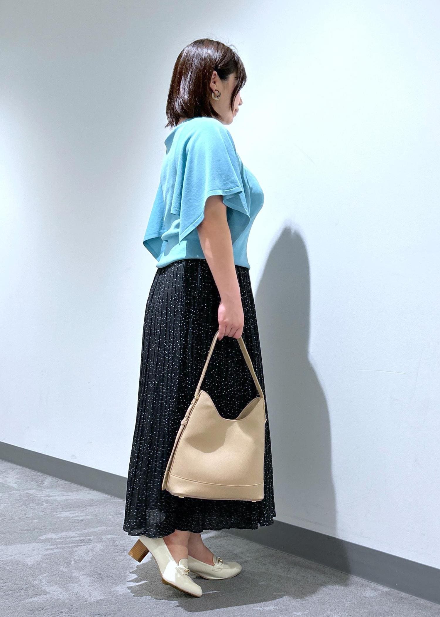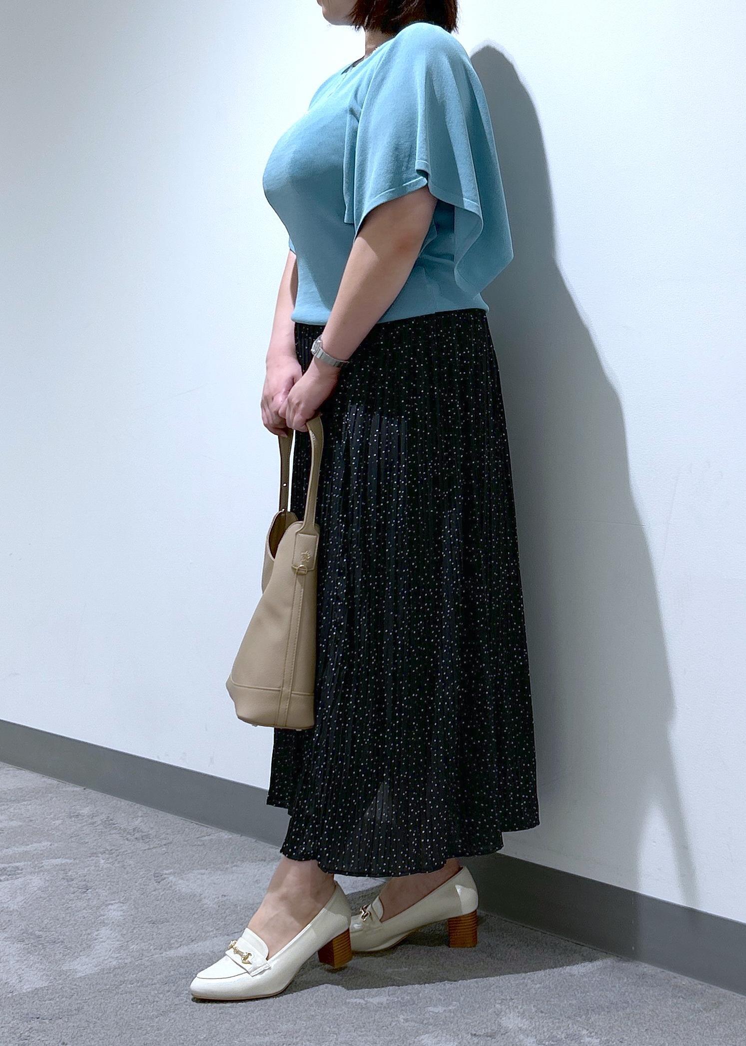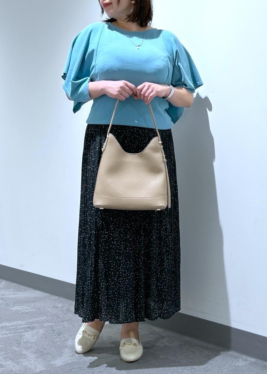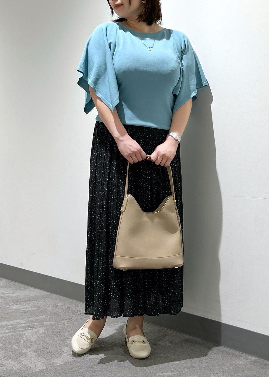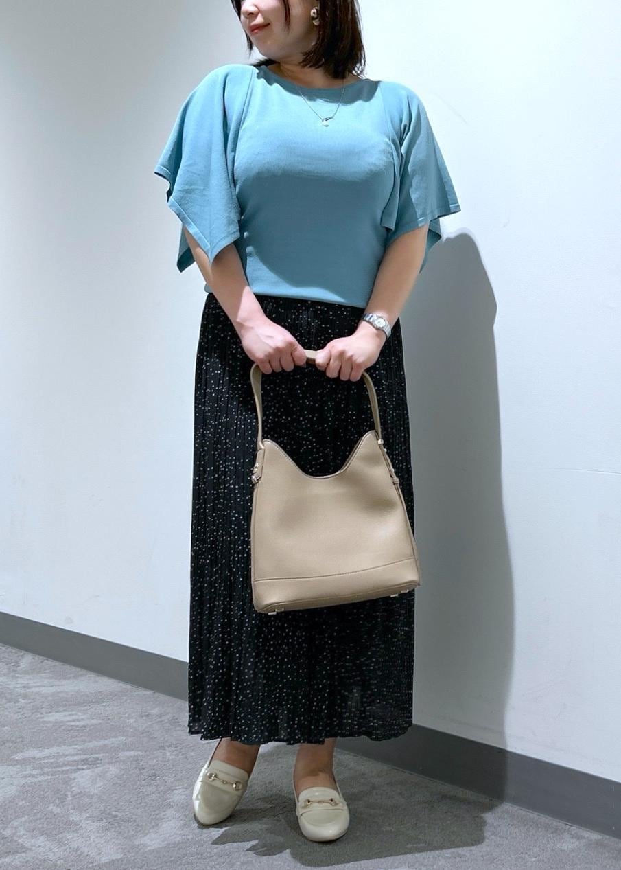 スカーフのようなスクエア袖が二の腕をカバーしてくれるニットプルオーバーと、ロングシーズン着用できる軽い着心地のプリーツスカートです。