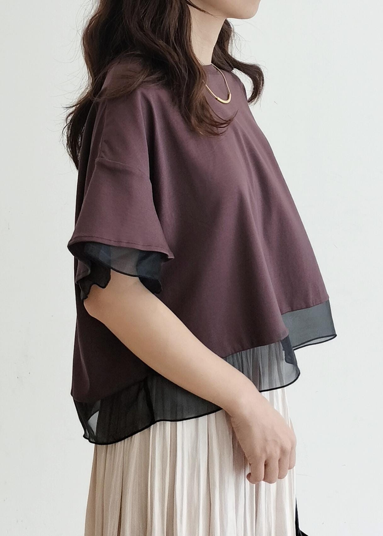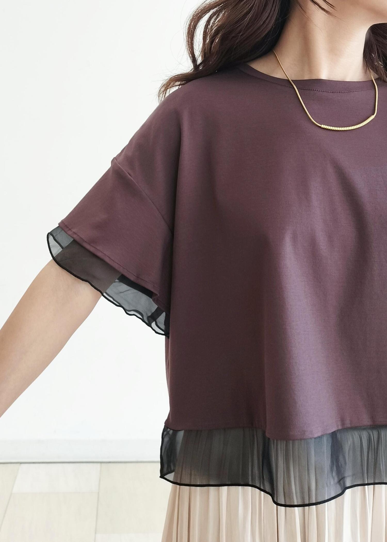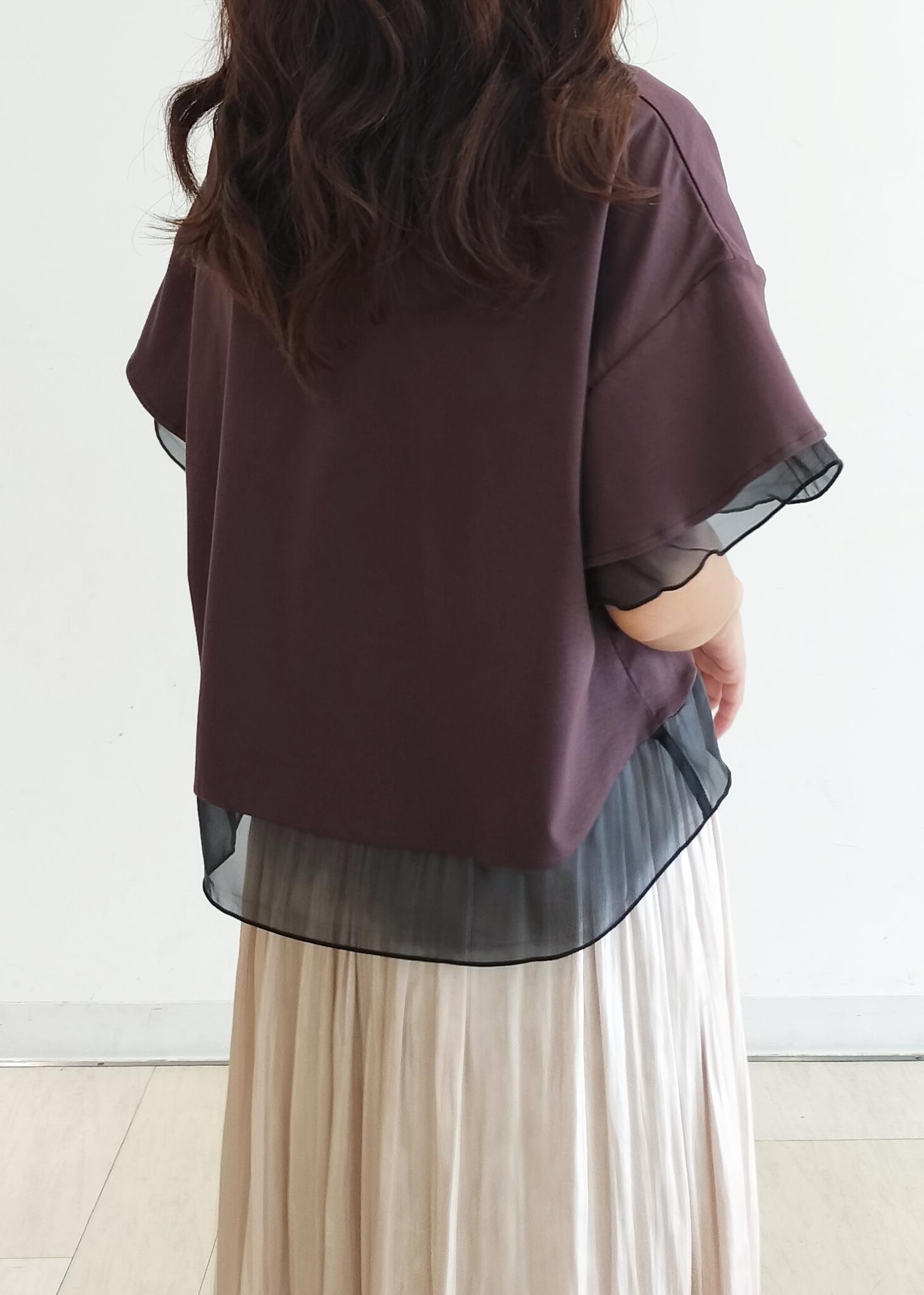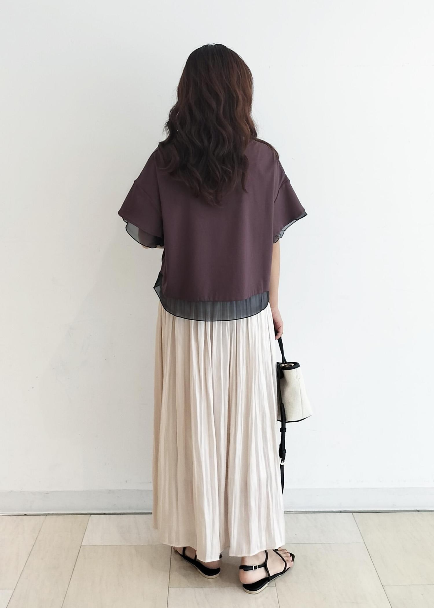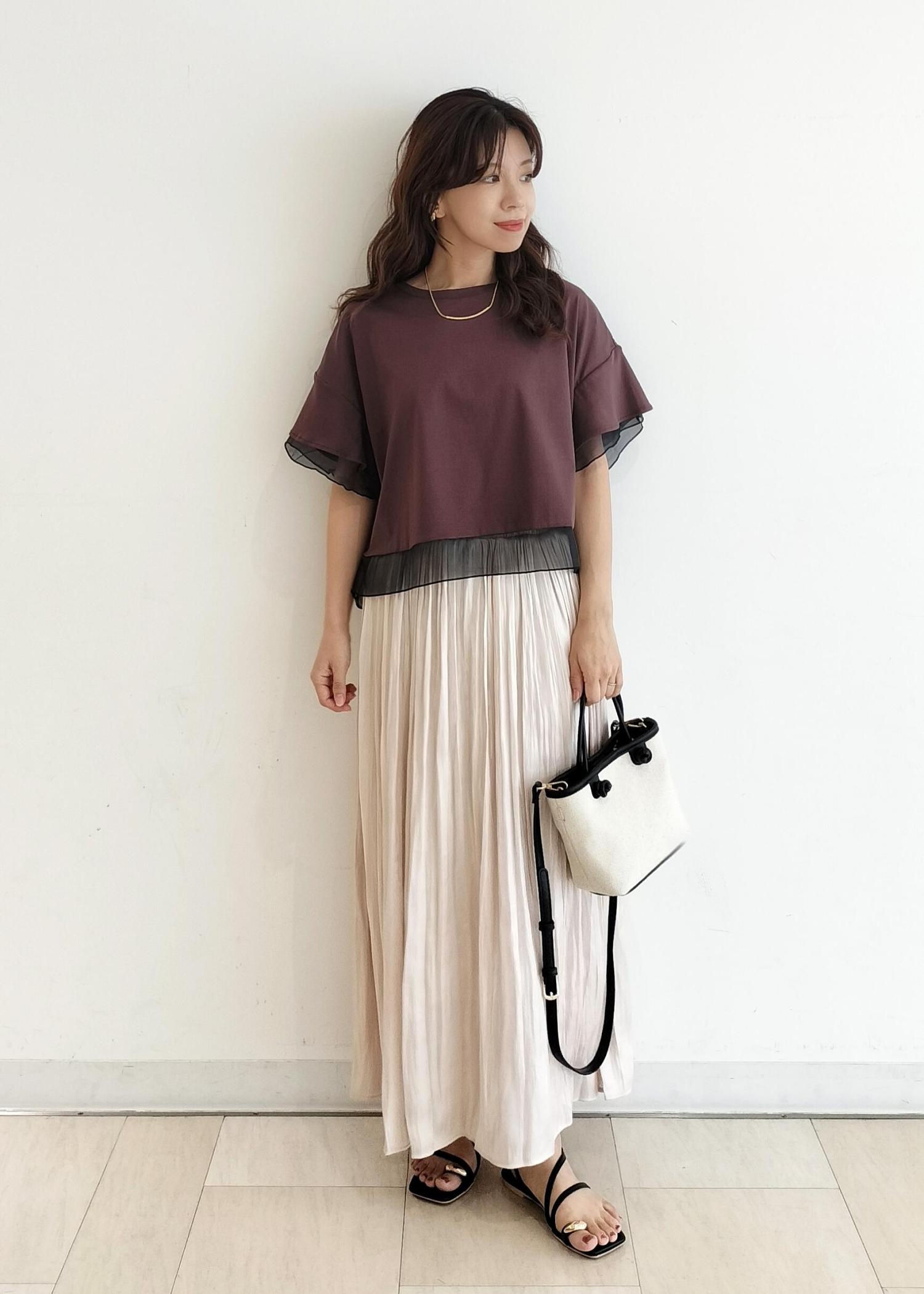 さらっとしたカットソー生地で涼しいです。ブラウンは透け感もなく安心。155cmの私で38サイズがスカートにもワイドパンツにも合わせやすい長さです。