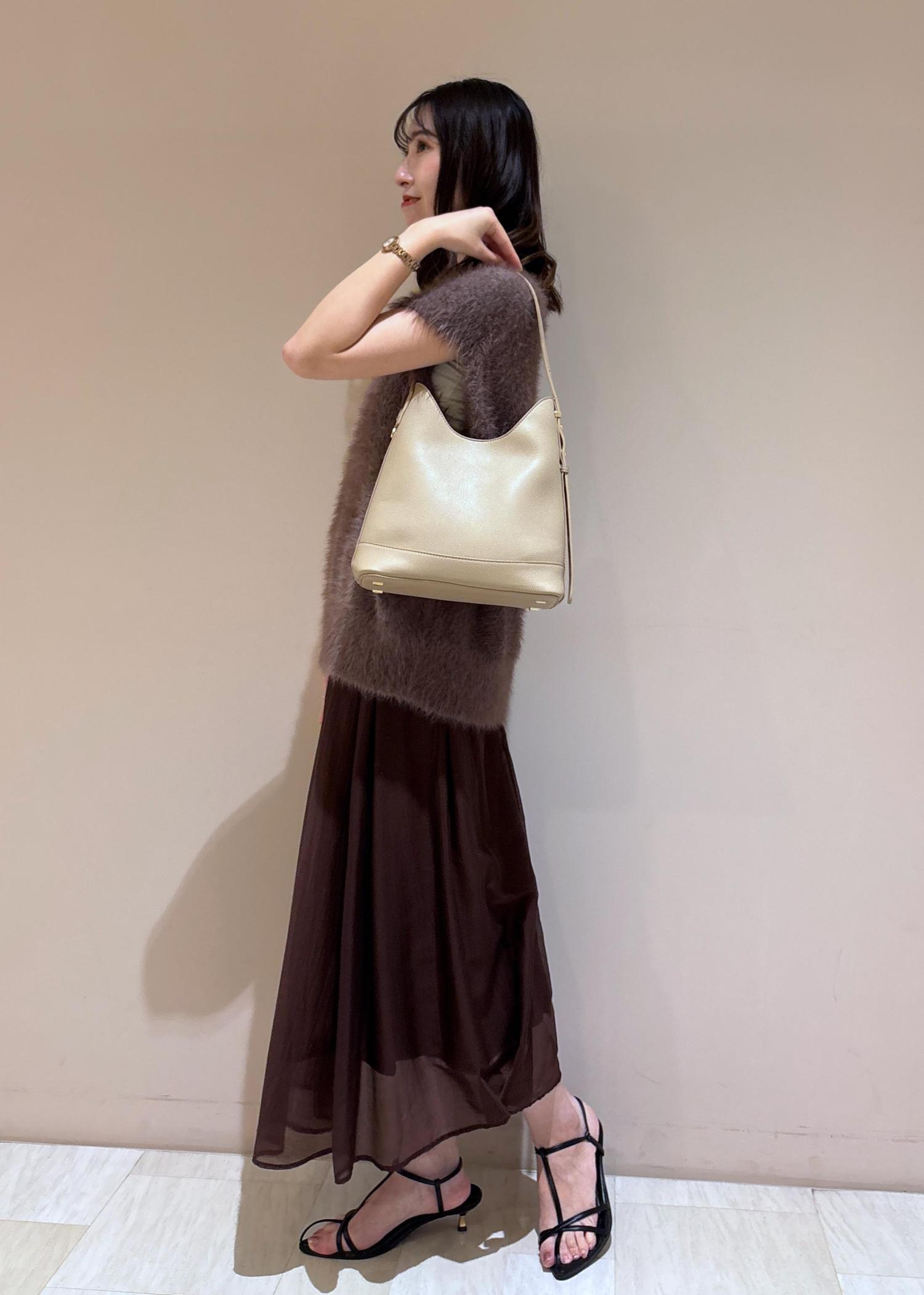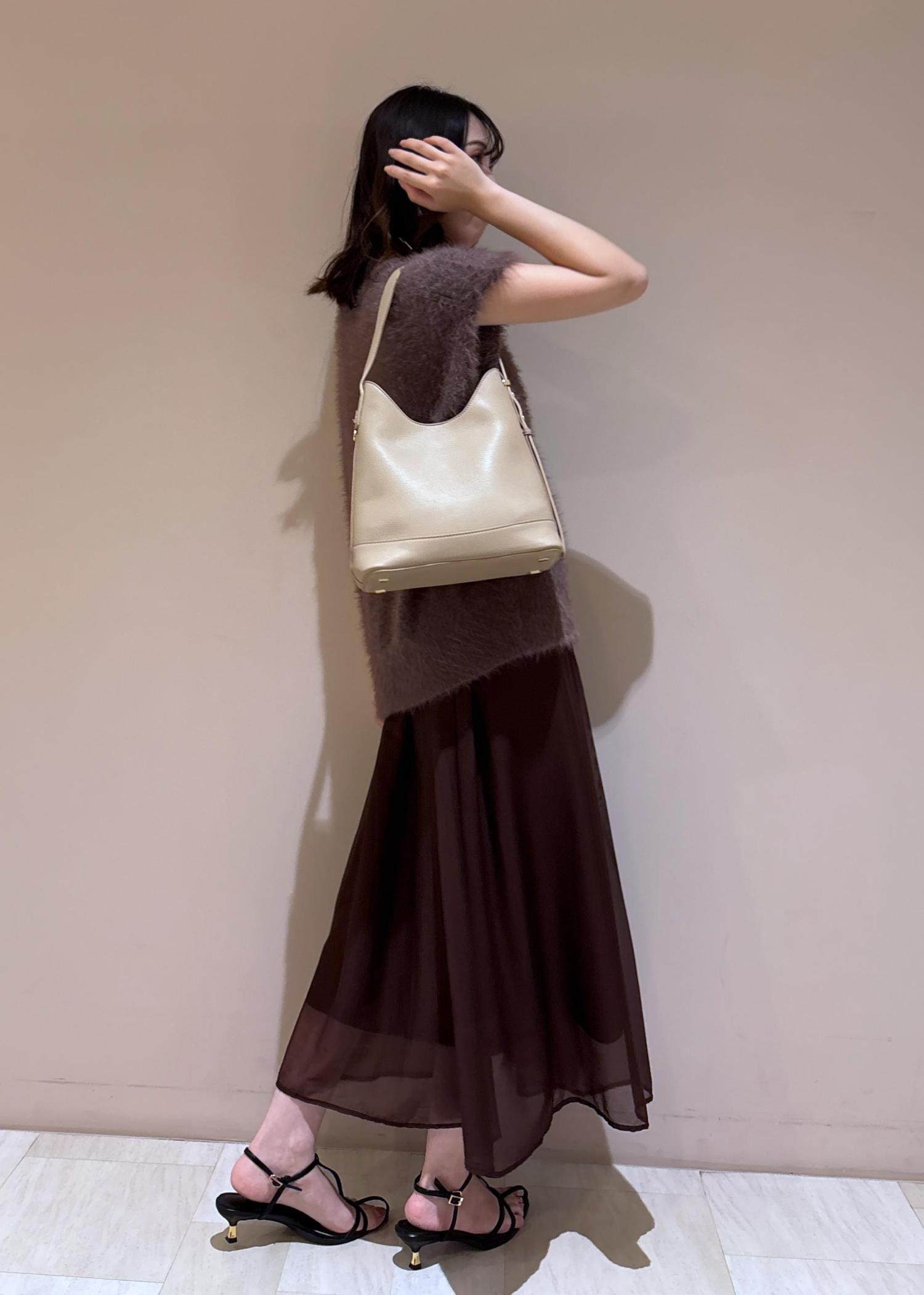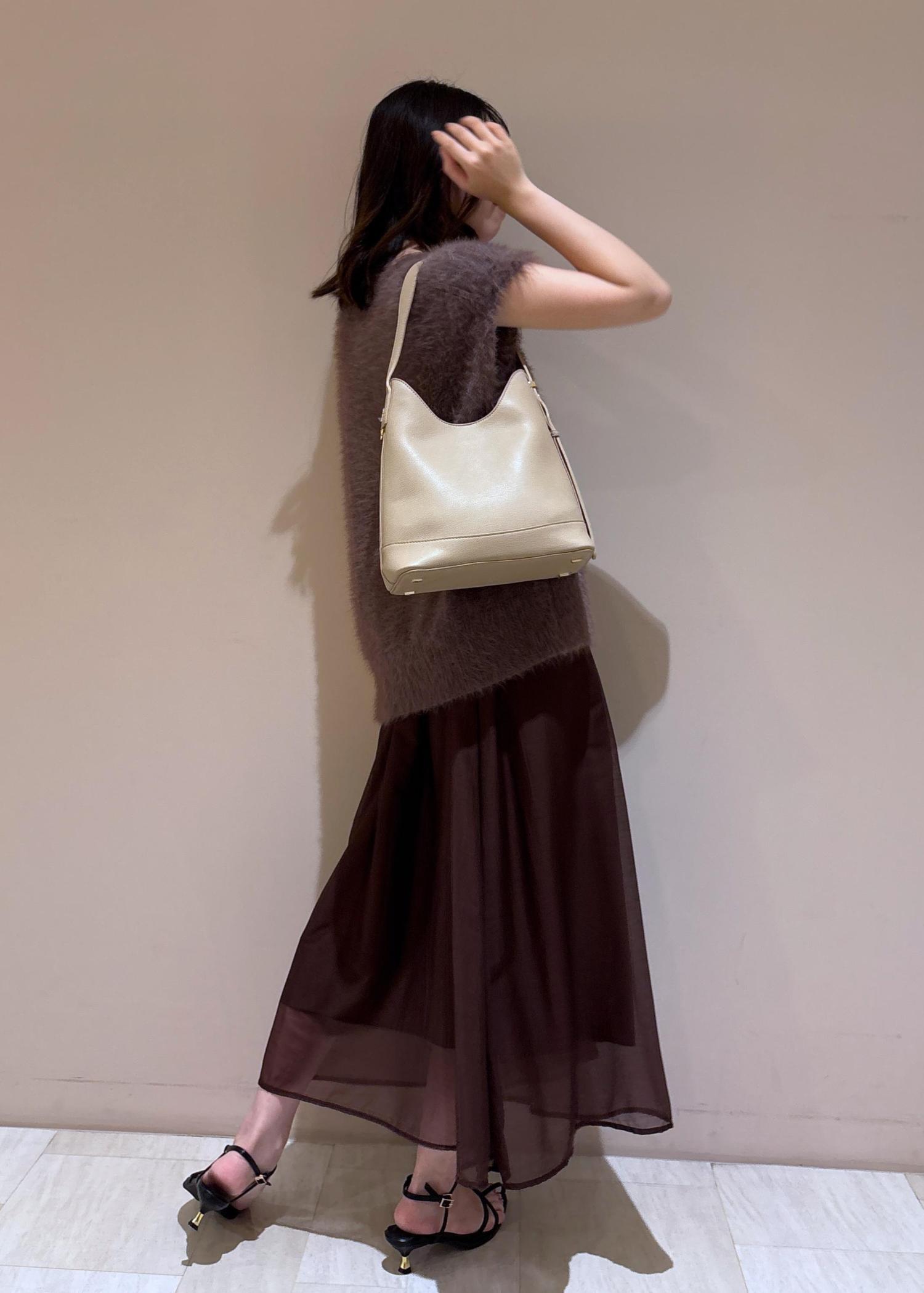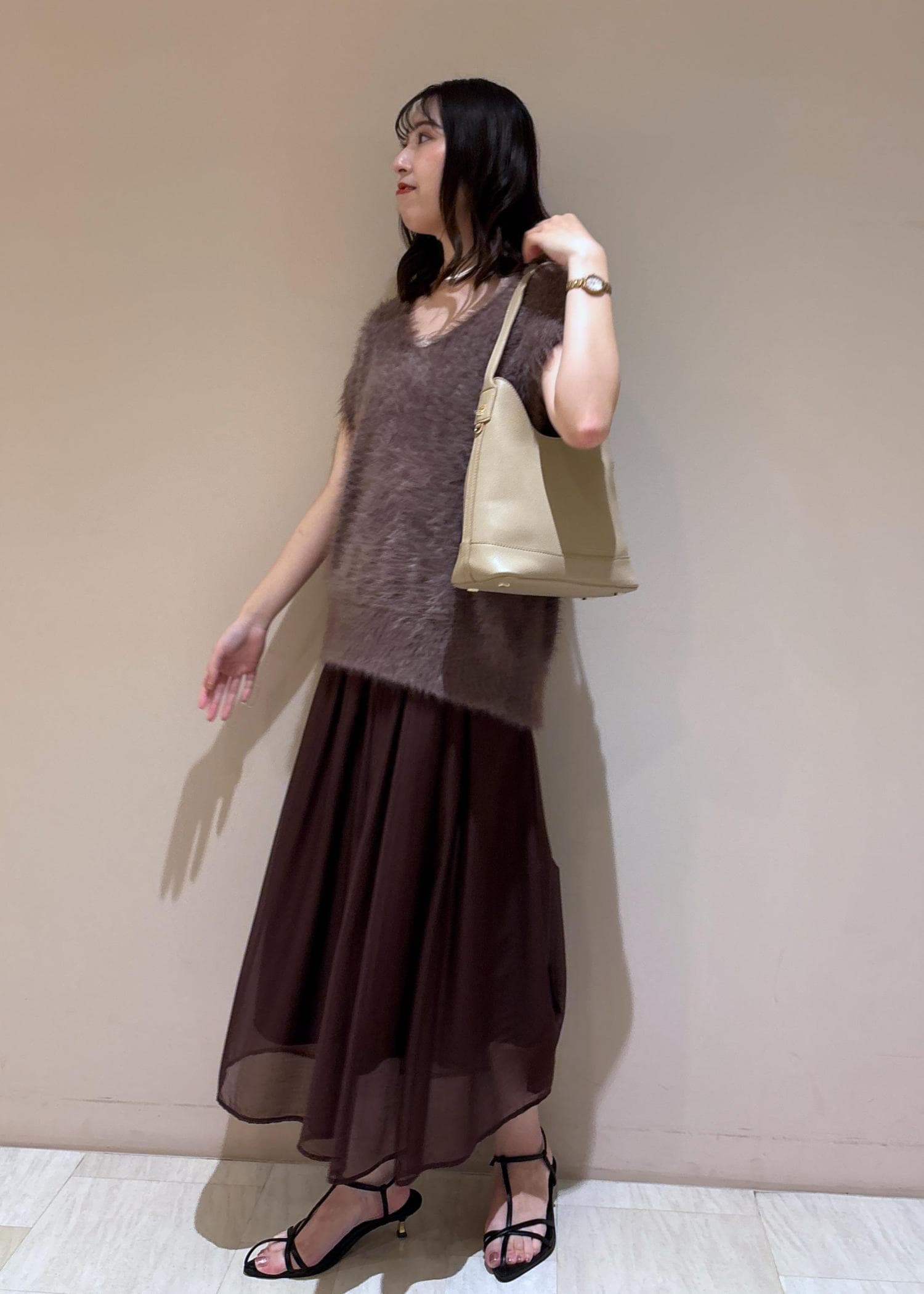 ふわふわっとしたフェザーニットベスト×スカート合わせで、大人キレイめコーデに。