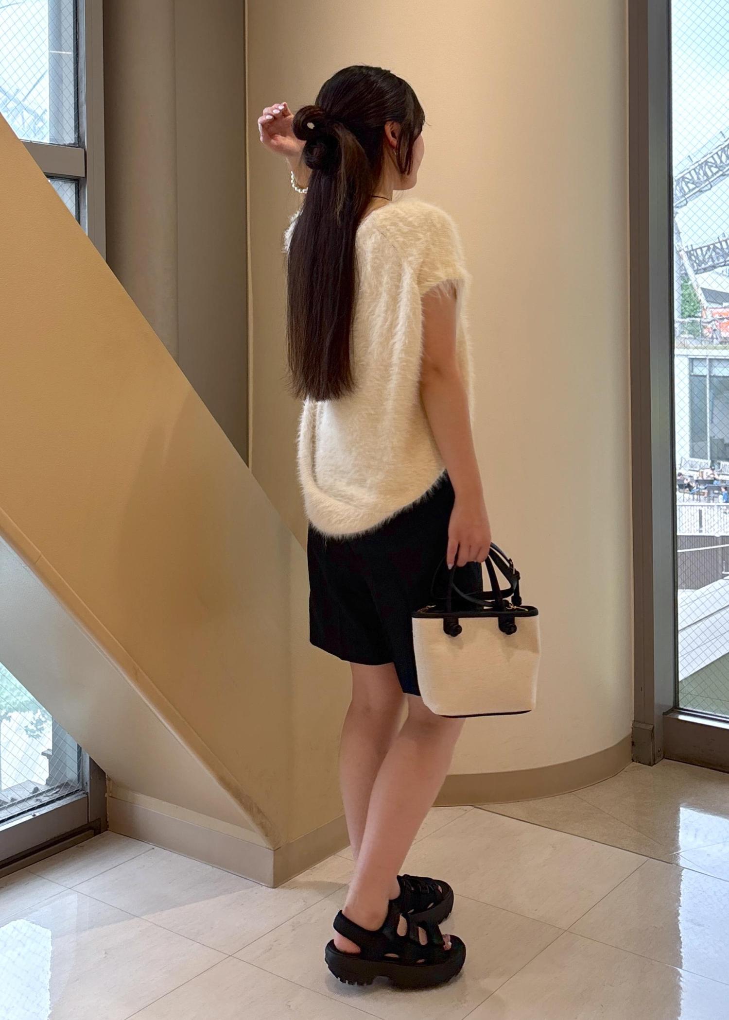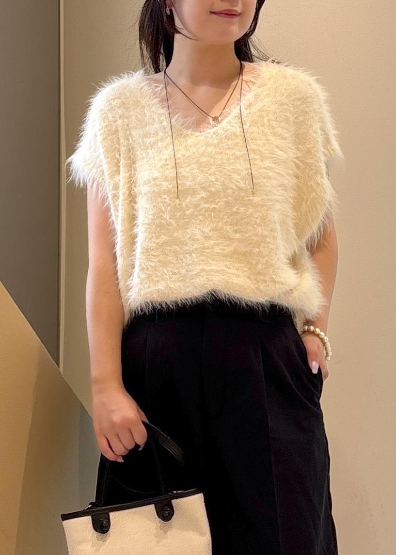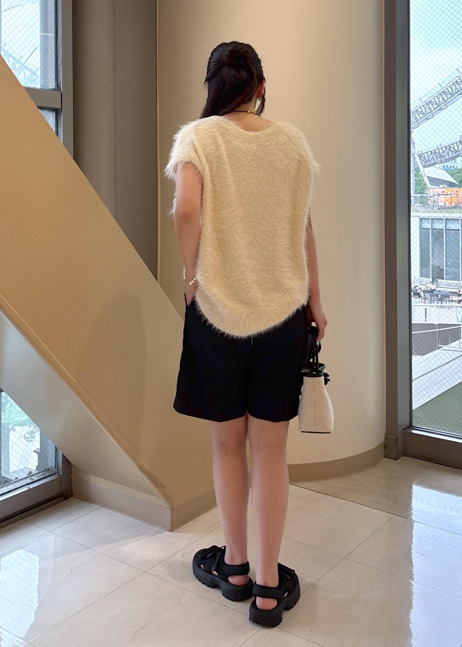 季節先取りで秋見えするフェザーニットベスト。気持ち多めな肌見せで晩夏から着られるヘルシーなスタイルにしました。