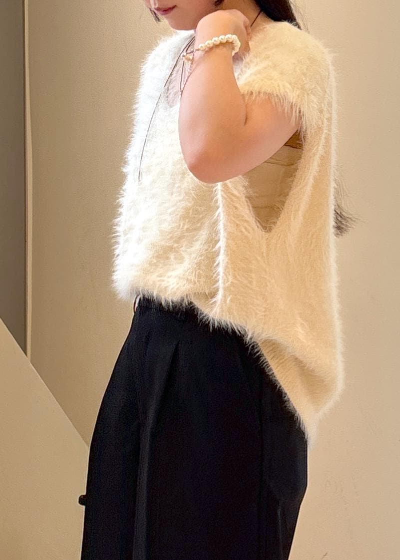 たっぷりの毛足感が様見えするフェザーニットベスト。とても柔らかな肌あたりでチクチク感は感じませんでした。身幅にゆとりがありカットソーや薄手のニットであれば着膨れ感なく重ねることができます。161cmが着用してヒップの三分の一が隠れるくらいの着丈でした。