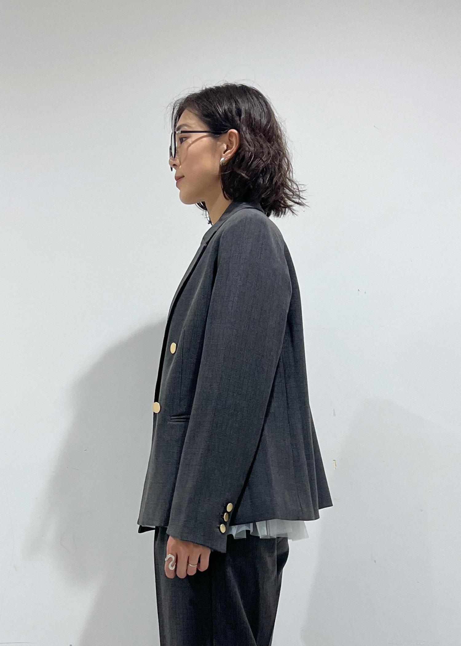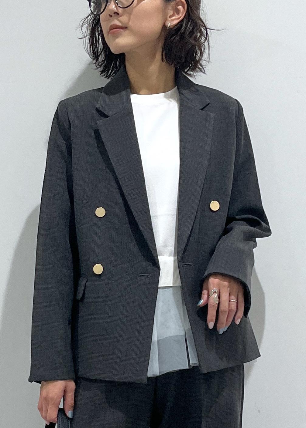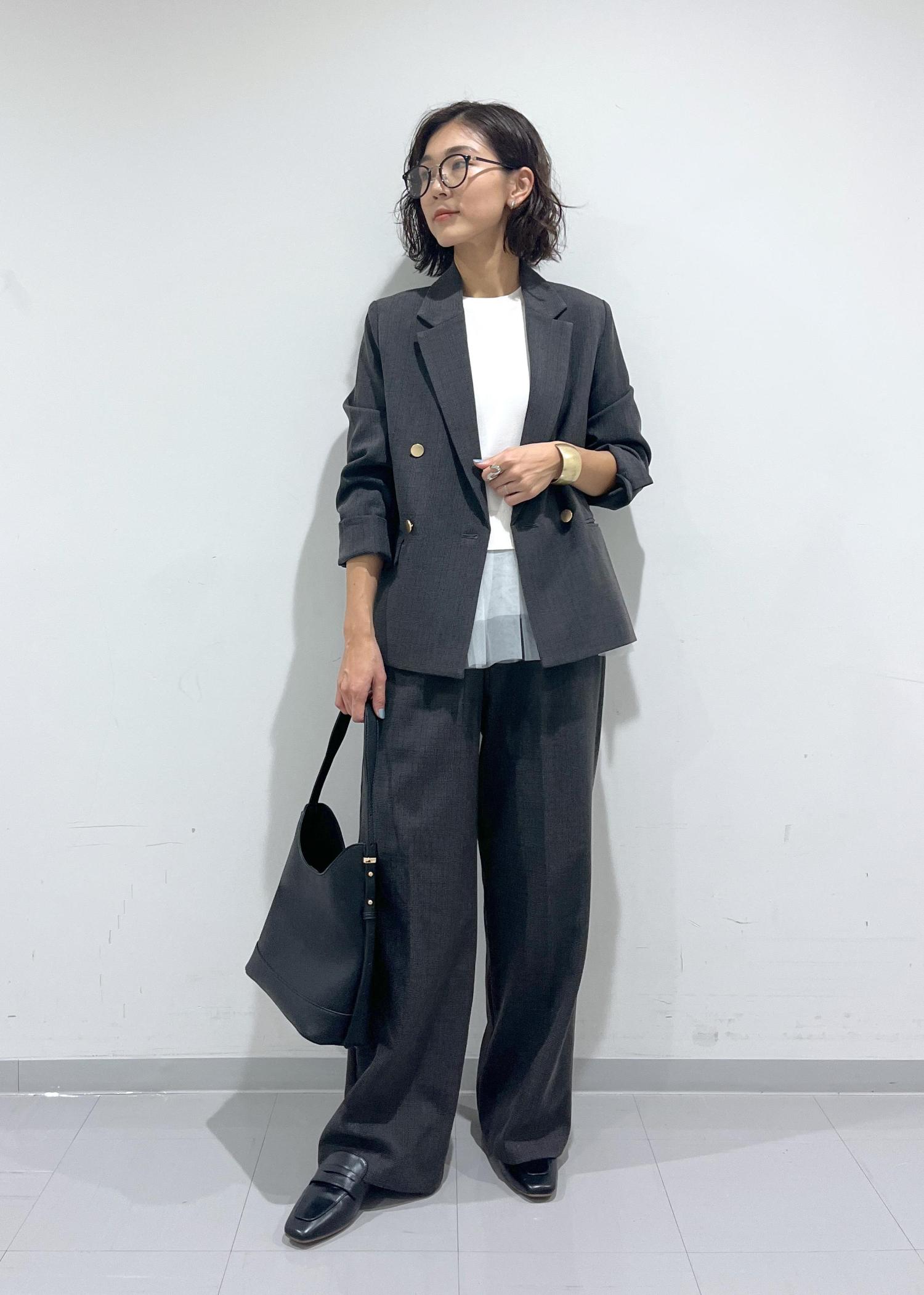 ダークトーンのセットアップですが、ゆったりとしたサイズ感とさりげないグレンチェックデザインが抜け感を出してくれるので、かっちりとしたオフィス感を抑えてくれます。