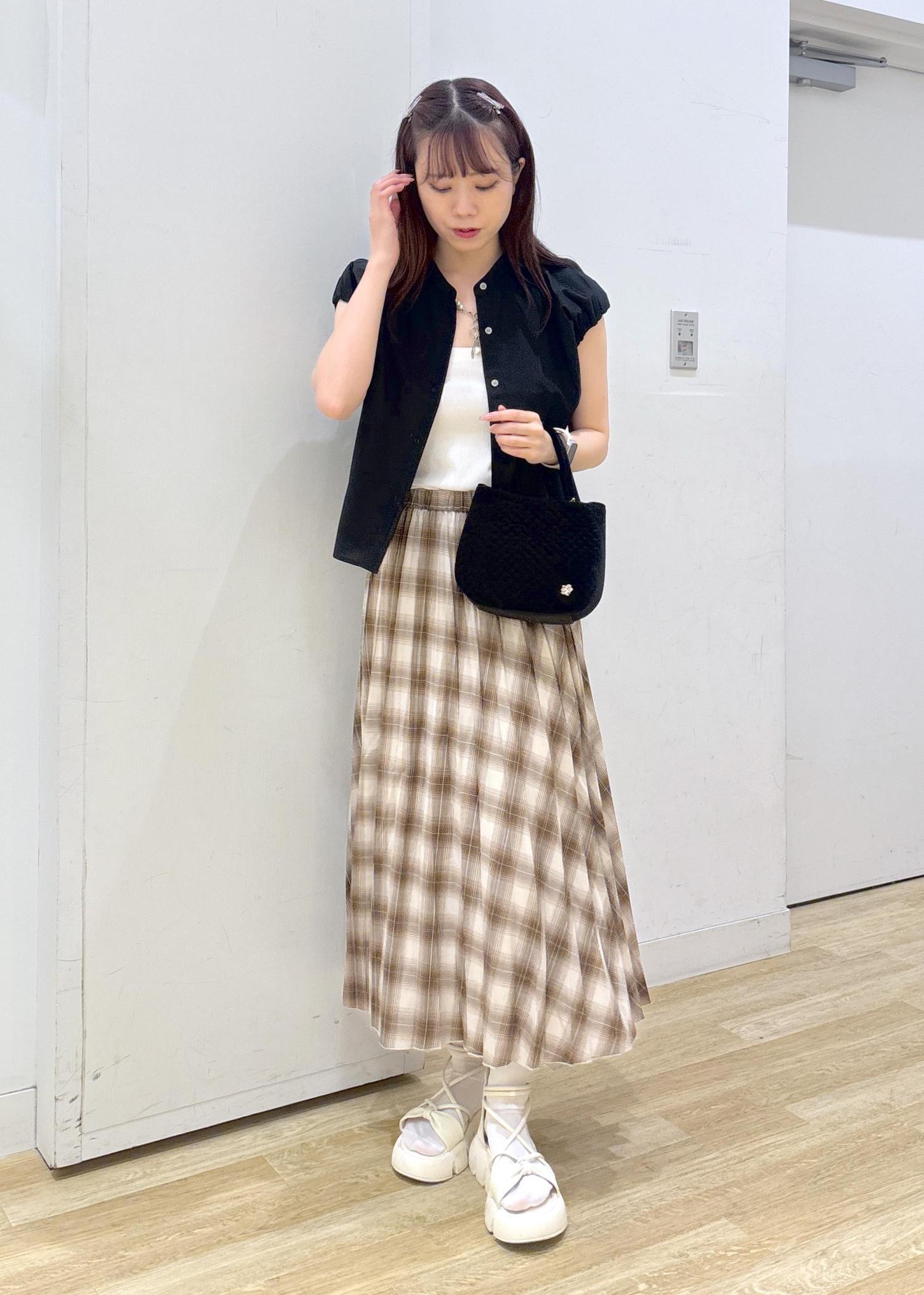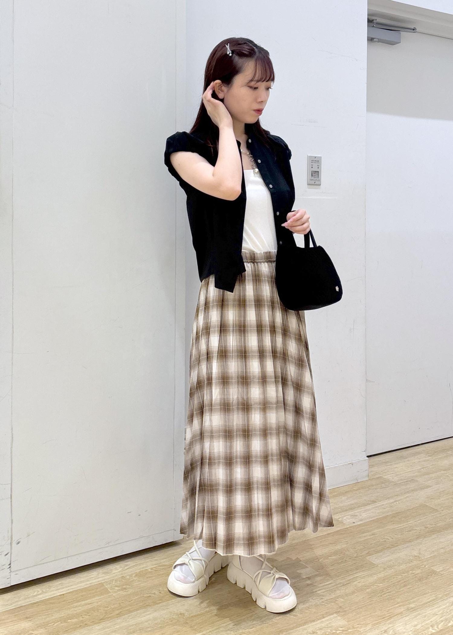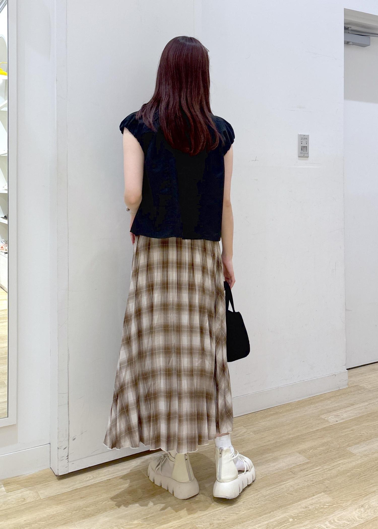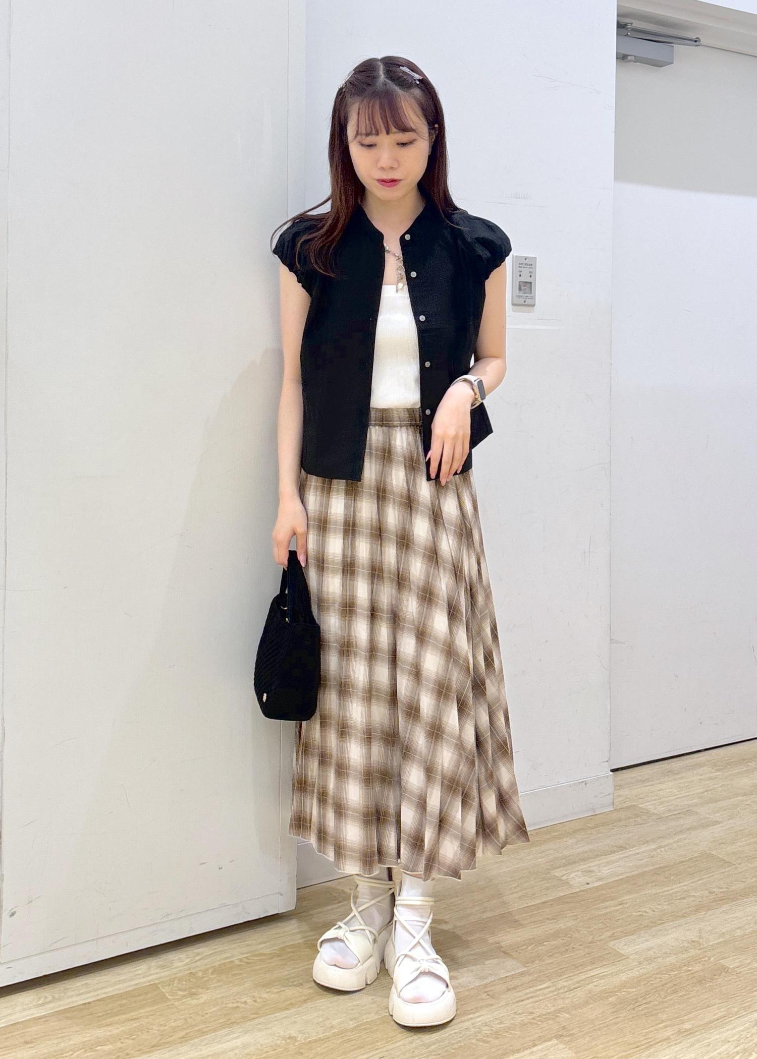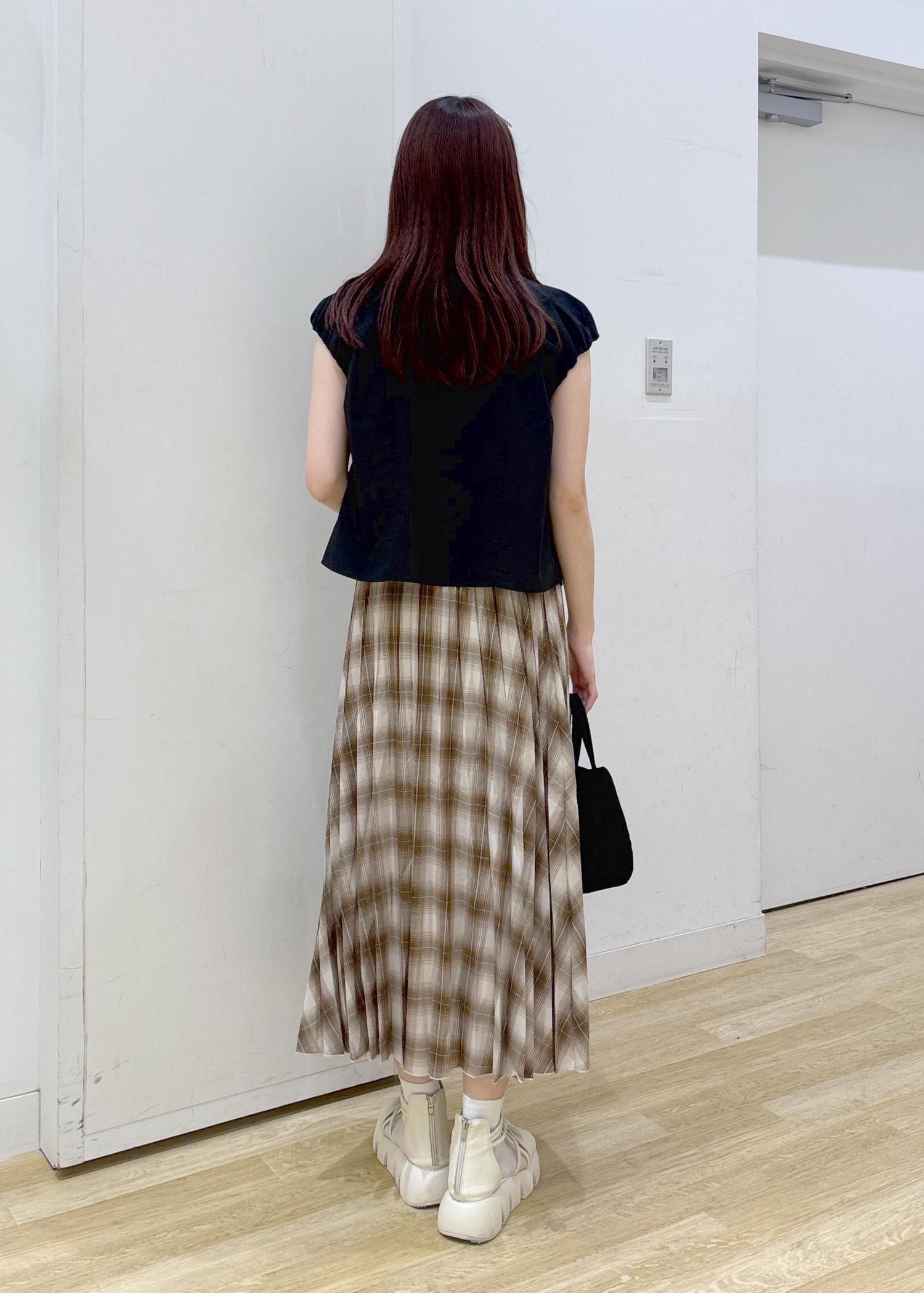 ブラックのブラウスとチェックスカートを合わせて秋らしいコーディネートに仕上げました◎