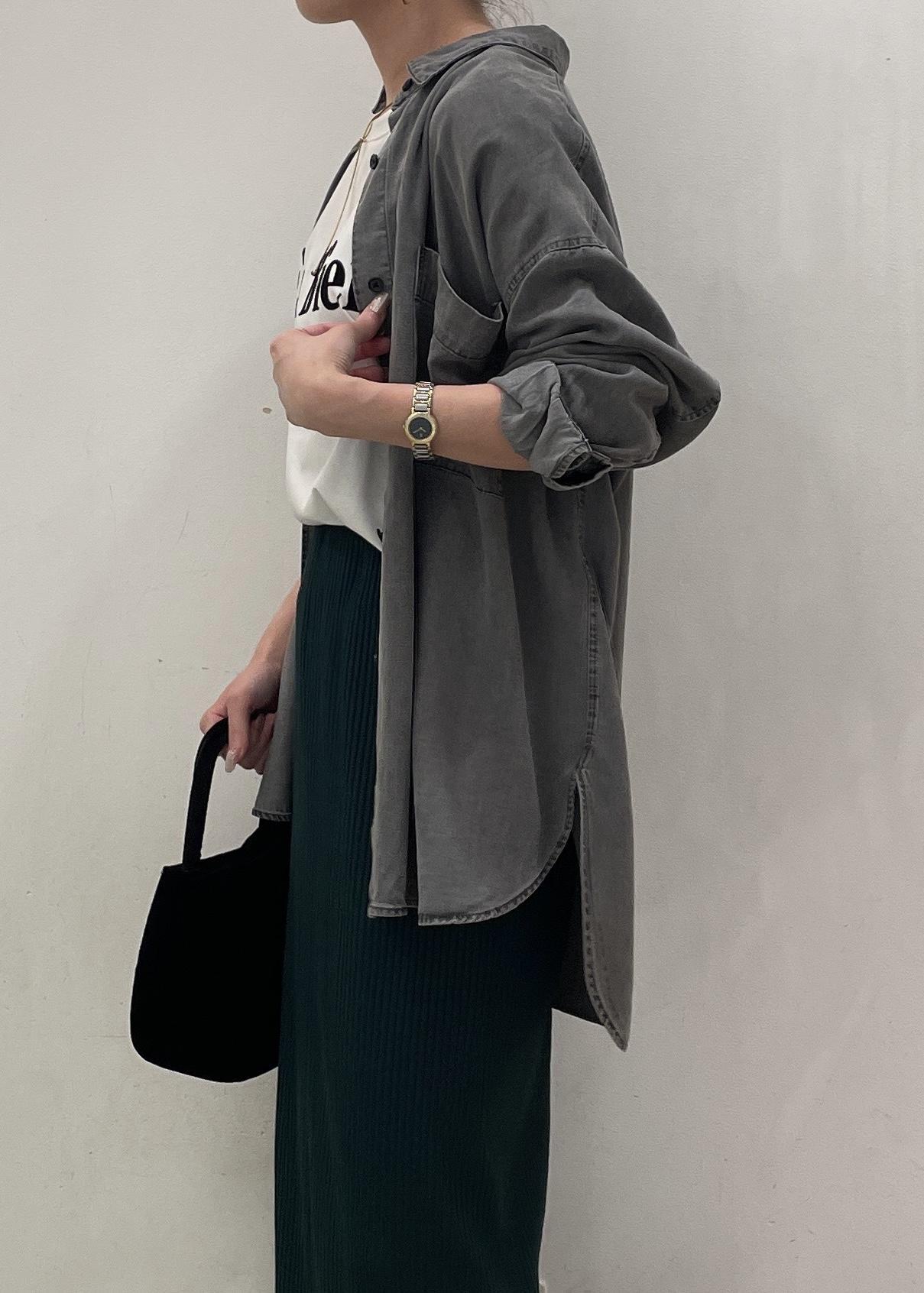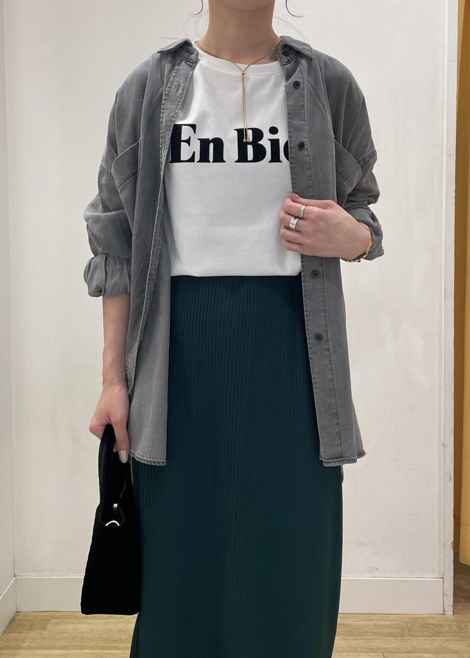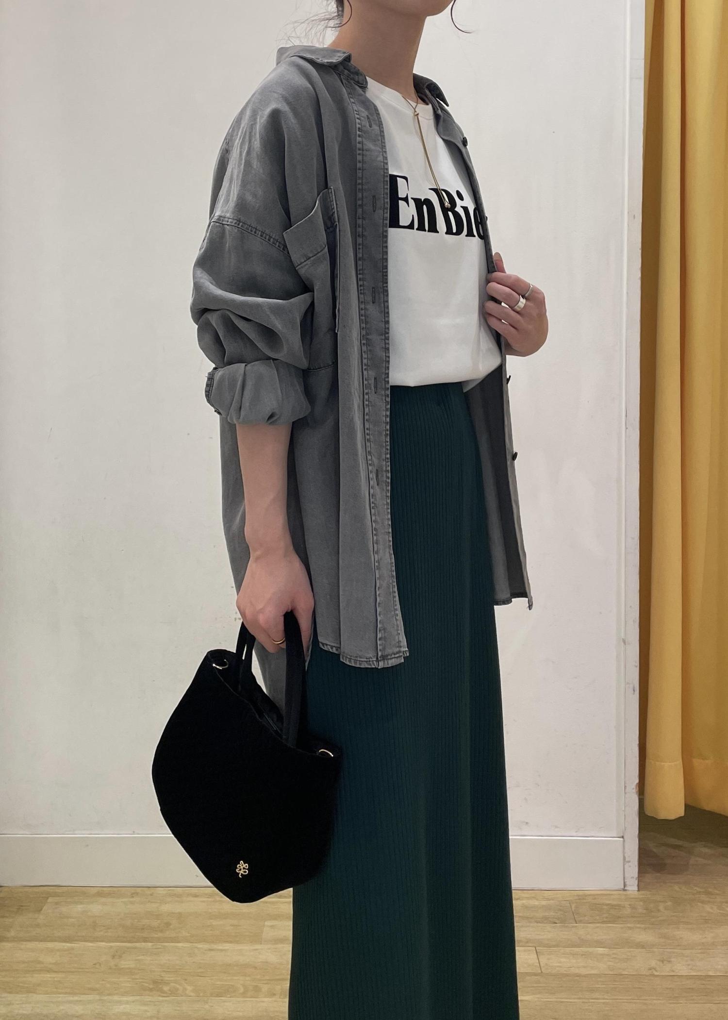 柔らかい生地感のデニム調シャツにTシャツを合わせボトムは深みのあるグリーンカラーを合わせた秋にオススメの大人カジュアルコーデです♡