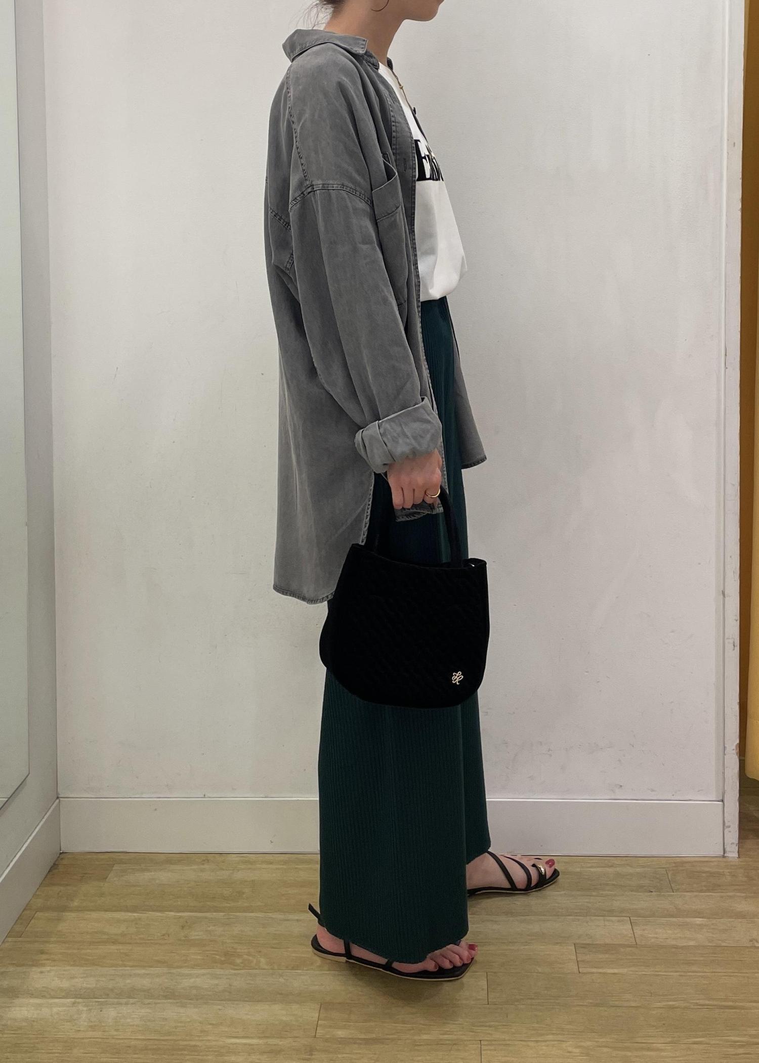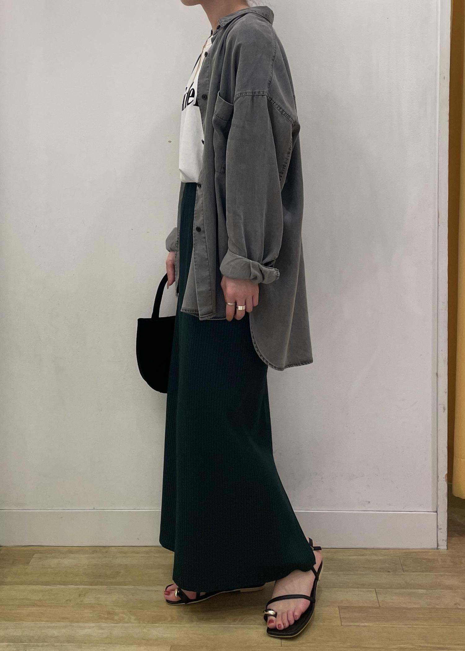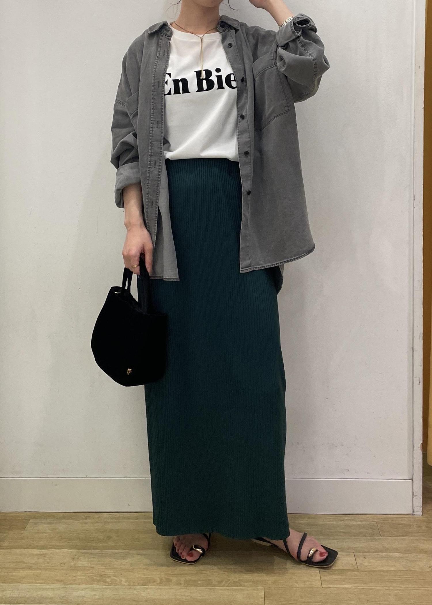 柔らかい生地感のデニム調シャツにTシャツを合わせボトムは深みのあるグリーンカラーを合わせた秋にオススメの大人カジュアルコーデです♡