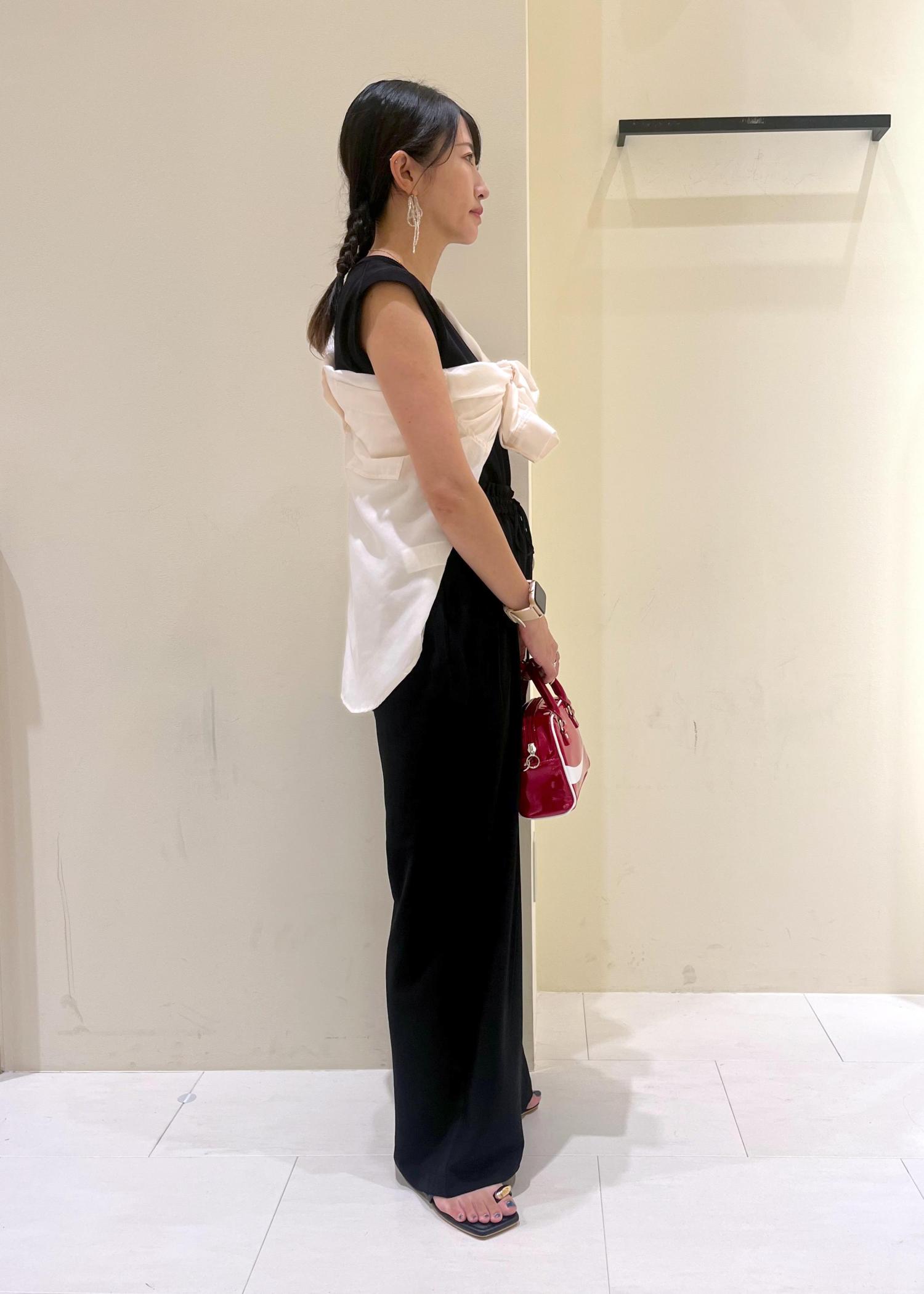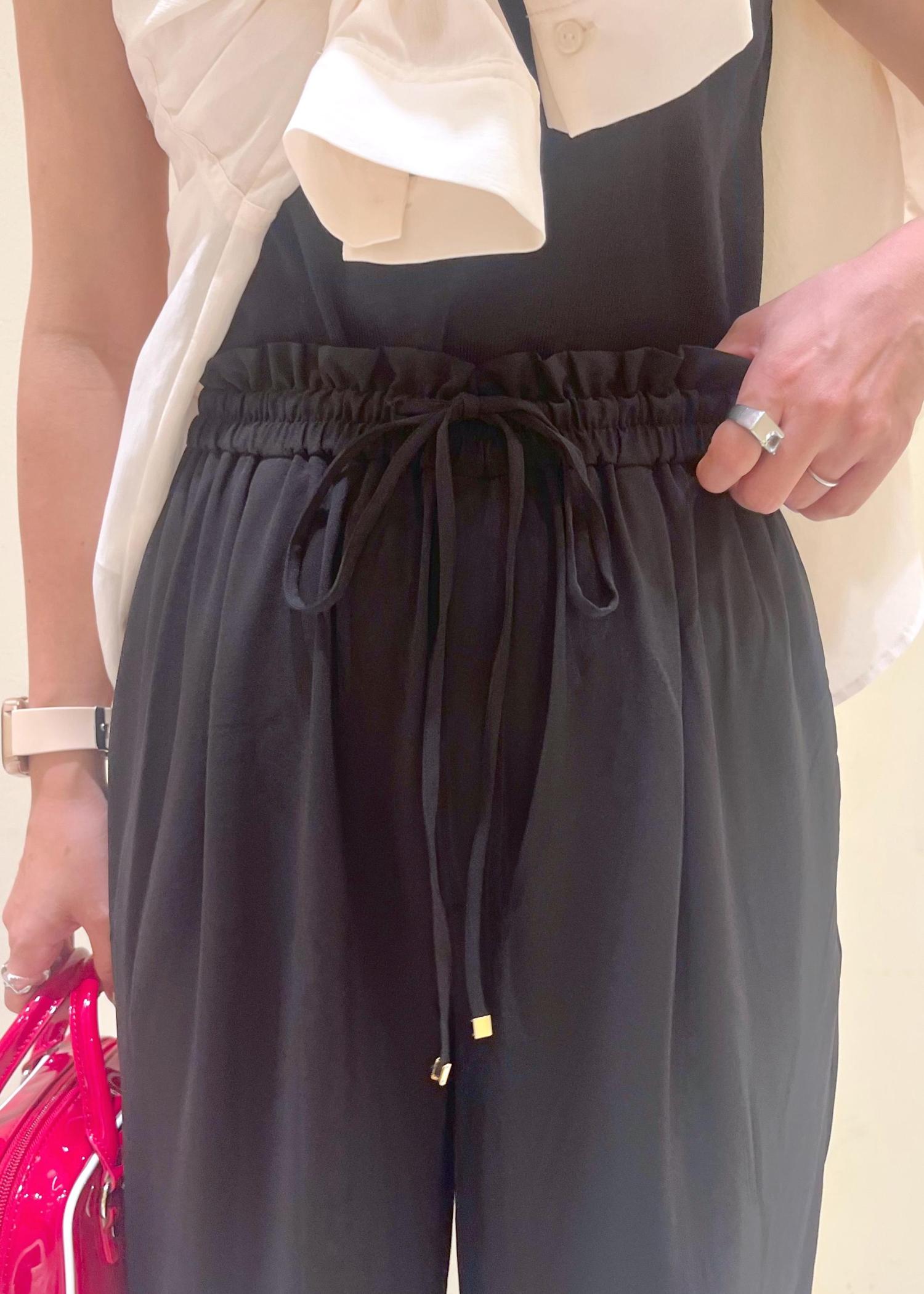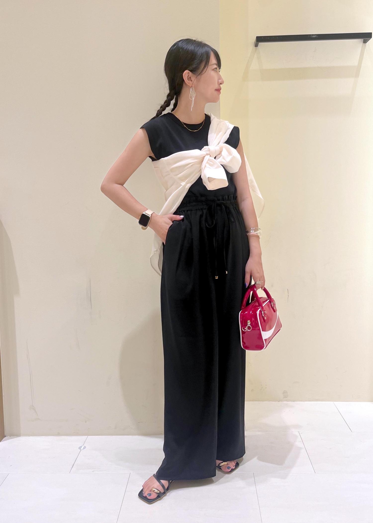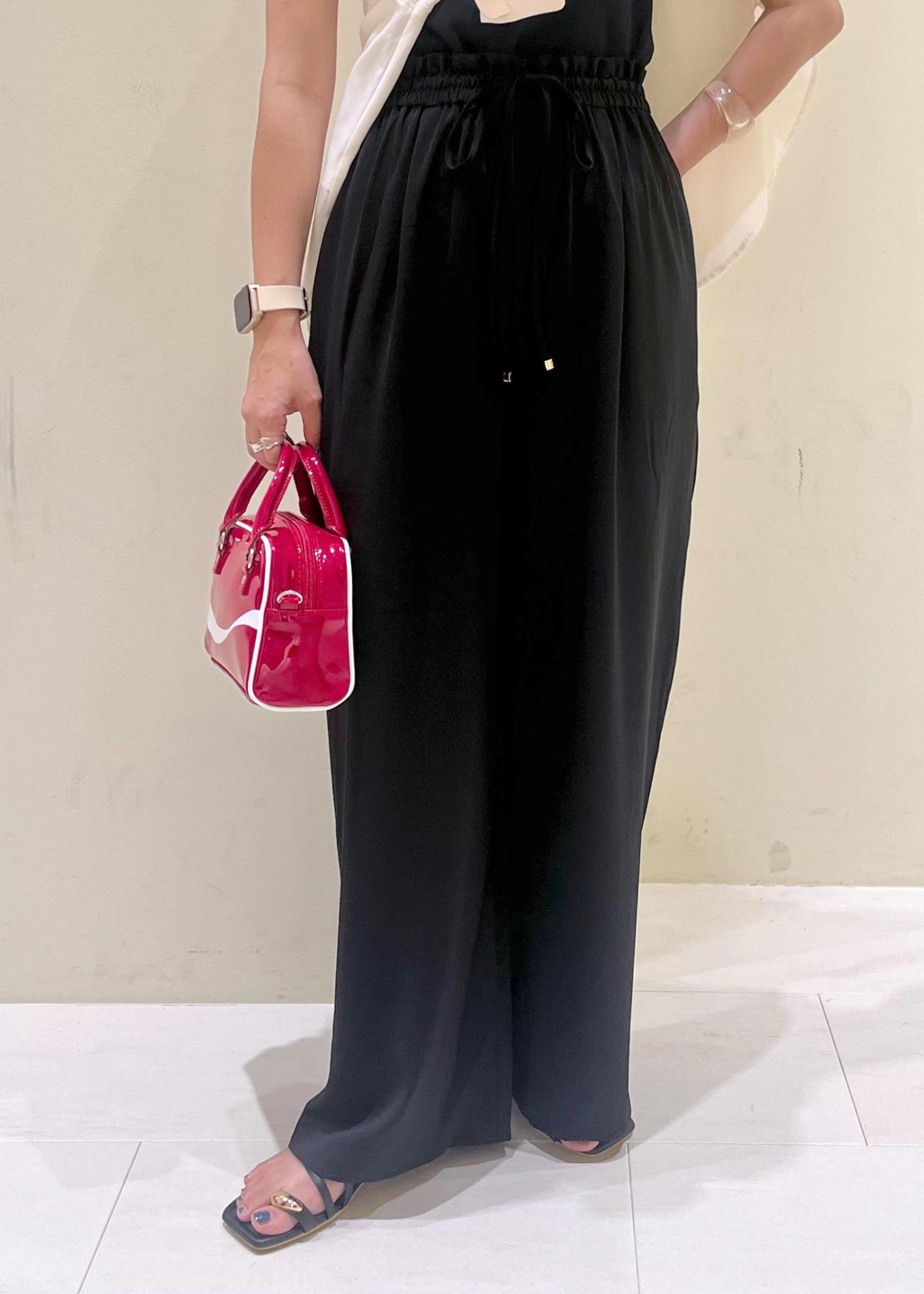ウエストリボンで調整しやすく、とろみのある素材で体型を拾わず履きやすいデザイン。普段と同じサイズかワンサイズ小さくしてもスッキリ履けます◎