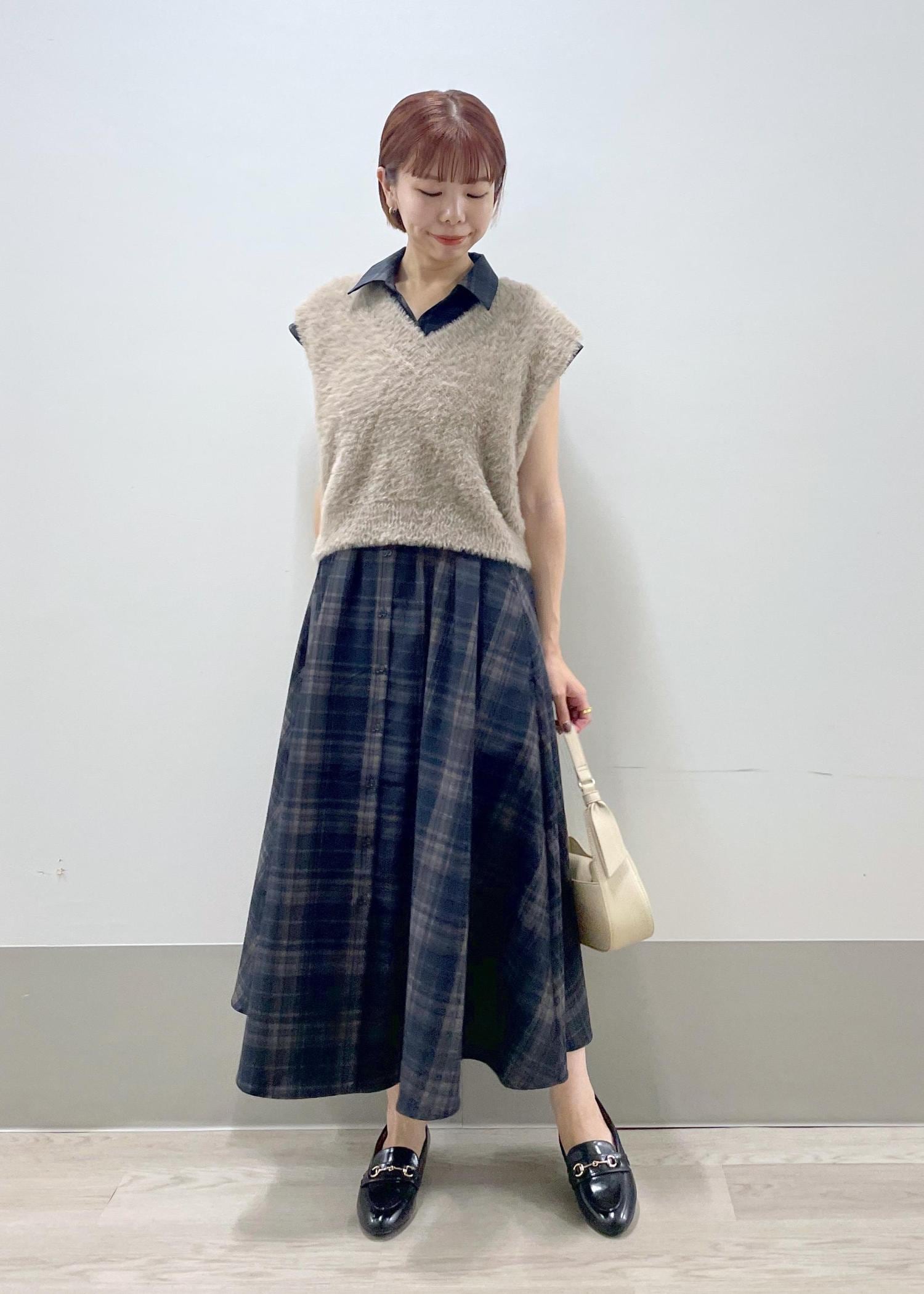 大人気のチェックワンピースにフェザーニットを合わせたレイヤードコーデ