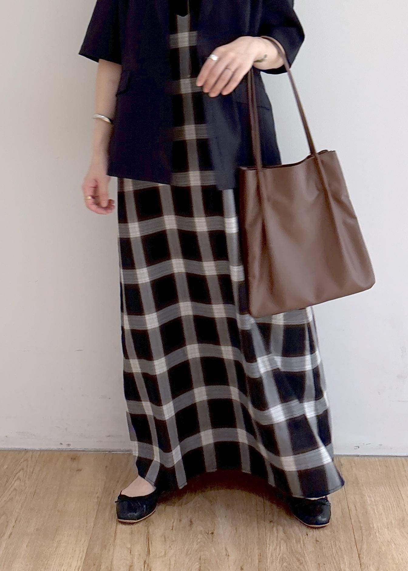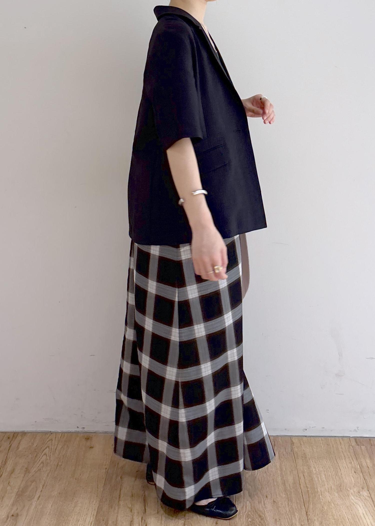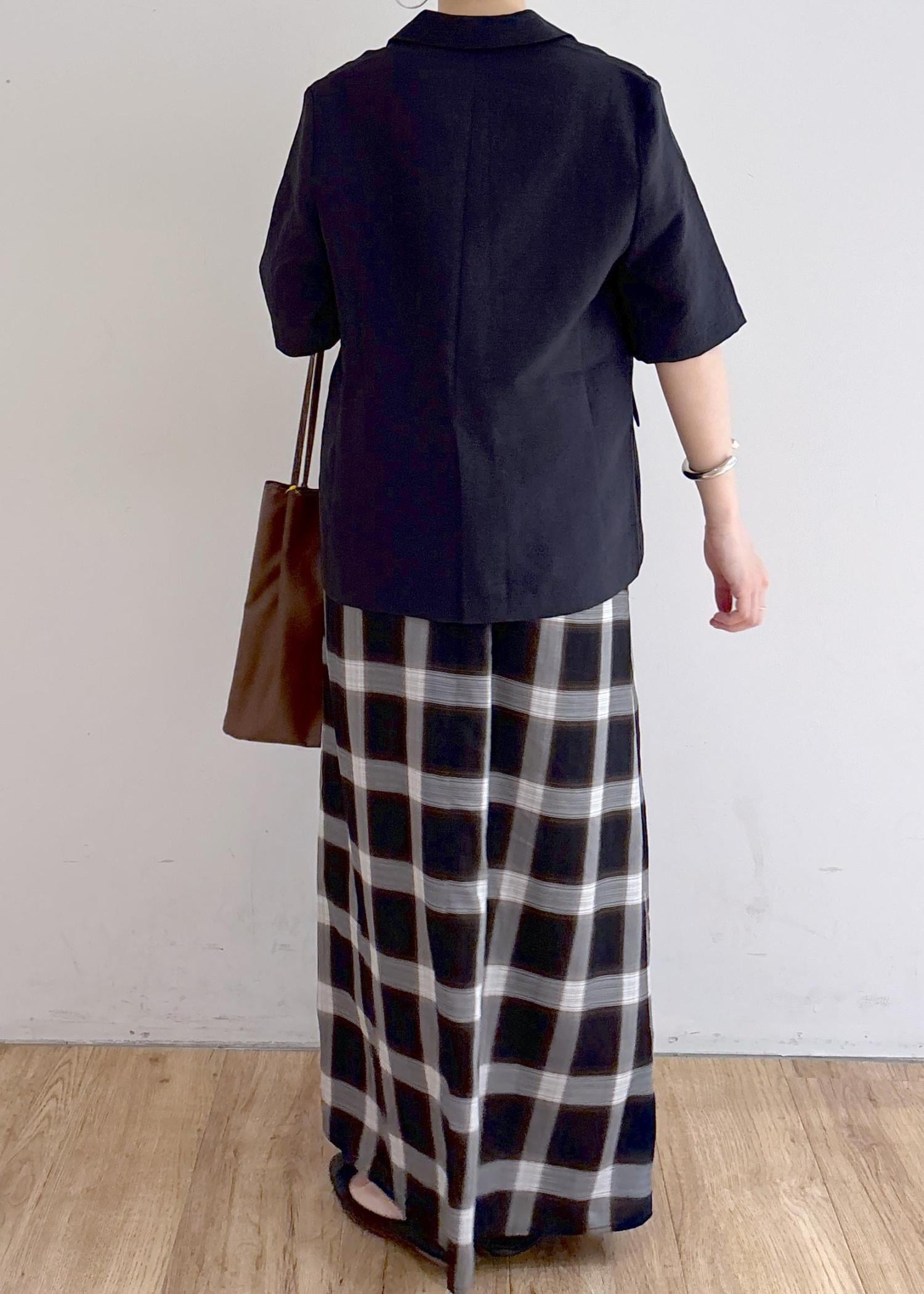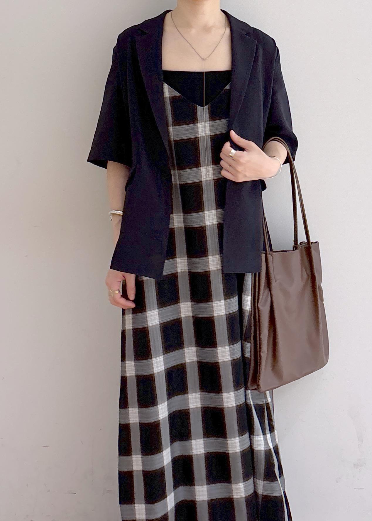 秋を感じさせるジャケットコーデです。またまだ暑い日が続きますが、落ち着いたトーンやチェック柄で秋を意識しました。