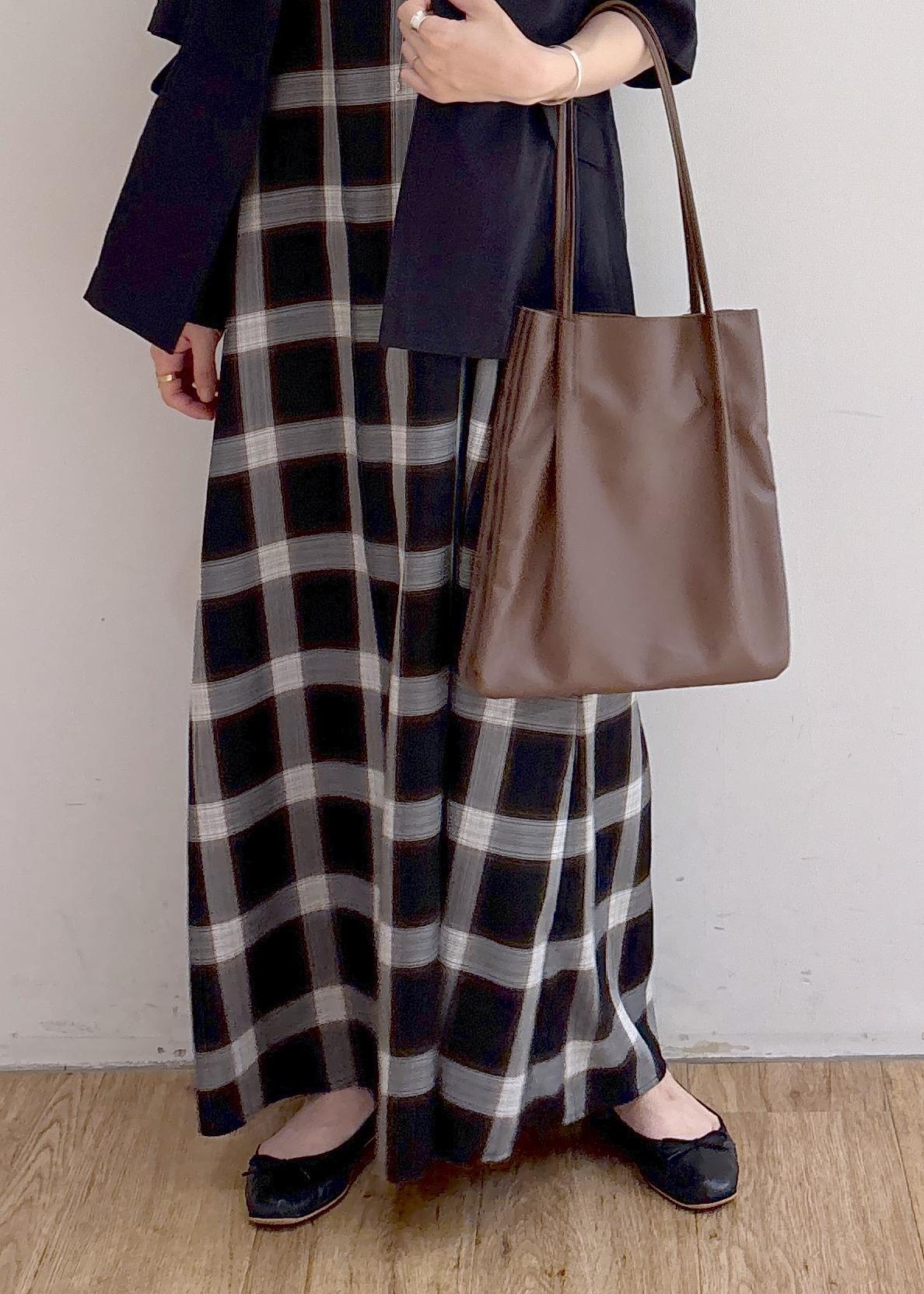 チェック柄が秋先取りなワンピースです。紐の調節が可能なので小柄な方も着用できます。私は長めに着たいのでぎりぎりの丈にしましたが、足首が見えるようにも調節できます。