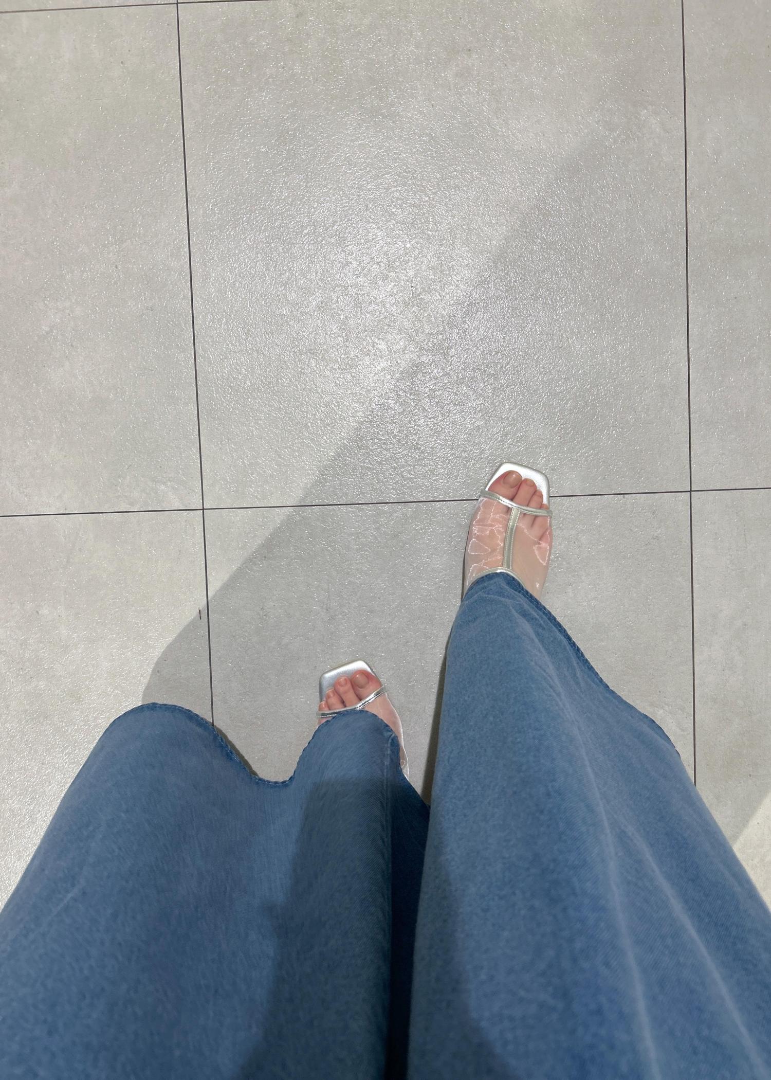 太めで安定感のあるヒールなので歩きやすい。シアー素材で涼しげなミュールサンダルです。