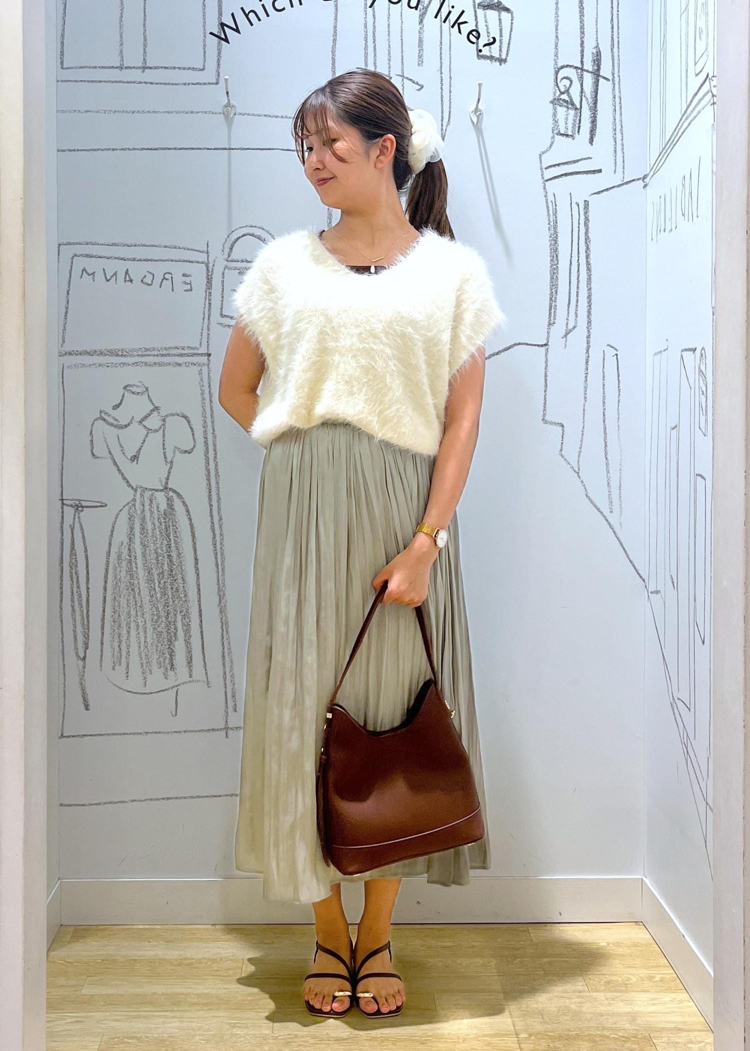 かわいさ詰まったふわふわなニットベスト×上品なスカートで組み合わせてみました!女性らしさを感じるネックレスと髪はポニーテールでシュシュをつけてみました。デートコーデにも最適です♡