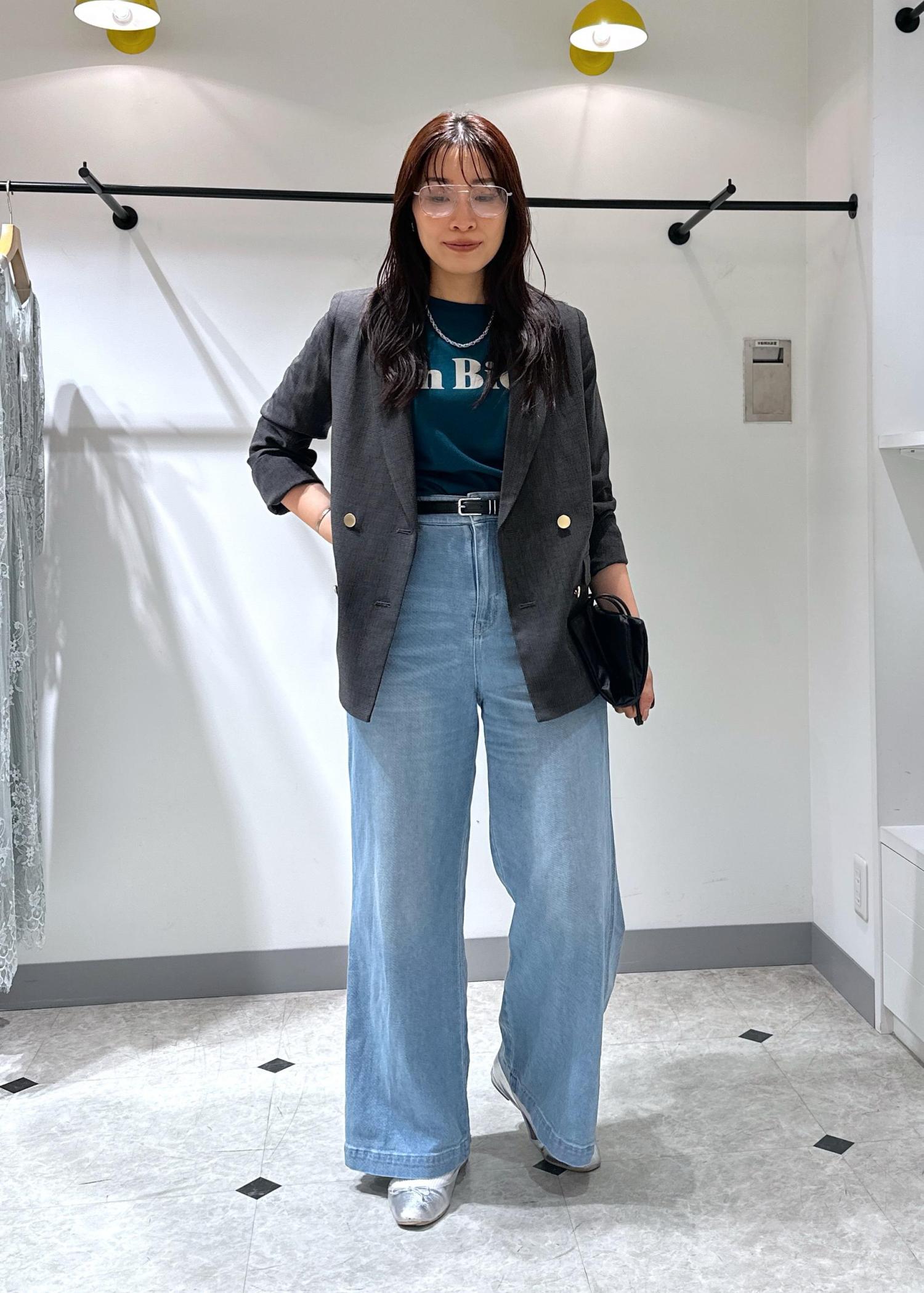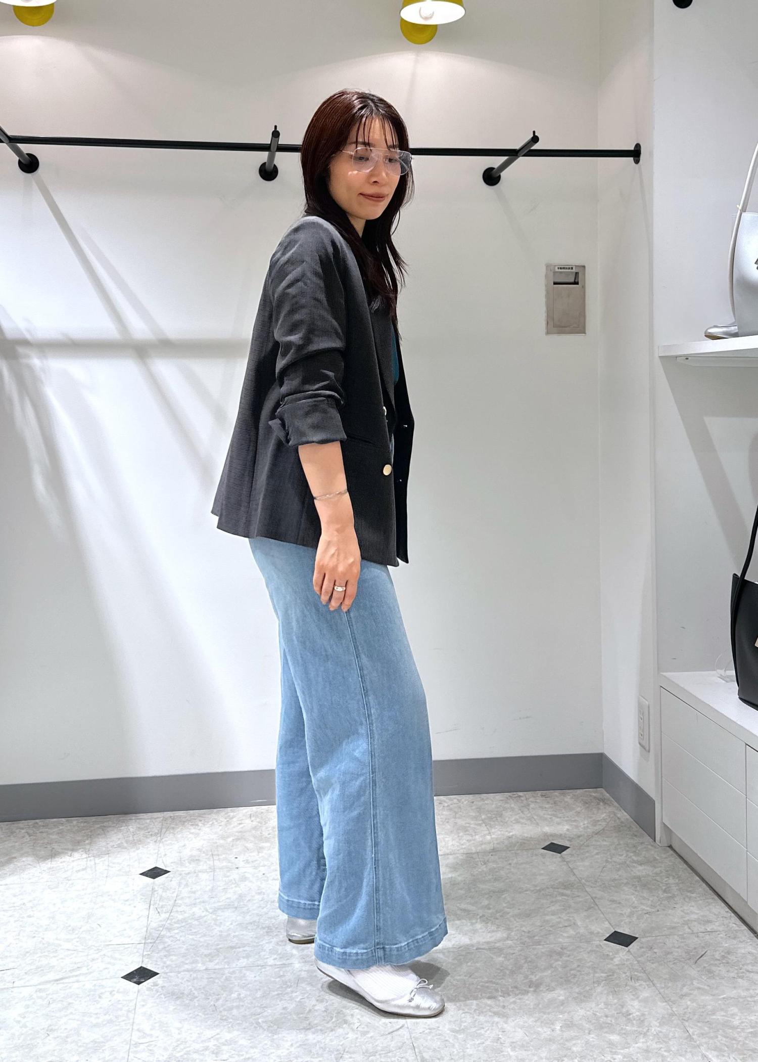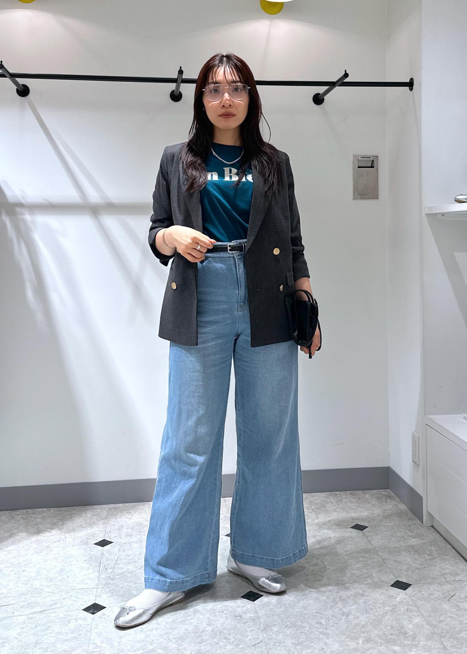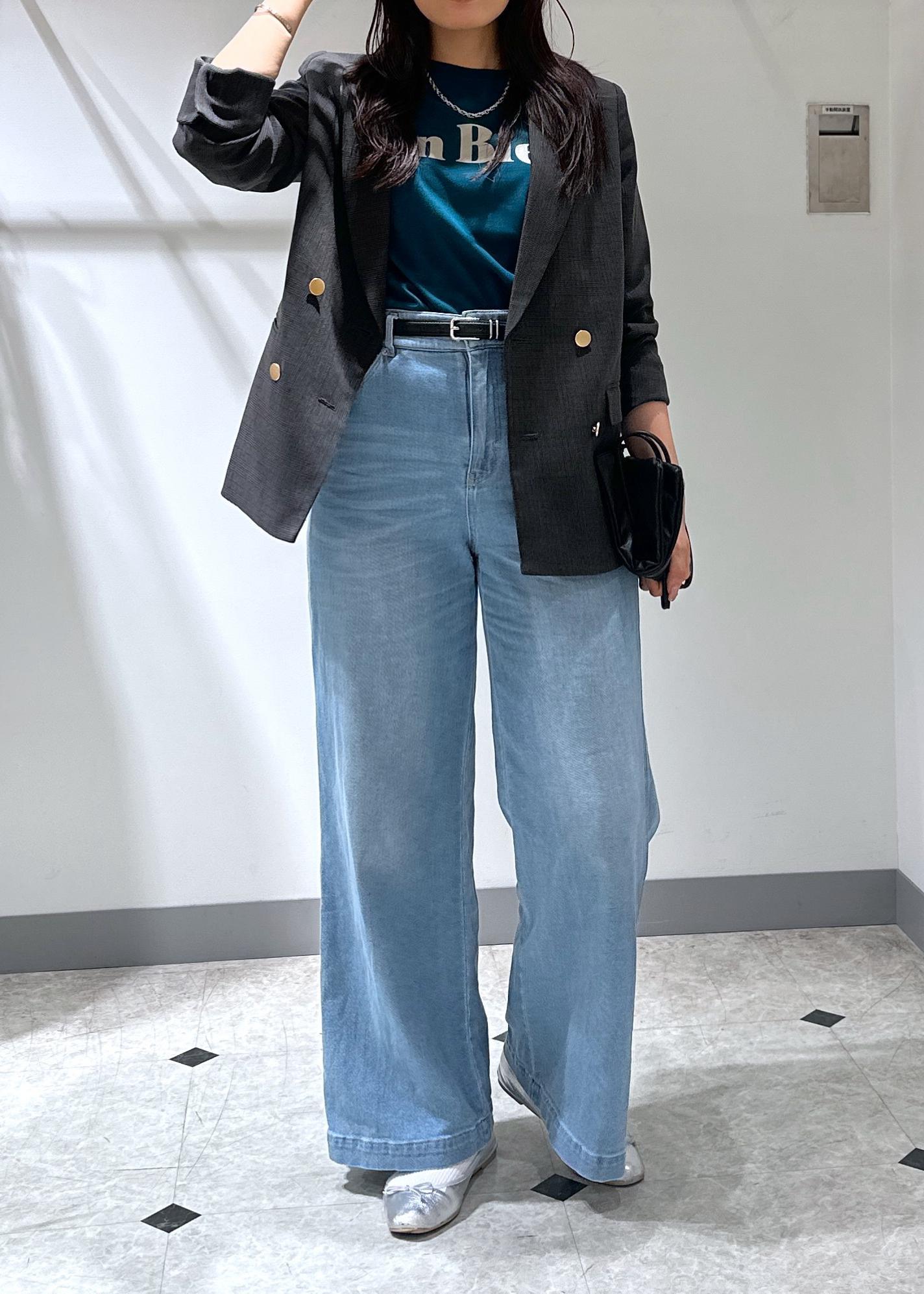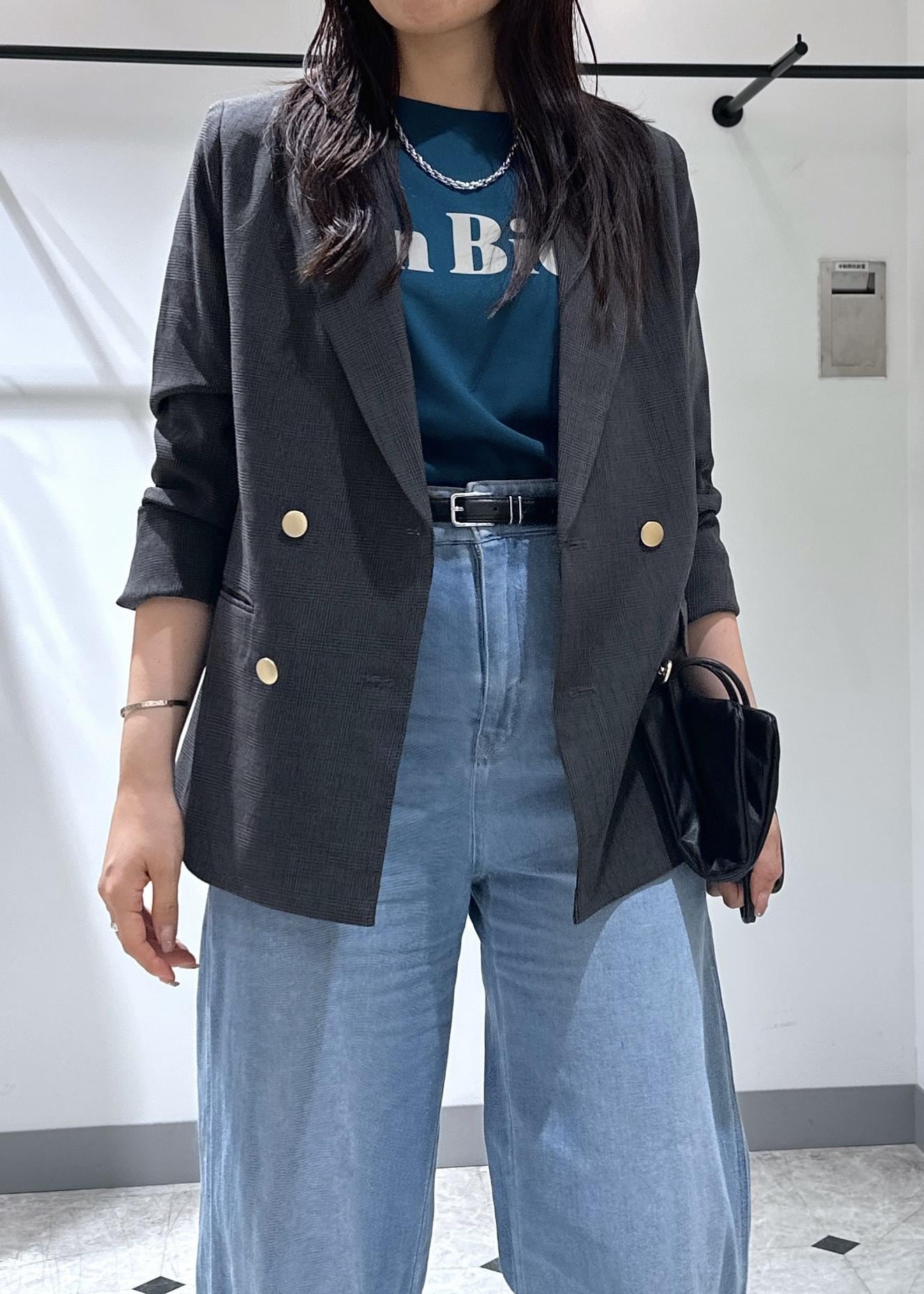 Tシャツ×デニムの夏の王道スタイルに大人気の金ボタンジャケットを羽織りました。