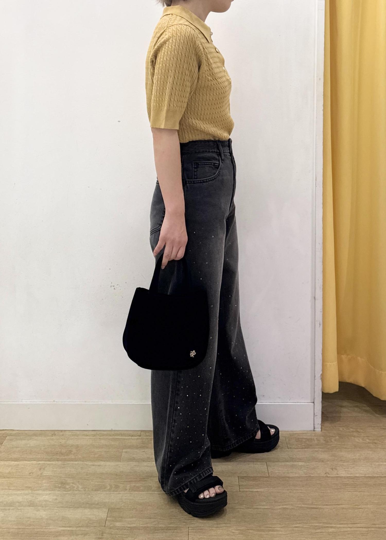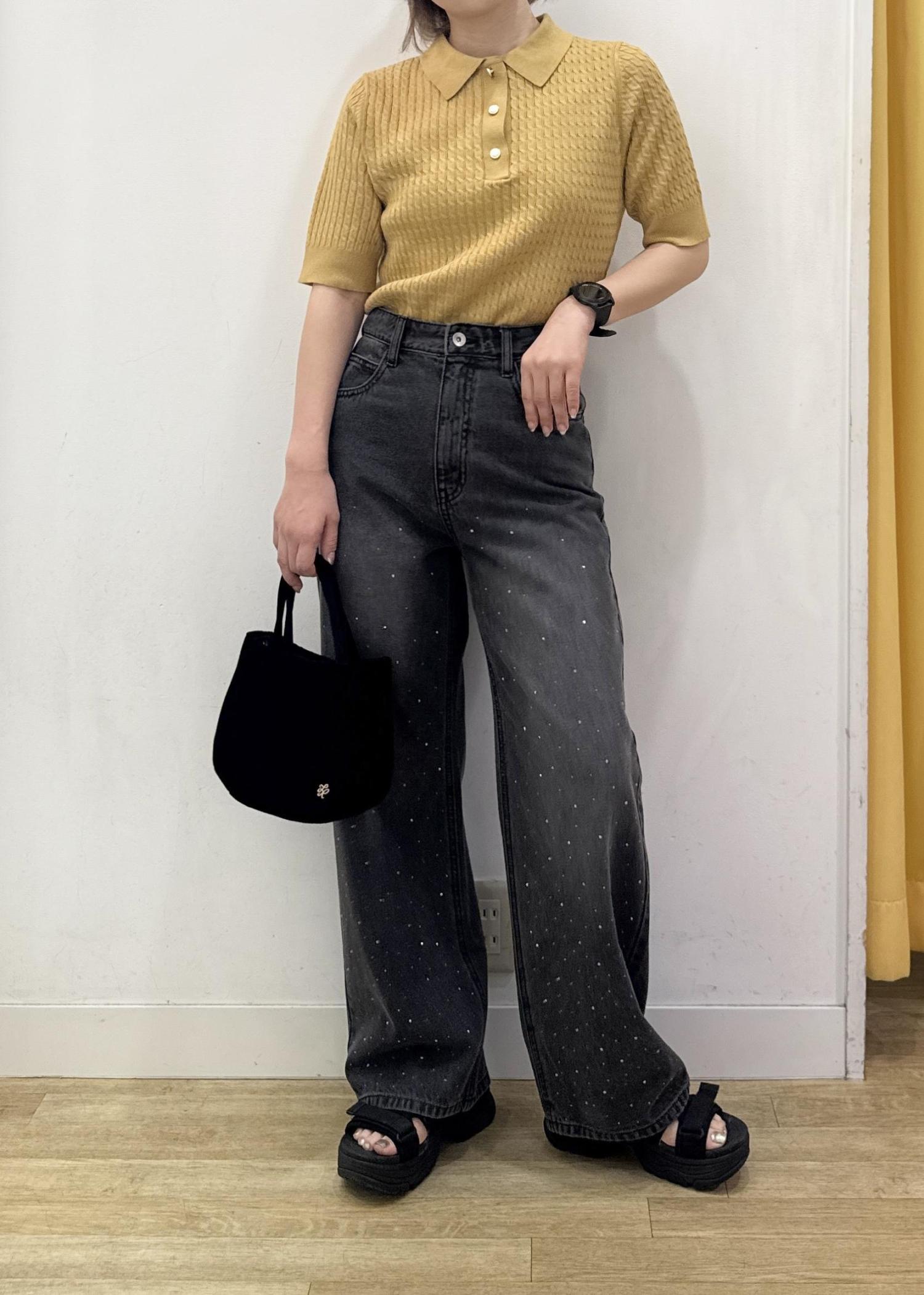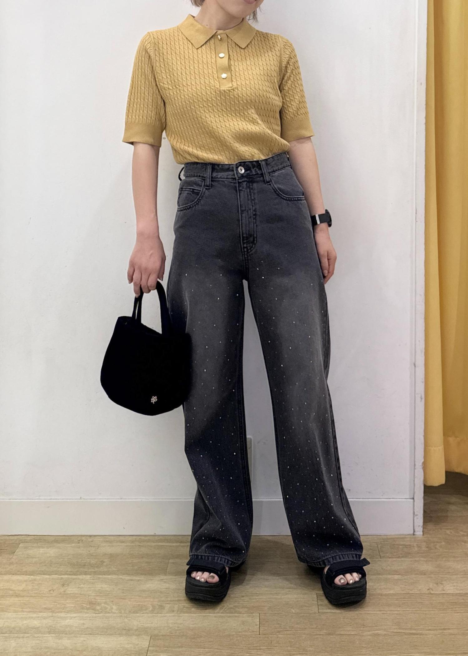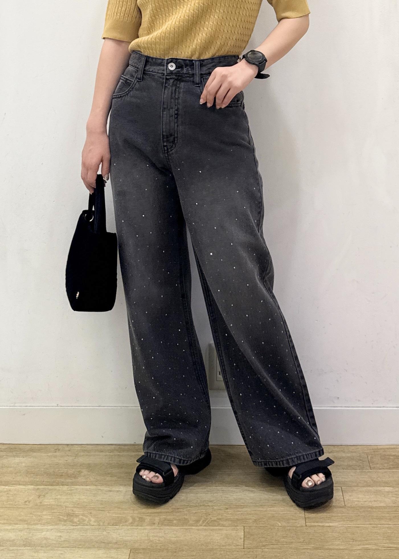 脚のラインは拾わないワイドシルエットで、カジュアルになりがちなデニムもビジューデザインで華やかに着ていただけます。 -