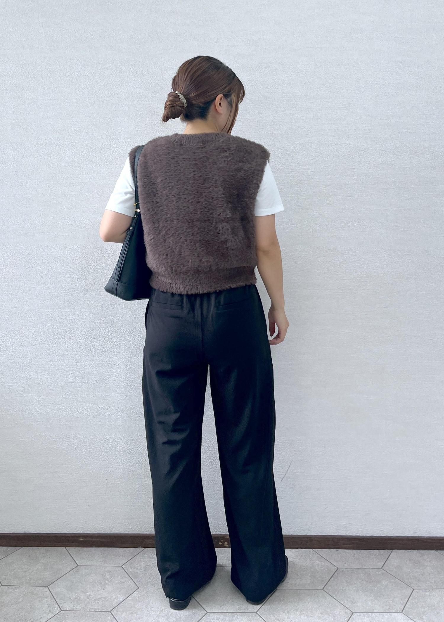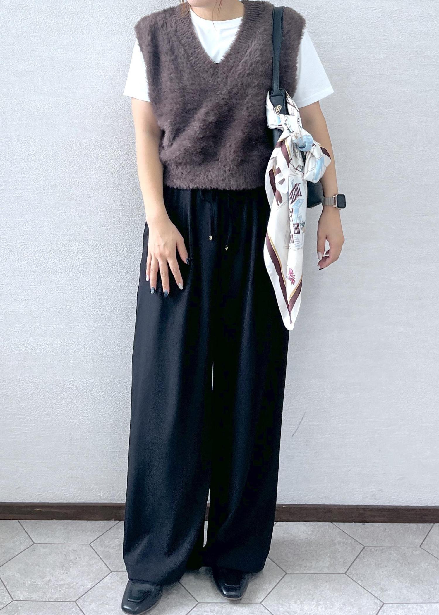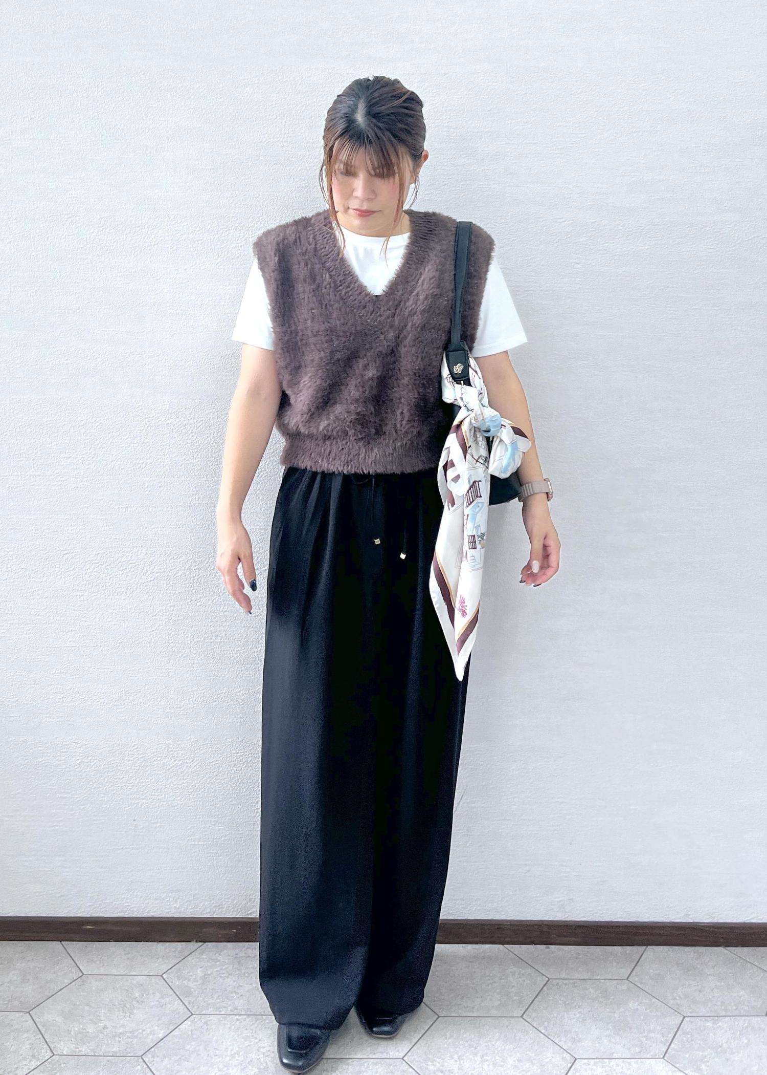 秋らしいヘザーニットベストを使って秋先取りコーデにしました!1枚でももちろん可愛いですが、Tシャツ合わせやシアーTシャツなども合わせるとかわいいです。
