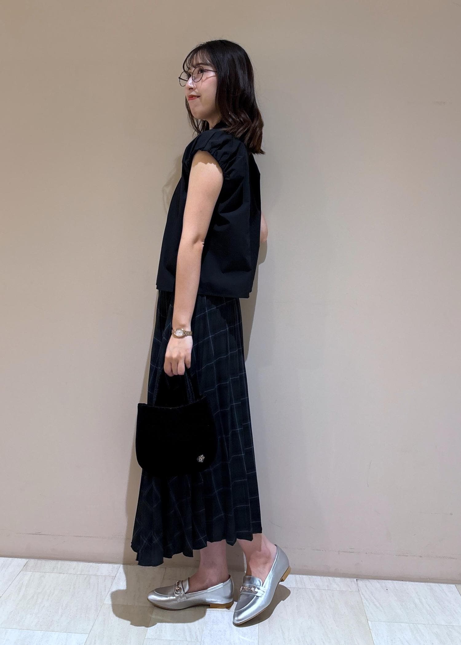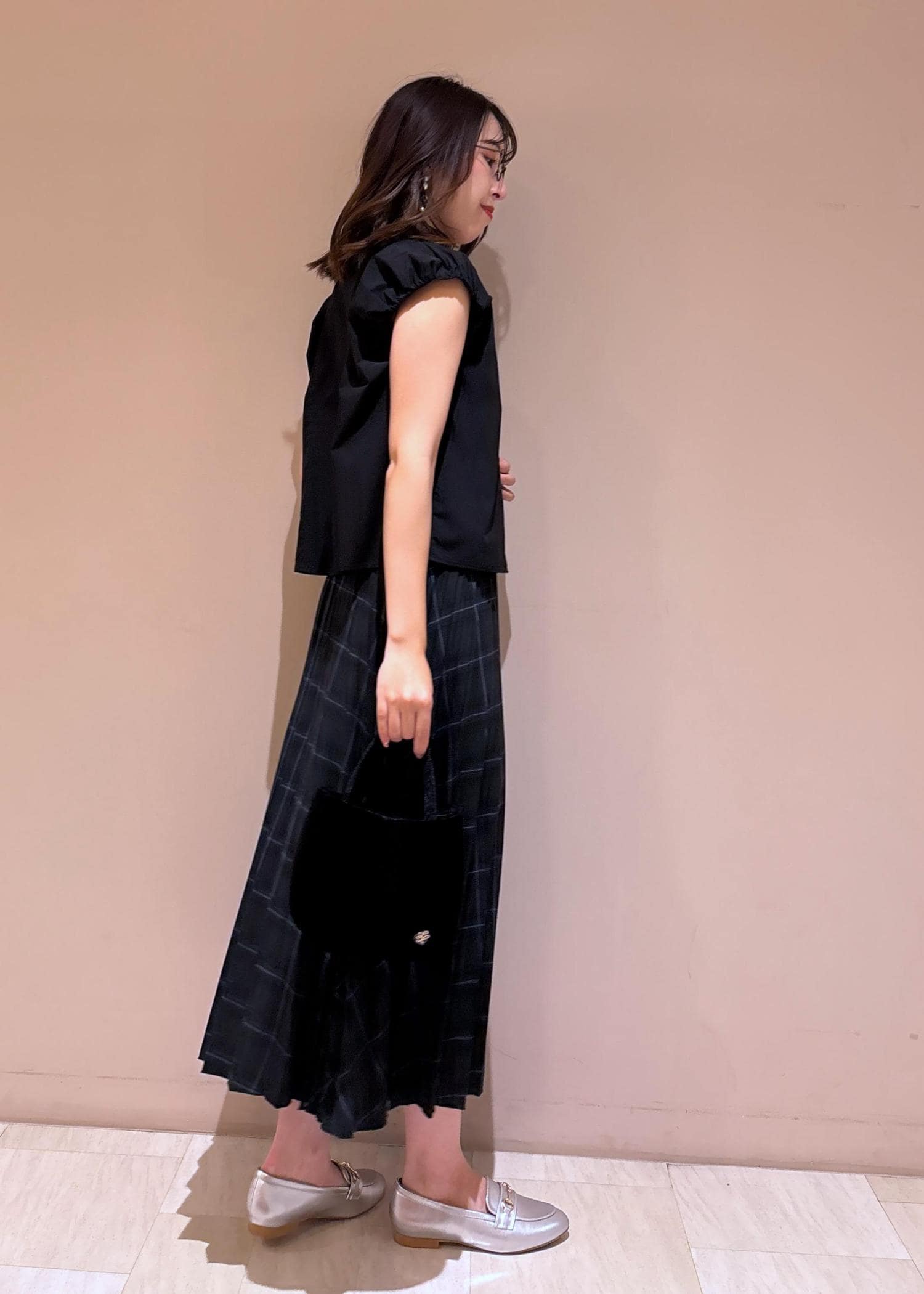 バッグもブラック、足元はキラッとシルバーで。