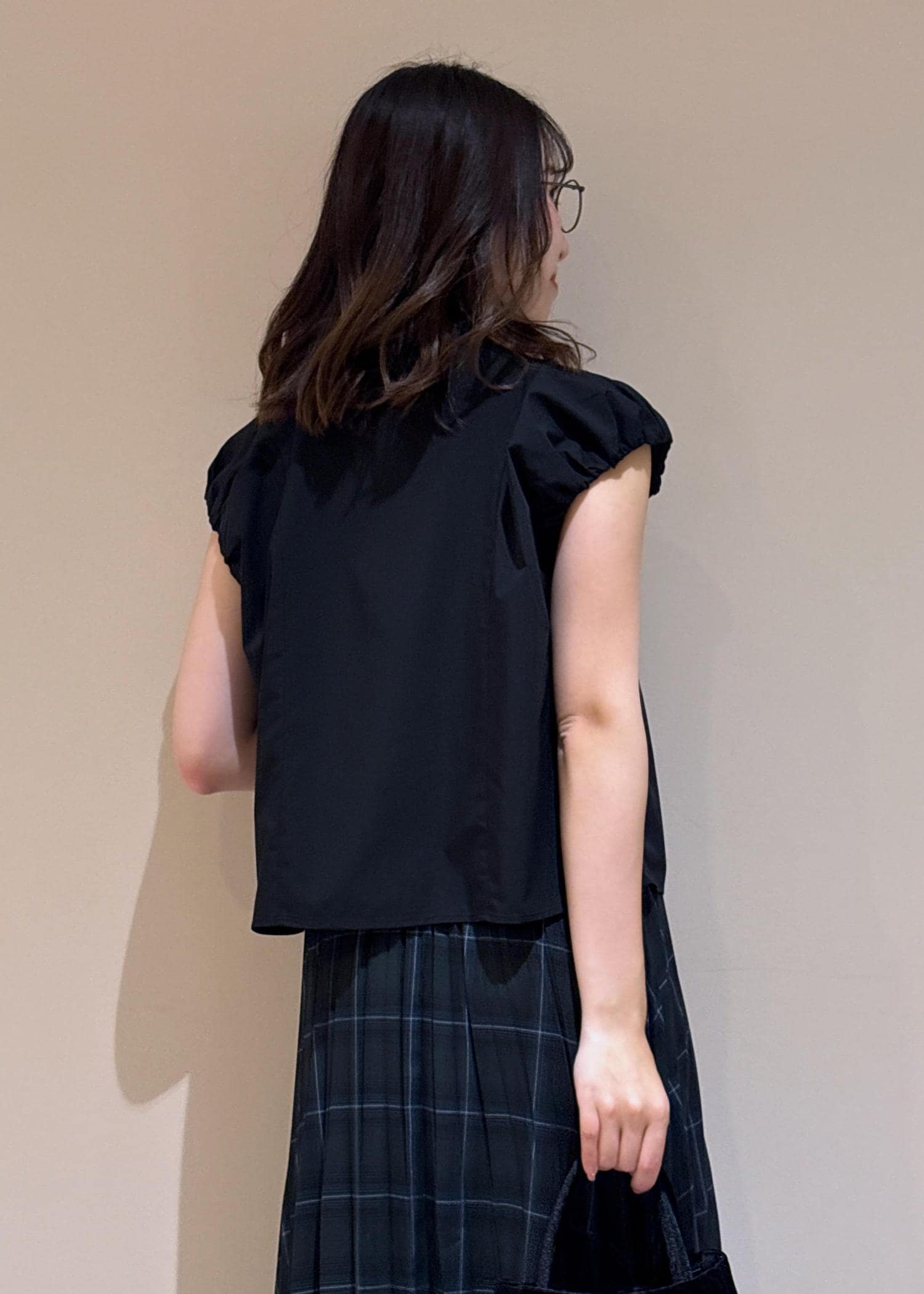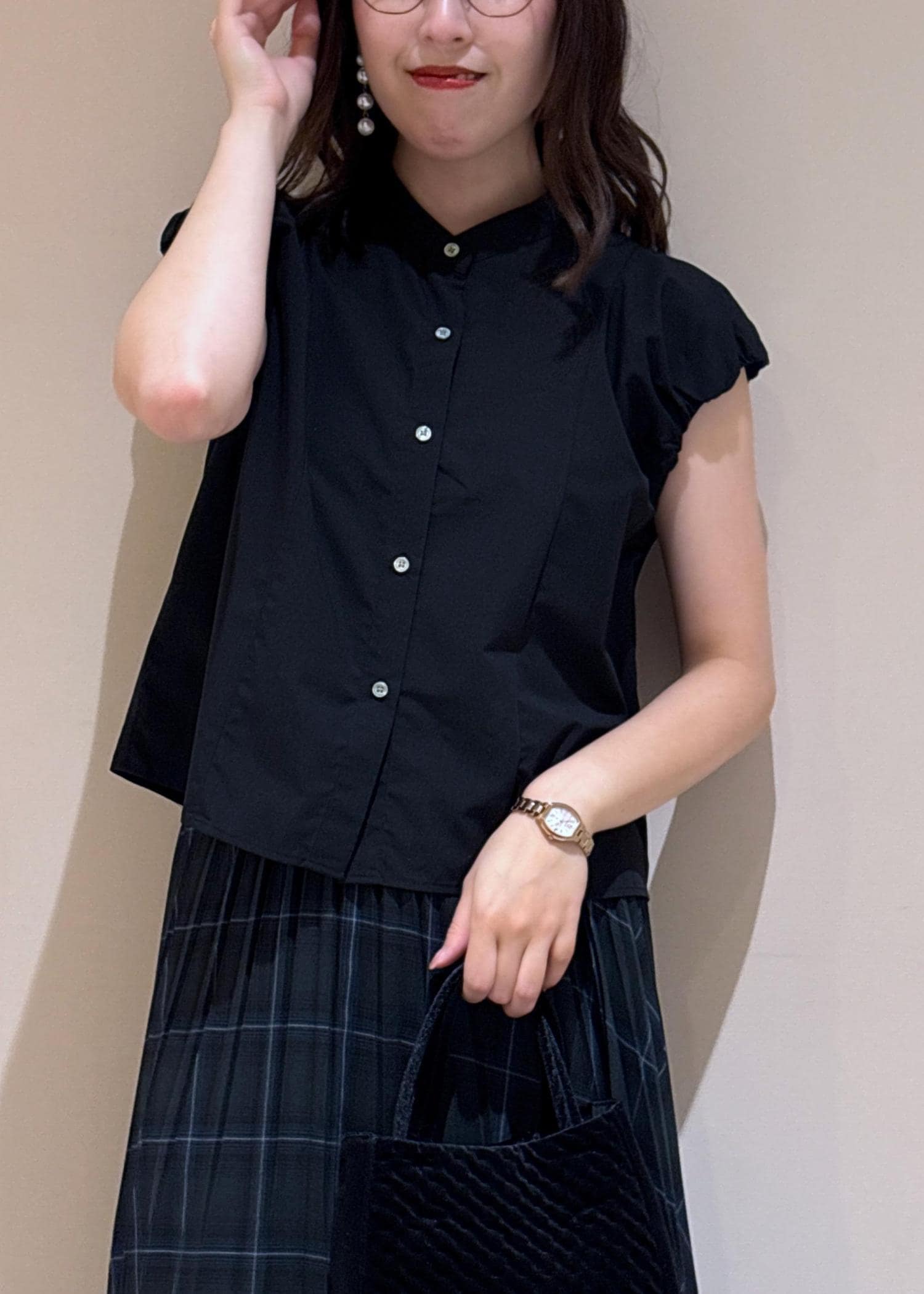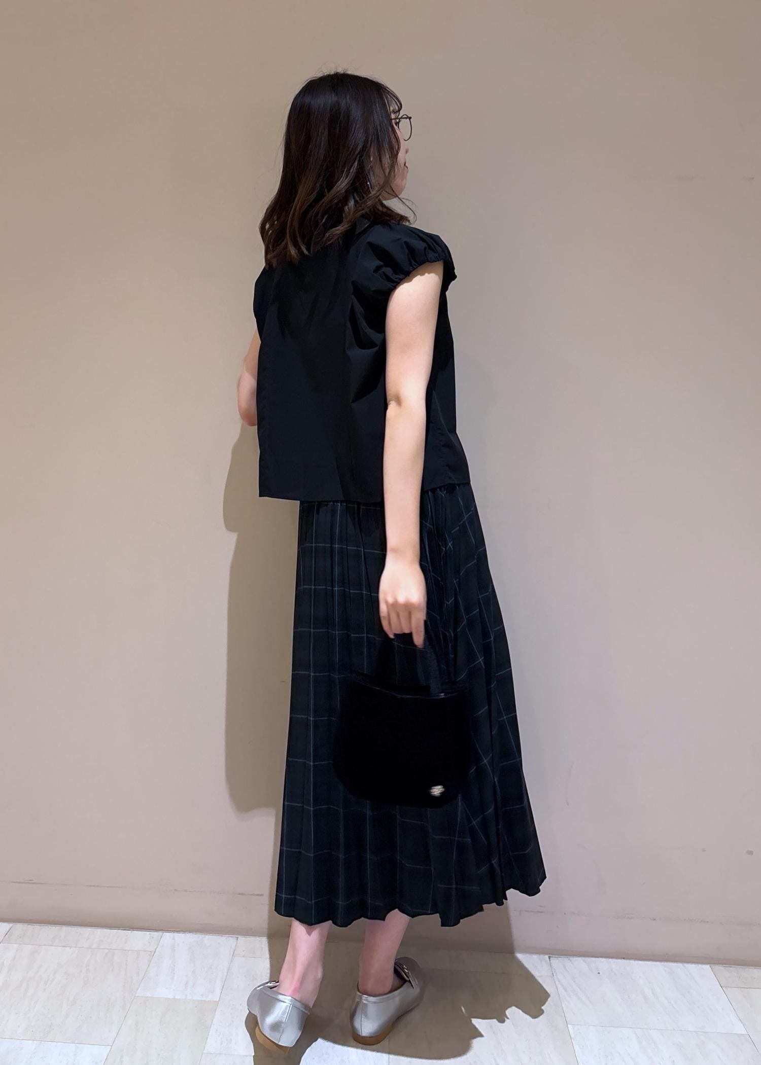 フレンチスリーブのブラウス×秋っぽいチェックスカートで、大人キレイめコーデに。
