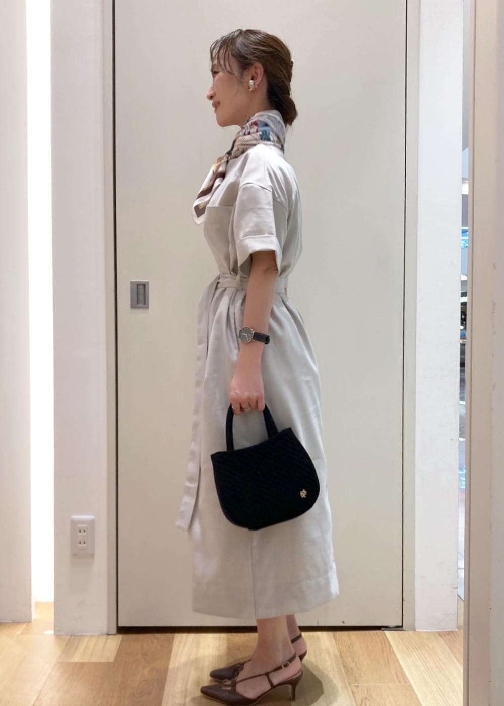 スカーフやシューズなどの小物は明度の低い同系色でまとめると引き締まって見えるのでおすすめです。