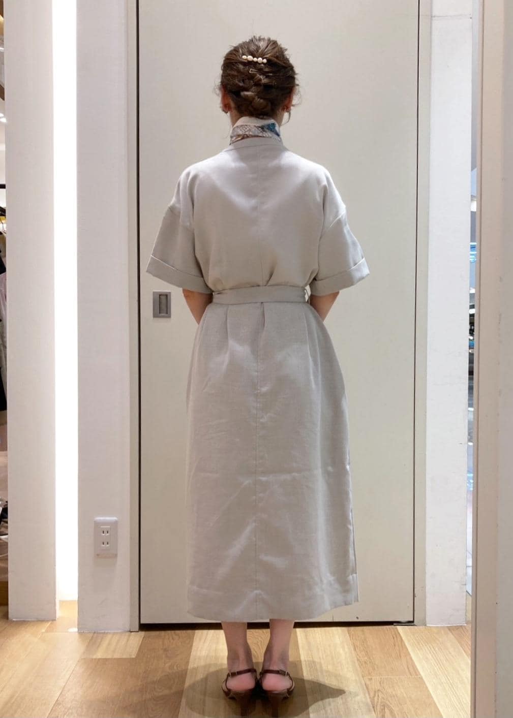 袋型でゆったりしたシルエットのサックワンピースですが、付属のベルトをしっかり締めることできちんと感が出てきます。