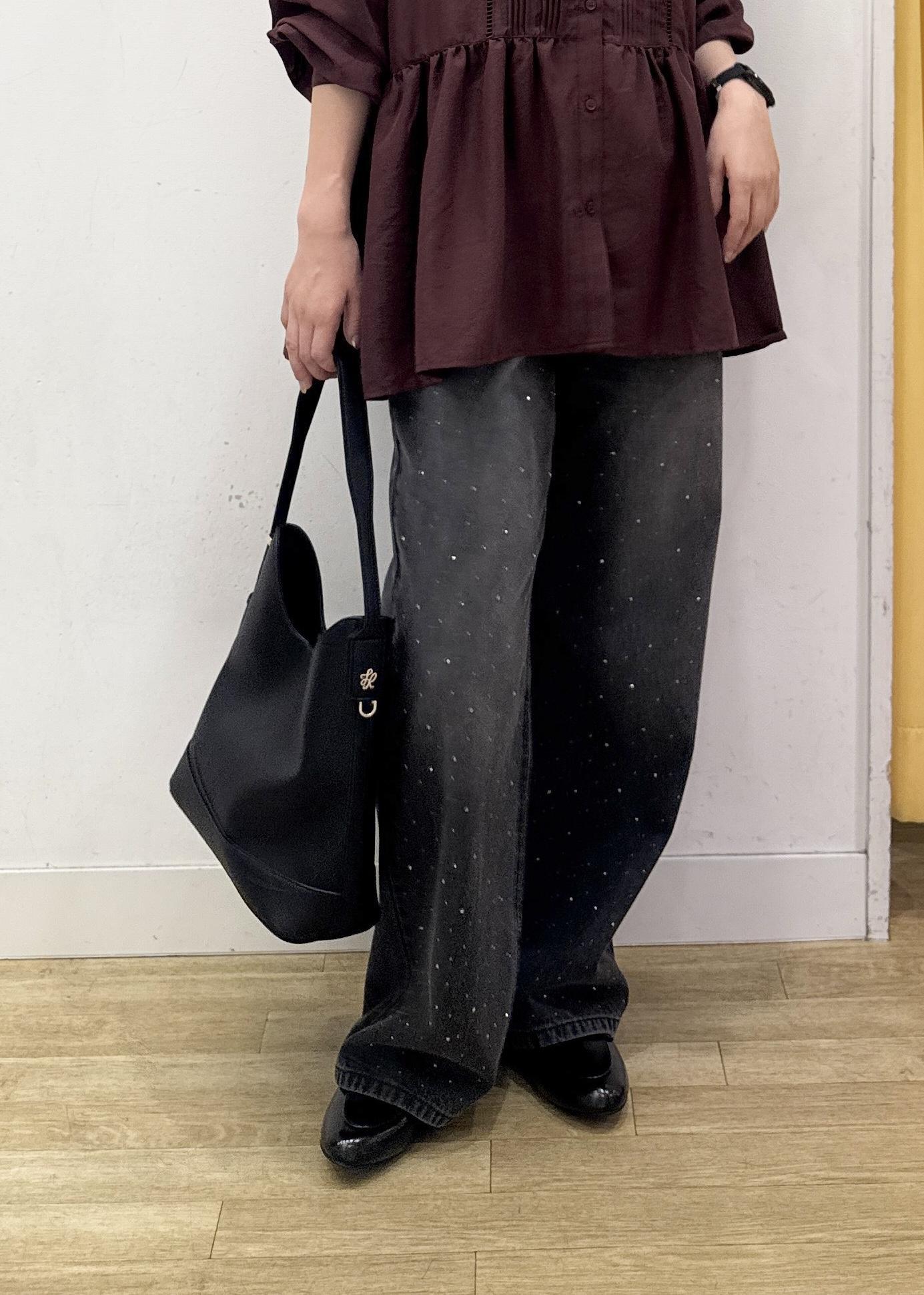 脚のラインは拾わないワイドシルエットで、カジュアルになりがちなデニムもビジューデザインで華やかに着ていただけます。 -